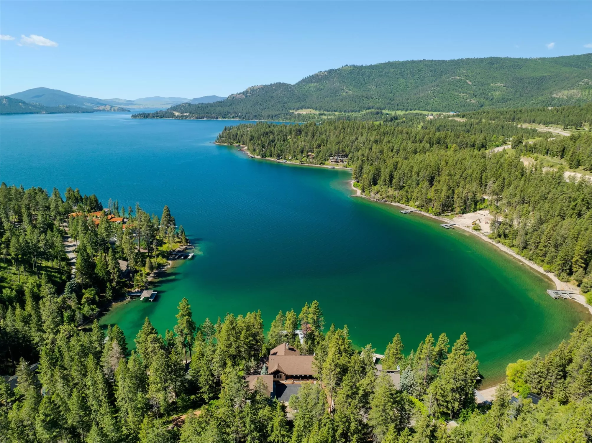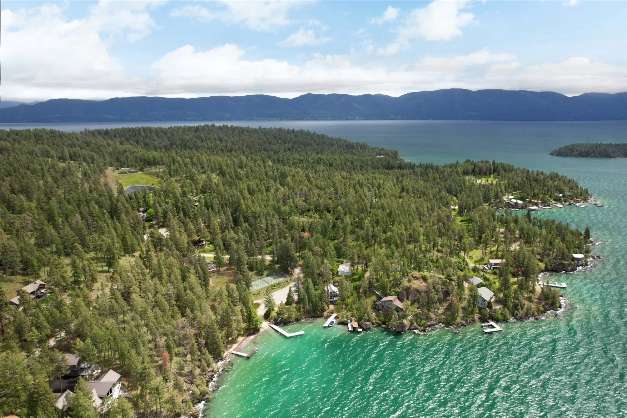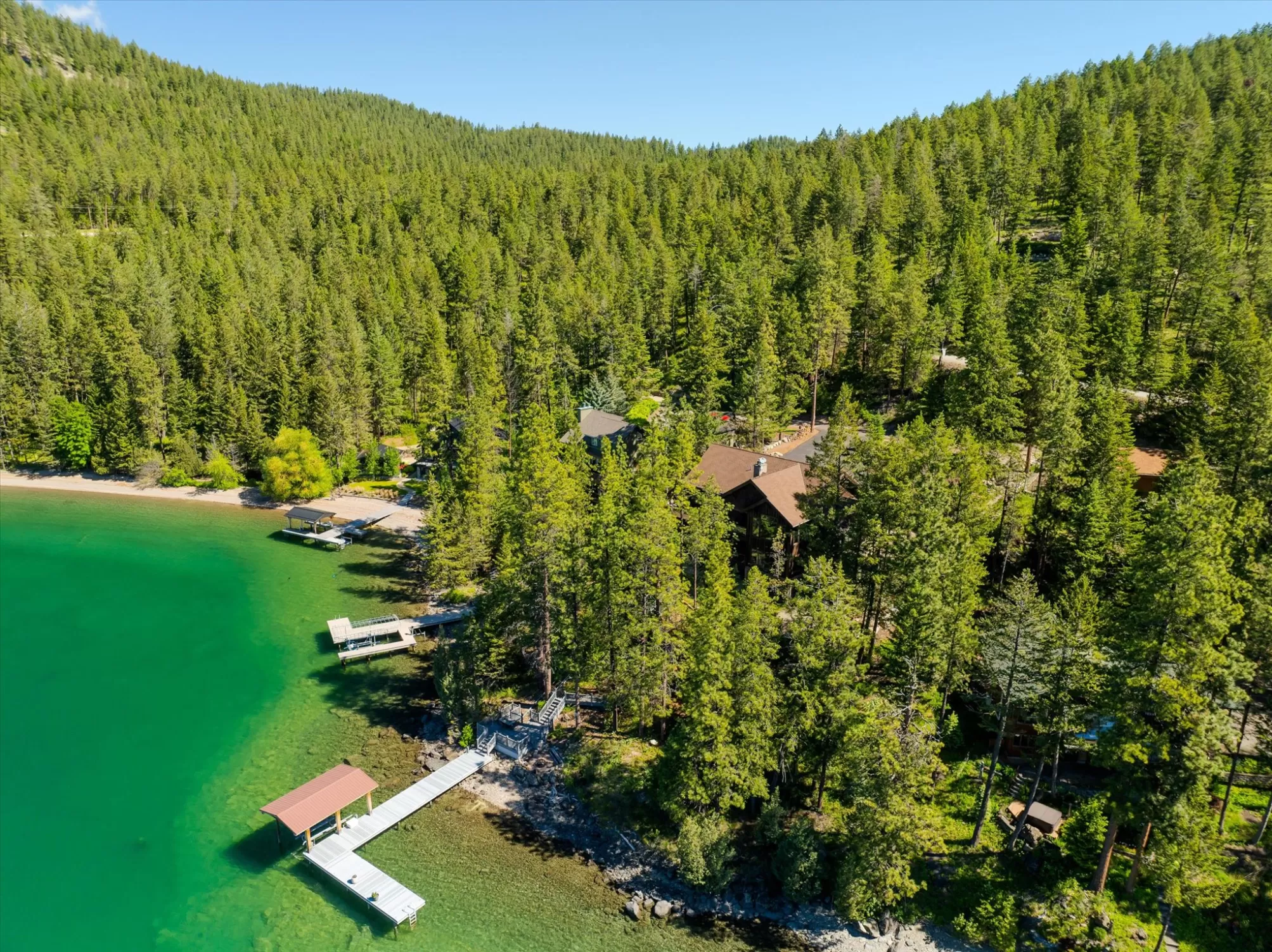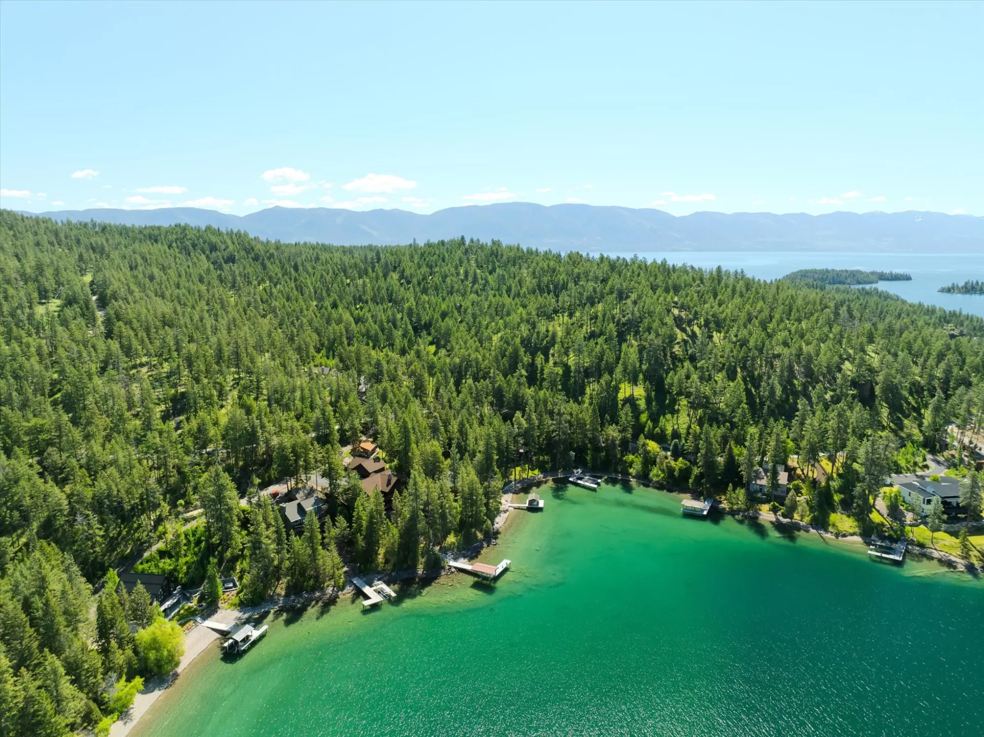 Indulge in the ultimate retreat with this breathtaking custom waterfront home only 2 miles south of Lakeside in the coveted Shelter Bay Estates, where luxury meets nature. Spanning an impressive 4,668 square feet, this exquisite residence boasts 3 bedrooms and 5 bathrooms, all designed with meticulous attention to detail. Revel in 151 feet of pristine Flathead Lake frontage and soak in amazing lake views from one of three expansive decks. This rare gem offers unparalleled privacy and includes high-end amenities such as radiant floor heating, an elevator, a dock with a covered boat lift, multiple garages, a tram, and two full kitchens perfect for entertaining. With four fireplaces and a hot tub for relaxation under the stars, this remarkable home is truly a sanctuary. This home is located in the heart of Dewey’s Bay, one of the most private and protected bays on Flathead Lake, making this exceptional property perfect for discerning buyers seeking both tranquility and sophistication.