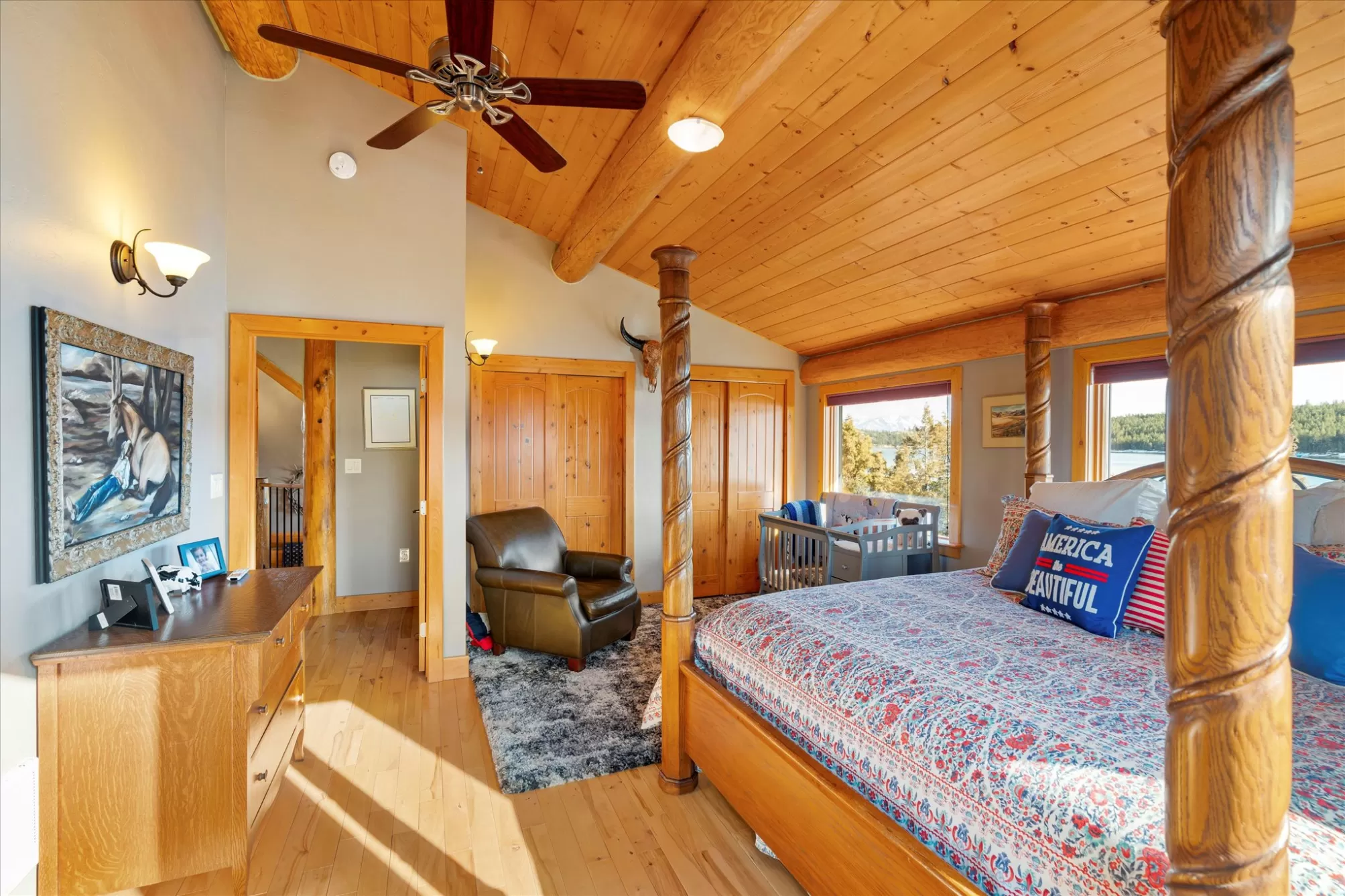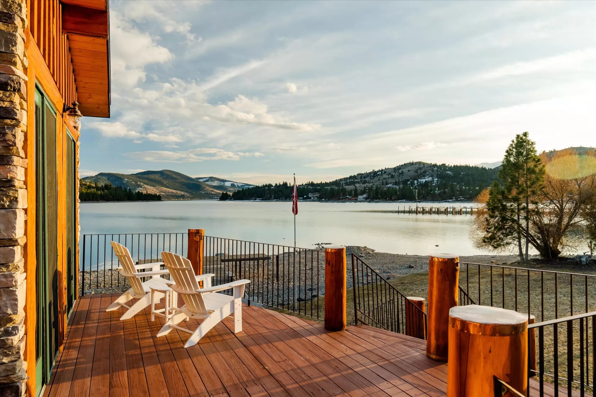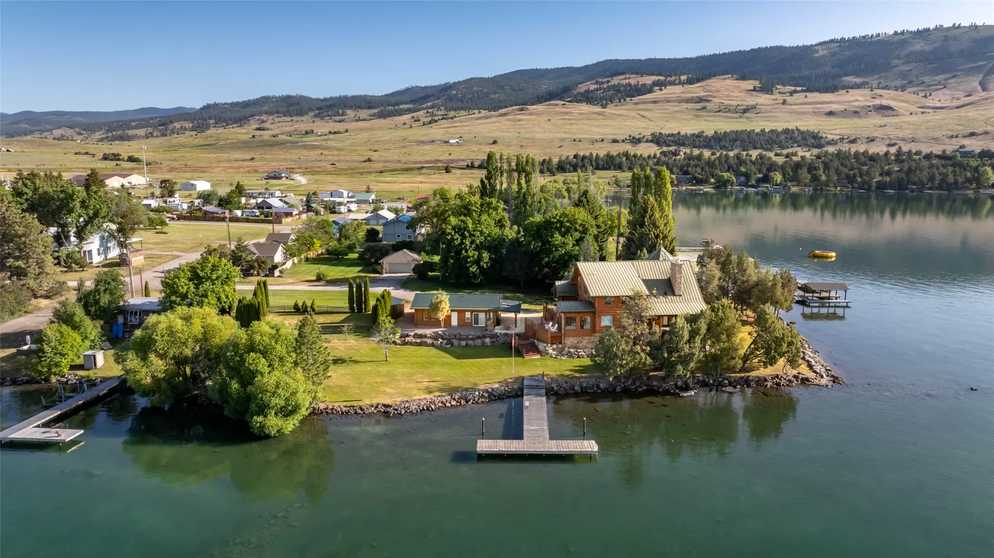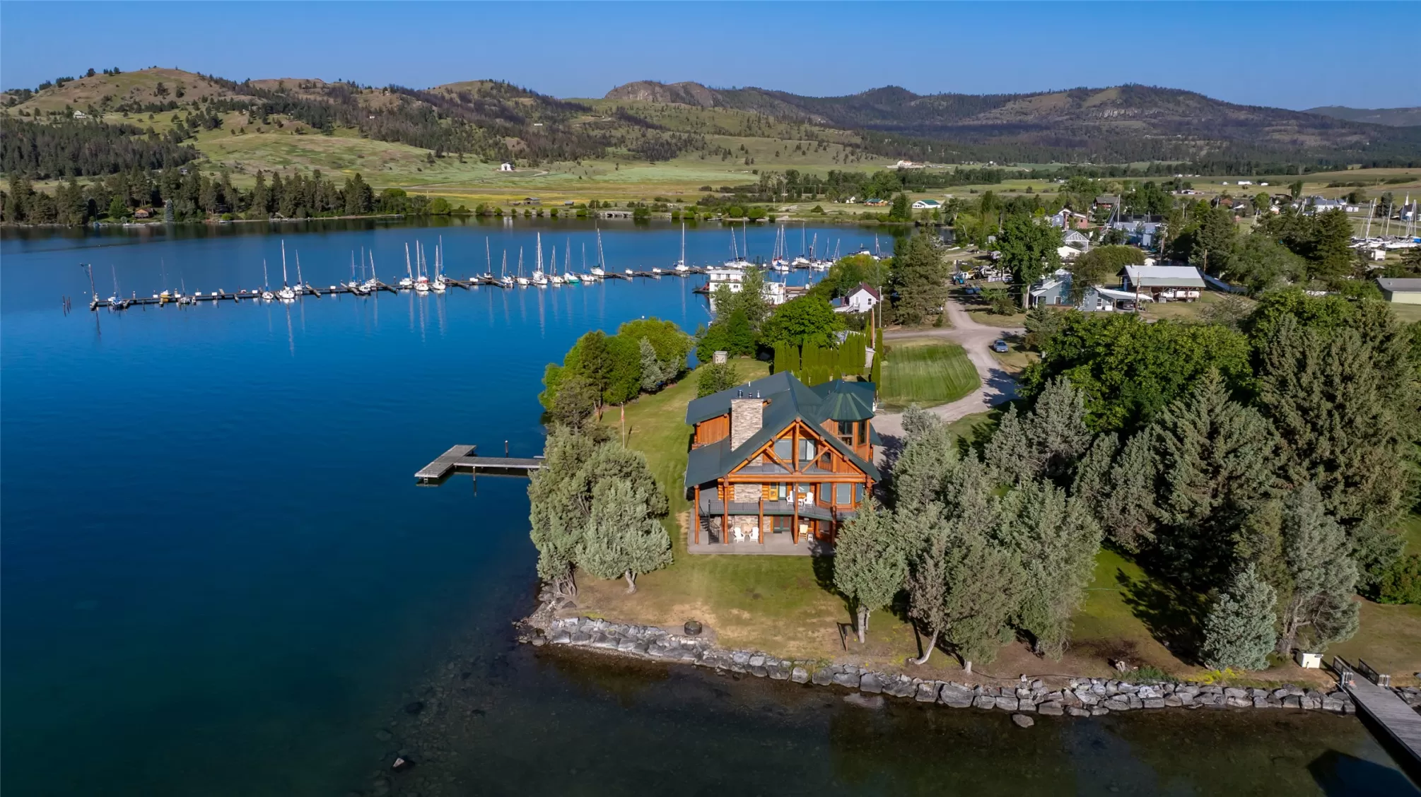 Priced reduced below $430/Sq. Ft. for this Luxury Waterfront Masterpiece including guest cottage and a private dock. Welcome to "The Lake House at Dayton Point, Flathead Lake, MT". This iconic landmark property sits on a point with captivating views of nearby Mission Mountains, Wild Horse Island, Cromwell Island and more. The Dayton Yacht harbor is two blocks away and public boat launch is a just a few hundred feet away. This Lake House was custom built by high end craftsmen in 2007 and has as approximately 5,300 Sq. Ft. of stunning interior space + guest cottage. Impressive artisan wood, stone, tile and metal work throughout, leading outward to expansive patios and covered balconies where Montana's natural beauty can be experienced. The gourmet chef's kitchen is well equipped with high end appliances, elegant design, tremendous storage and beautiful counter space for cooking and entertaining with views all around. The main level master bedroom suite is well designed and offers beautiful corner views of the mountains and lake with two direct patio access points, one on each side. Within the master suite is a private bathroom with soaking tub, walk in shower, double vanity sinks, cabinet, closet space and more. A huge bonus feature is the large hot tub room that can be accessed via inside the master suite or by unlocked doors from one of the patios. There are additional large bedrooms with spacious well appointed bathrooms on the lower and upper levels. A bunkroom and stunning atrium on the upper level leads to a cupola with tremendous design work and spectacular elevated views. Included with this property is a guest Cottage with an attached two car garage. This convenient ground level studio apartment features a nice sleeping area, kitchen and full bathroom. The main front door is greeted under a nice covered patio while a sliding door in the other direction provides access towards the lake. The back of the main home on ground level is the large entertaining game room with walkout patio and another beautiful stone fireplace. The level grounds outside allow for comfortable relaxation and fun play areas. The private dock could be expanded allowing one to accommodate different boats and water toys. No HOA. No Restrictive Covenants. This property is well taken care of and is ready to welcome a ready to go buyer wanting a luxury experience with convenient access to world class outdoor recreation in all 4 seasons at a fraction of the cost of others.
