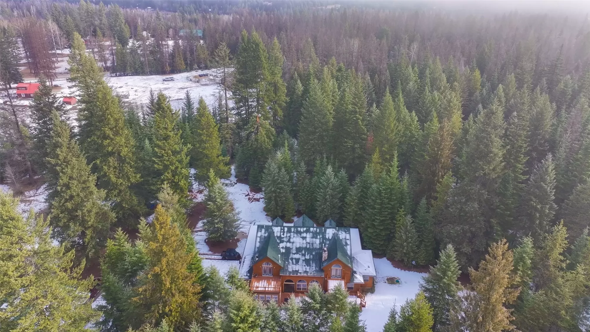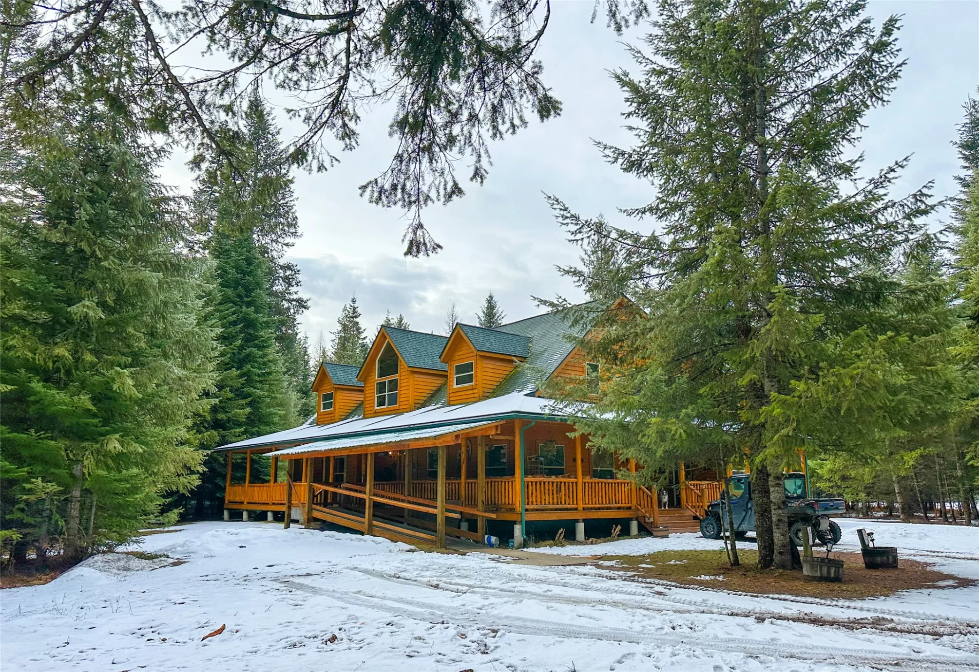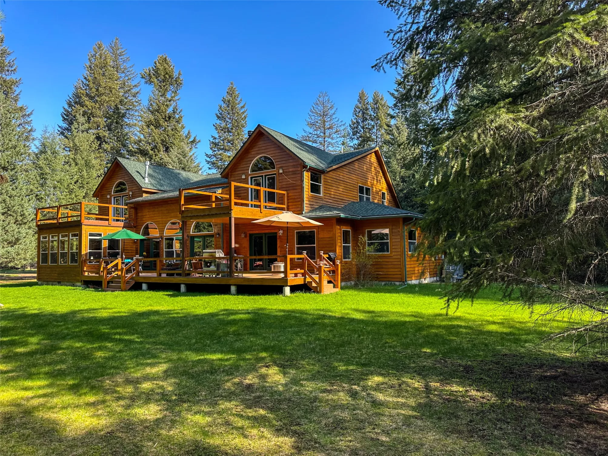 Meadows and Mountains Ranch boasts a beautiful custom, four-bedroom, 5,066-square-foot home with a chef’s kitchen, corner office with windows, spectacular log staircase, four master suites, and lovely covered decks. The main floor has everything you need: a craftsman floor-to-ceiling fireplaces, a tongue-and-groove vaulted pine ceiling, and oversized Anderson clad windows that evoke the sense of living with nature. A lovely dining room is situated off of the kitchen and the master suite is located on the main floor with a jetted corner spa bath with a view. Generous master includes a three-quarter bath on the main floor. Dual master suites with three-quarter baths upstairs, complete with their own decks. A sitting area catwalk upstairs. The home & three-bay shop sit on 19 acres as well as the little 1927 guest quarters. That gorgeous mix of pasture and timber with privacy with an open feel. Plenty of room for our four-legged friends to roam. Close to the quaint town of Noxon, Montana.