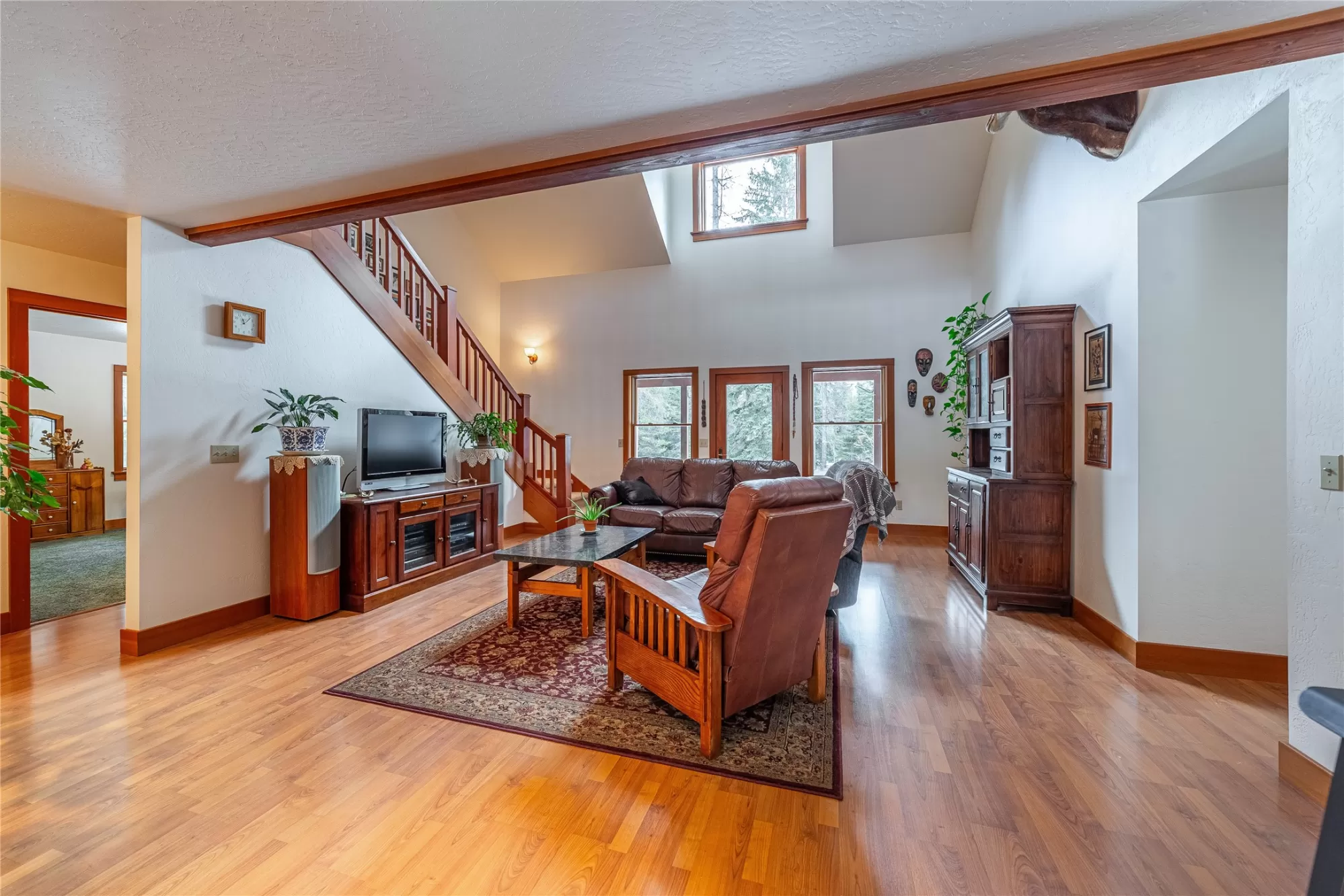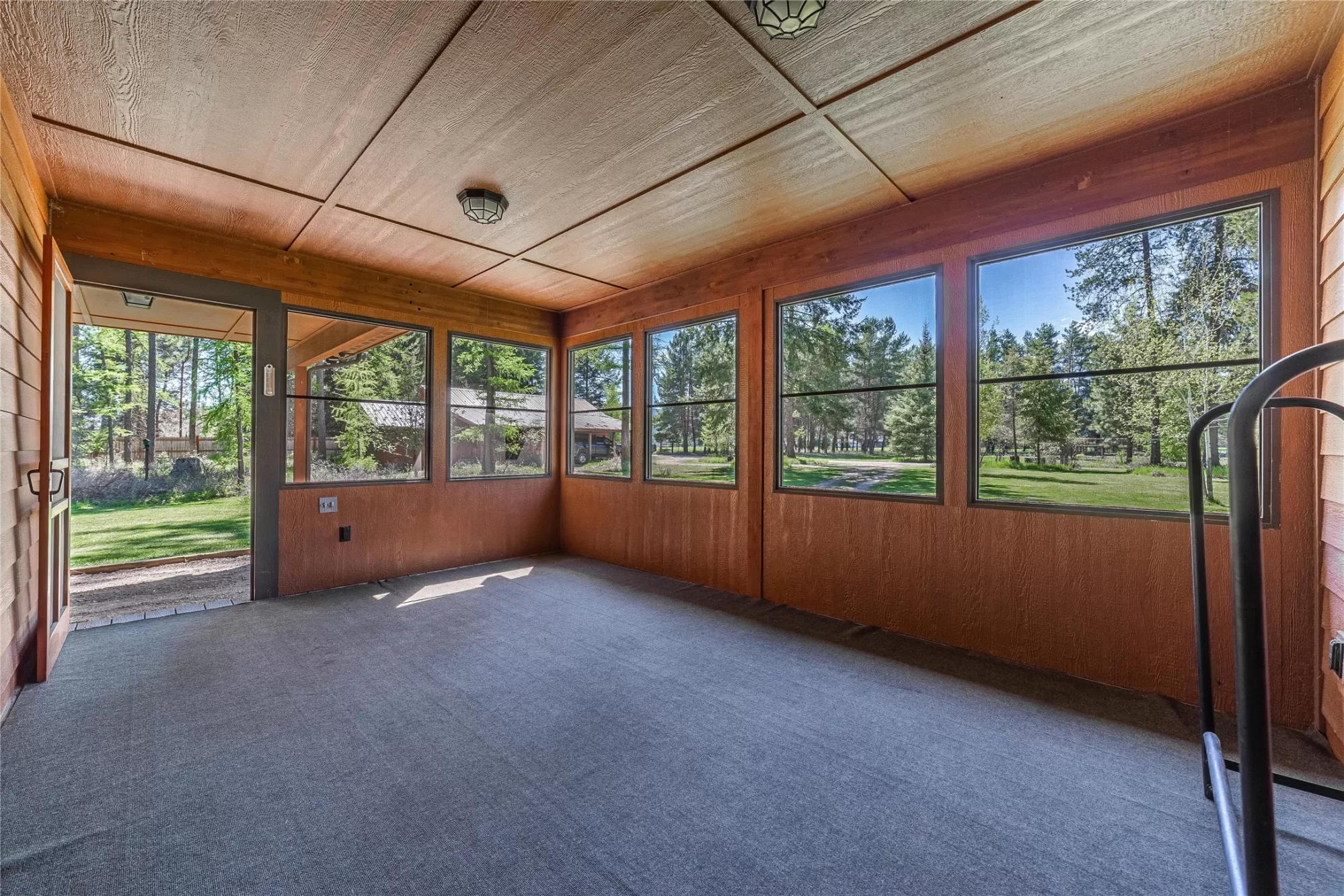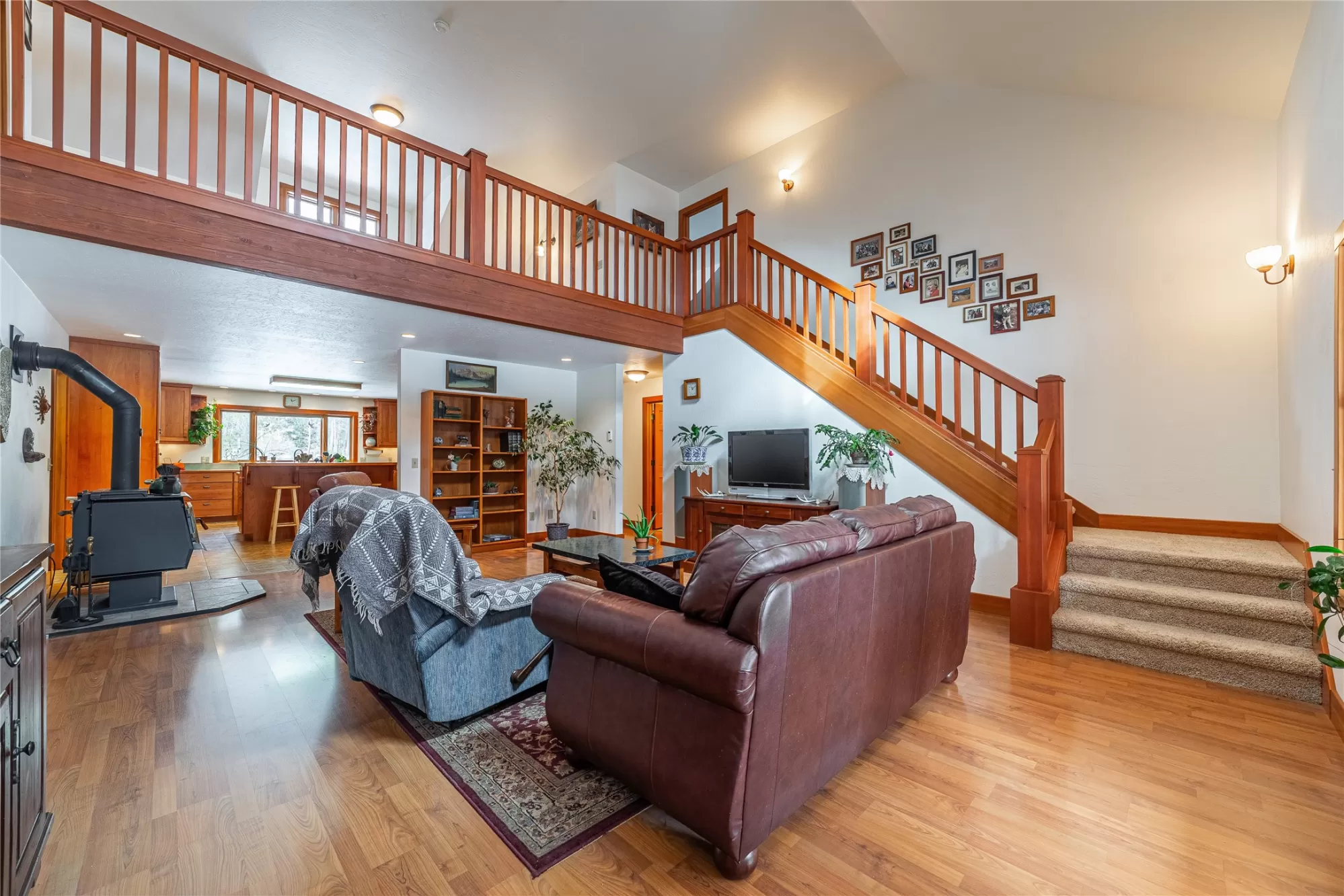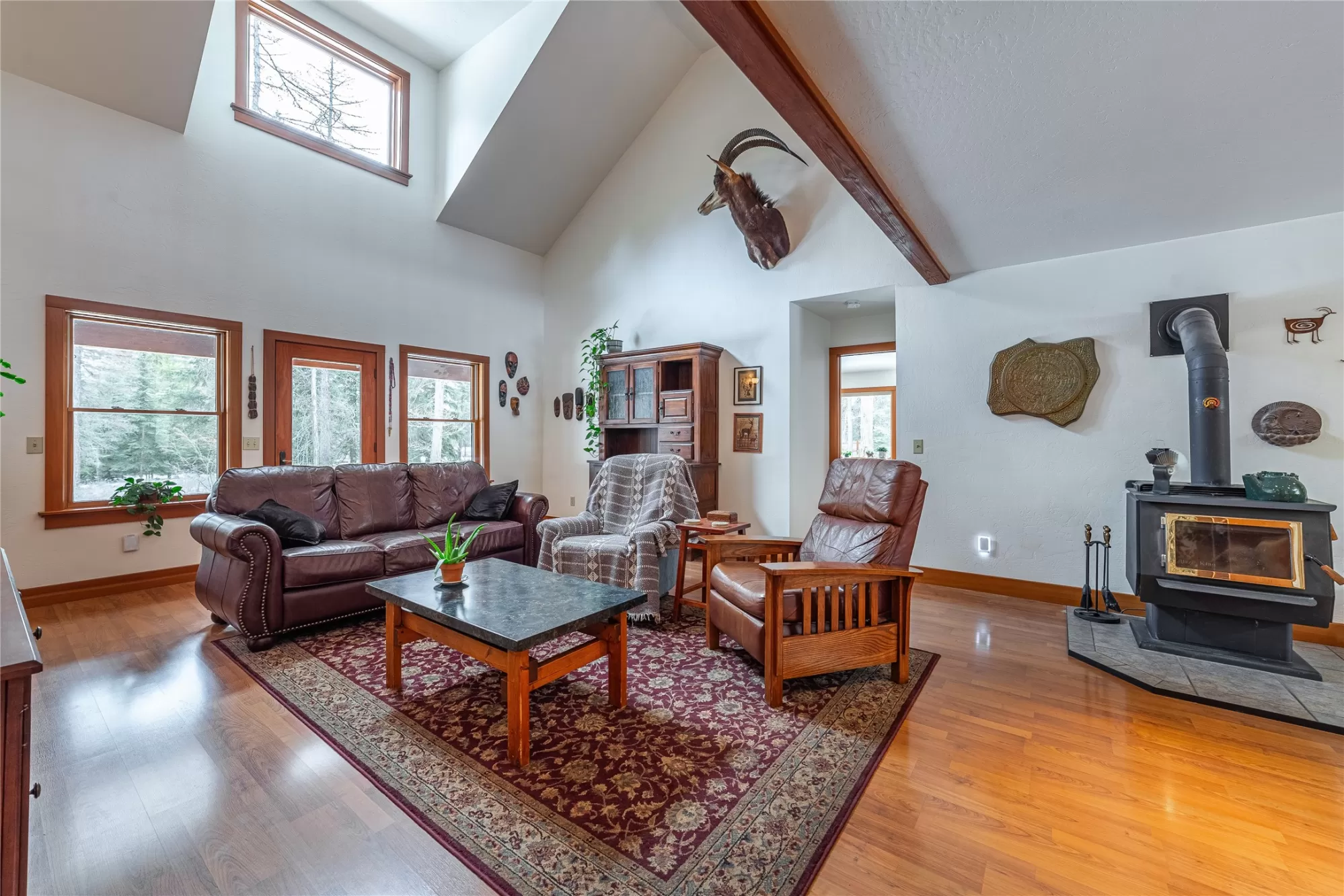 Ready-made Montana living on this private enchanted 20+ acres! This awe-inspiring property is a canvas of mature larch trees, meadows, productive alfalfa/timothy hayfield, fenced garden w/ greenhouse, & Stillwater River frontage, only 15 minutes from the vibrant ski & summer resort town of Whitefish. This lovingly maintained 4,000+/- home features a sizable kitchen with custom cabinets, living room with cathedral ceiling and impressive staircase, and main-floor ensuite master and second large bedroom. An additional bedroom, large bonus room, and open loft sit on the second level. The full basement has its own walk-up exit and pool table. The detached heated 24x40 garage includes woodshop, covered parking, and 14x16 addition with a new custom dry sauna. The 24x48 equipment shed has 4 bays with 12' tall entries. The 16x16 barn can hold 4-5 tons of hay and has an attached loafing shed and paddock with heated waterer.
