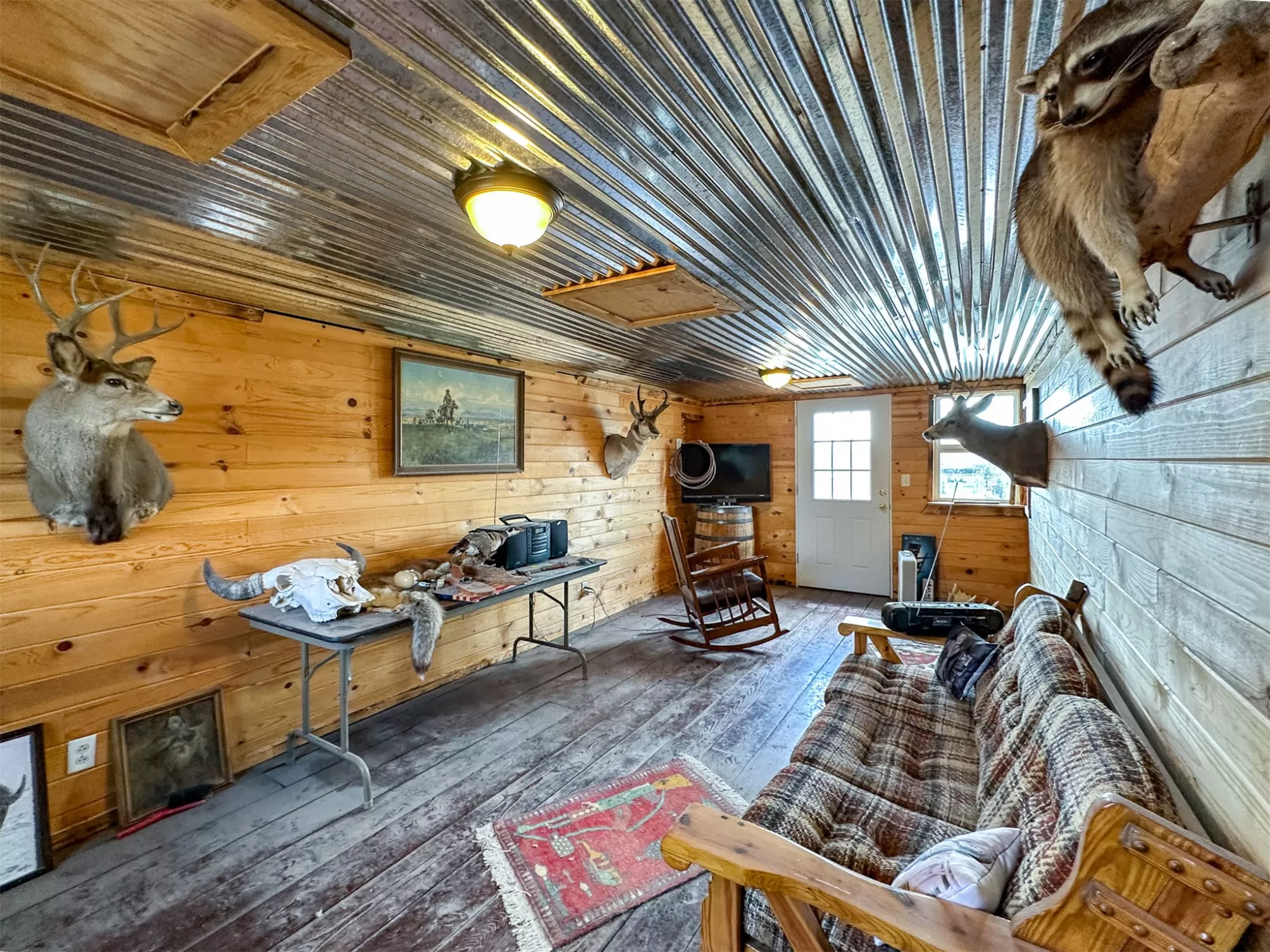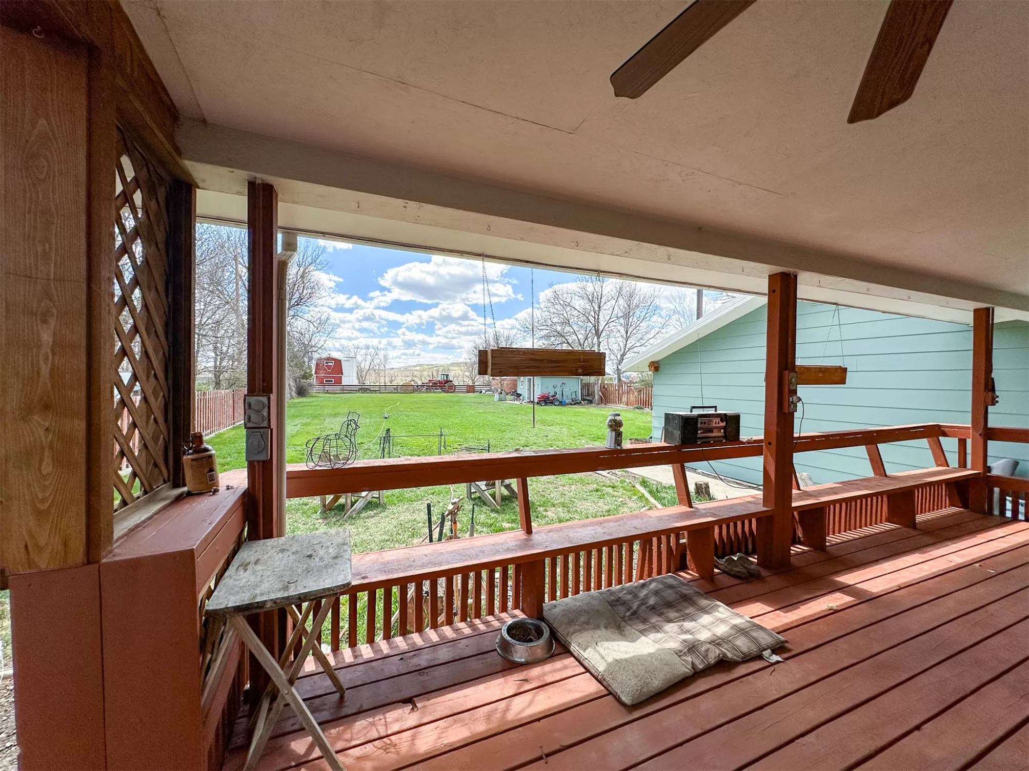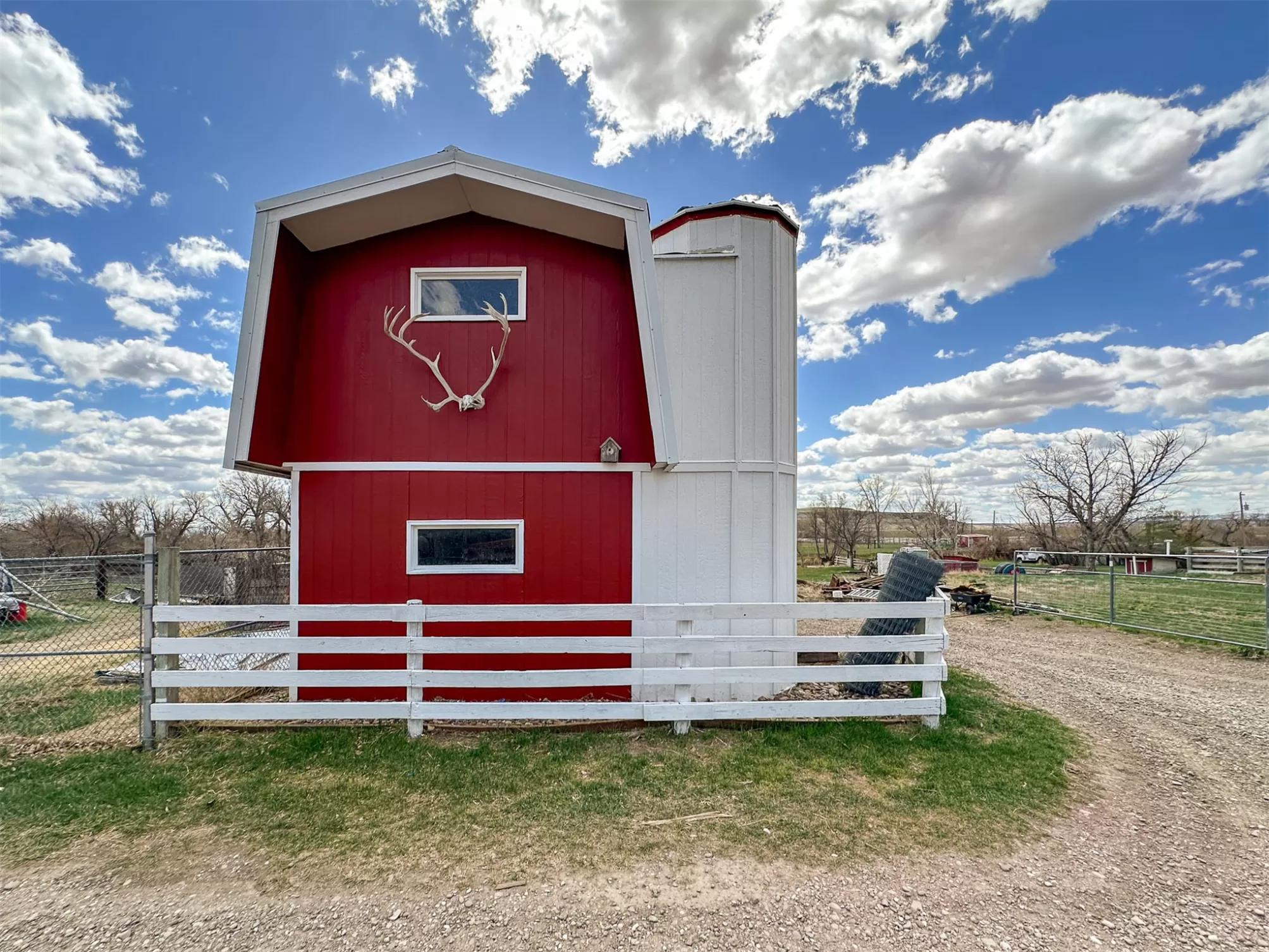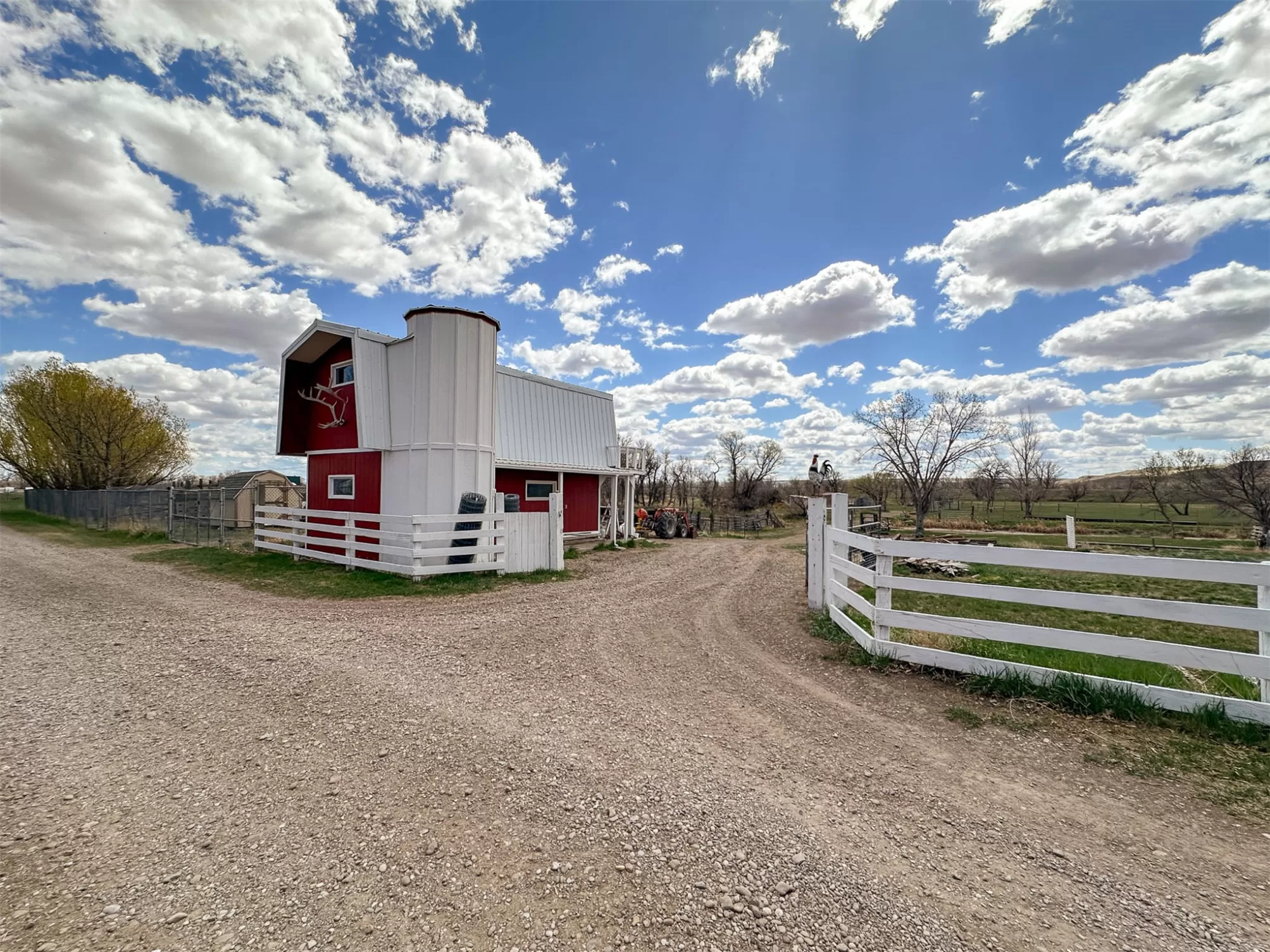Welcome to your new home that is ideal for horses, livestock and even bison! It combines the best of all worlds with an easy and commutable distance to Great Falls and enough property to support your agricultural needs. This listing includes 4 already divided lots, a total of 12.23 acres, with a slough AND it abuts the renowned 406 Arena trails. The 406 attracts horse people from around the world and the trails are in your back yard. Enjoy sturdy fences, since the seller keeps bison on the property now, stunning butte views and a sophisticated stock watering system. The home is a classic ranch style with two bedrooms and a full bath upstairs and a non-egress lower living room, bedroom, and a 3/4 bathroom. On the main level, there is an enormous, and genuine stone, wood-burning fireplace and the living room boasts tongue and groove pine ceilings and walls. City water AND a well, community sewer, natural gas. Enjoy a detached two/car garage, a shed and a barn-inspired "person cave,” that has an upstairs with a deck and a main floor space that could be converted to corrals or retained as additional storage. Metal roofs; steel siding. Original hardwood floors on the upper level. Gas stove in lower level. You'll love the big, covered deck off the kitchen, with views. Grass lawn around the house. Bay window in the kitchen.