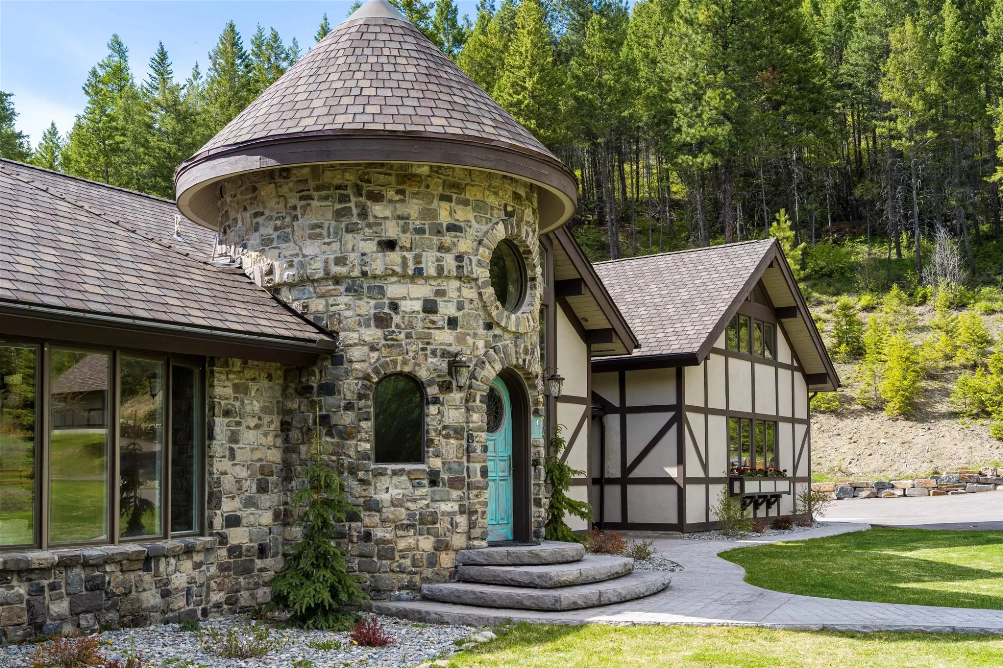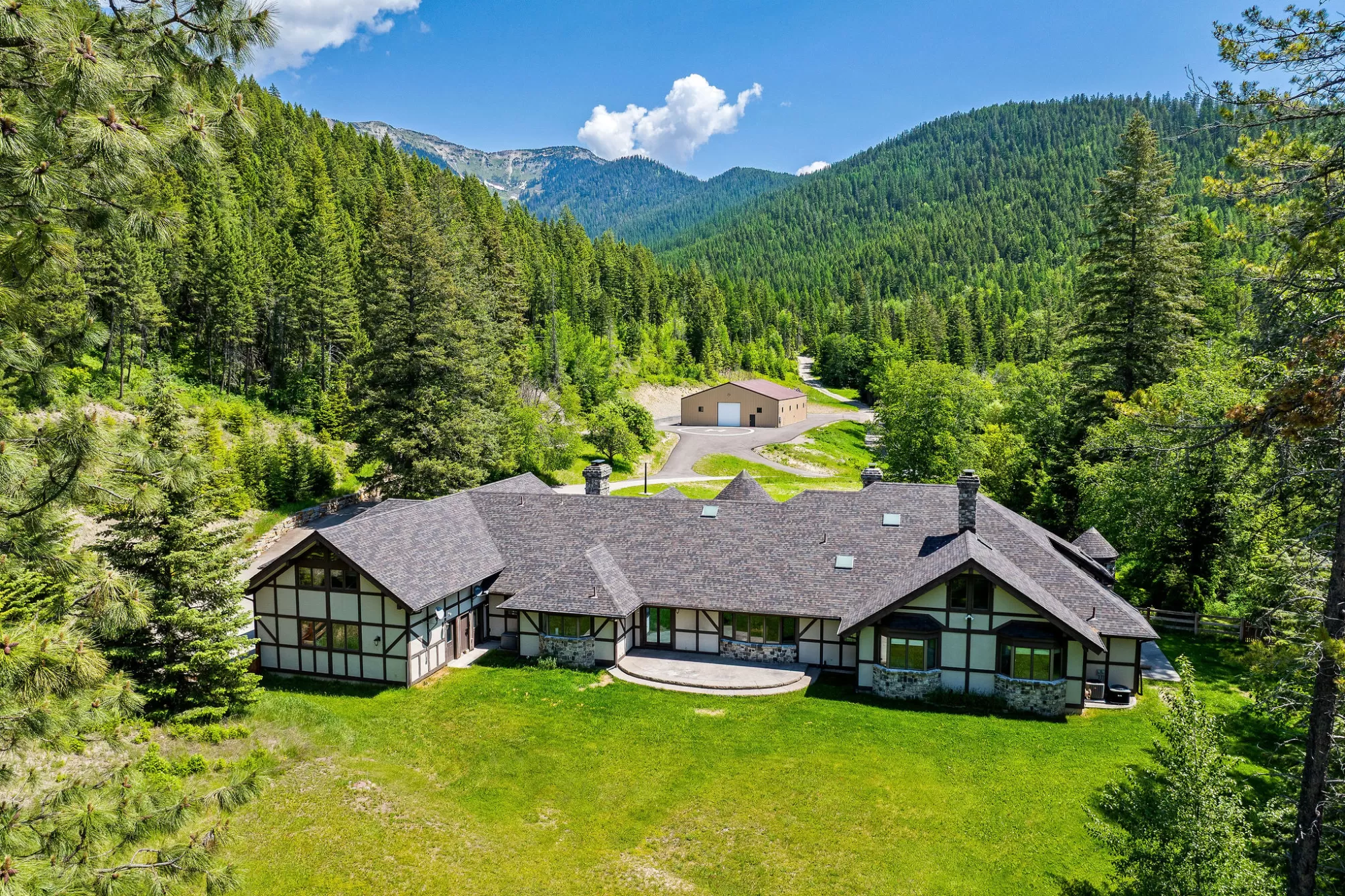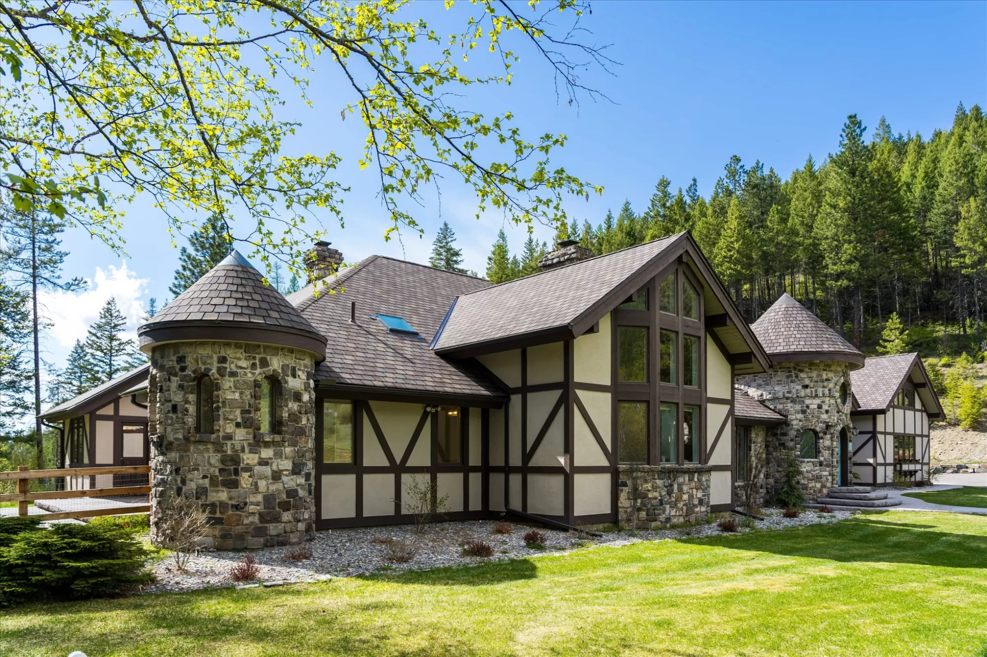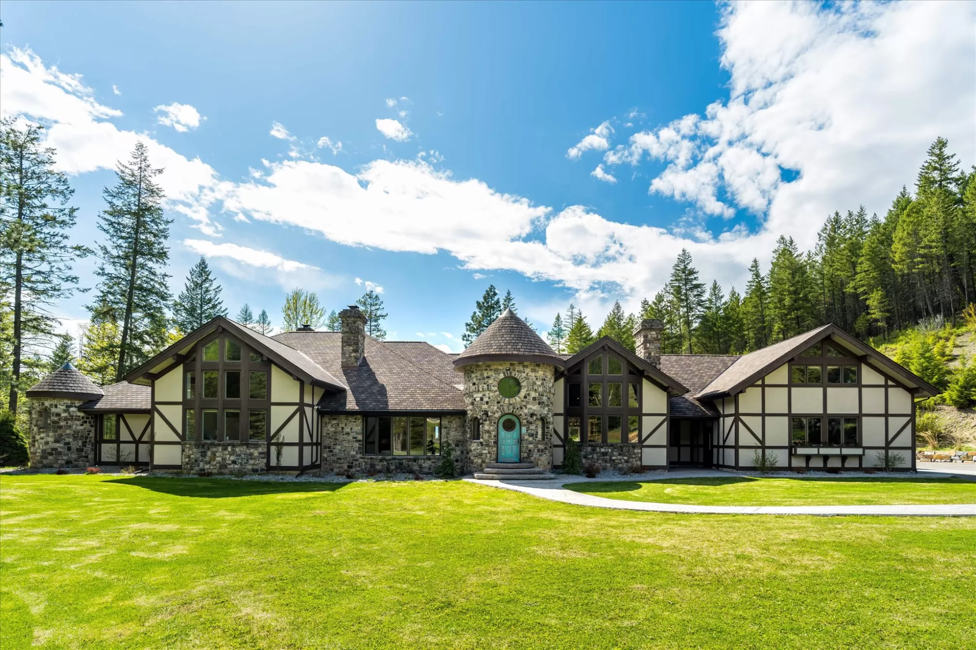 Storybook European-Style Estate on 21+ Acres with a 2-bedroom Guesthouse & 60' x 80' Shop. Step into a fairytale with this enchanting European-inspired estate, nestled on 21.32 private acres at the base of the Swan Mountain Range. Enjoy lush forest & the gentle sounds of Brown Creek, the scenic drive opens to captivating valley views & timeless Tudor-style architecture. Stone accents & expansive windows define the home’s exterior, while the interior is bathed in natural light & filled with old-world charm. A grand turret entry introduces the formal living & dining rooms, ideal for entertaining or peaceful retreat. The primary suite is a private sanctuary with vaulted ceilings & a spa-like ensuite featuring a one-of-a-kind shower in the home’s second turret. Additional features include a spacious kitchen, warm family room with vaulted ceiling, living room, cozy library, exercise room, a spacious 4 stall garage & large, landscaped area for recreational activities. Guests will enjoy the private guesthouse, and hobbyists or collectors will appreciate the spacious 80'x60' shop. This is a truly special Montana property—offering privacy, beauty, and a lifestyle to be cherished for generations