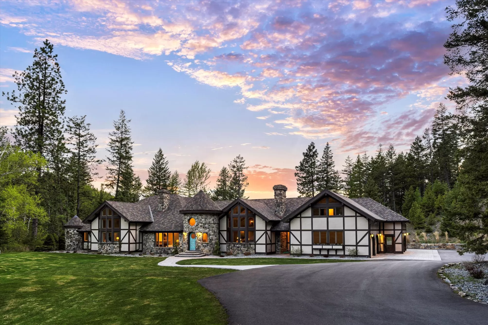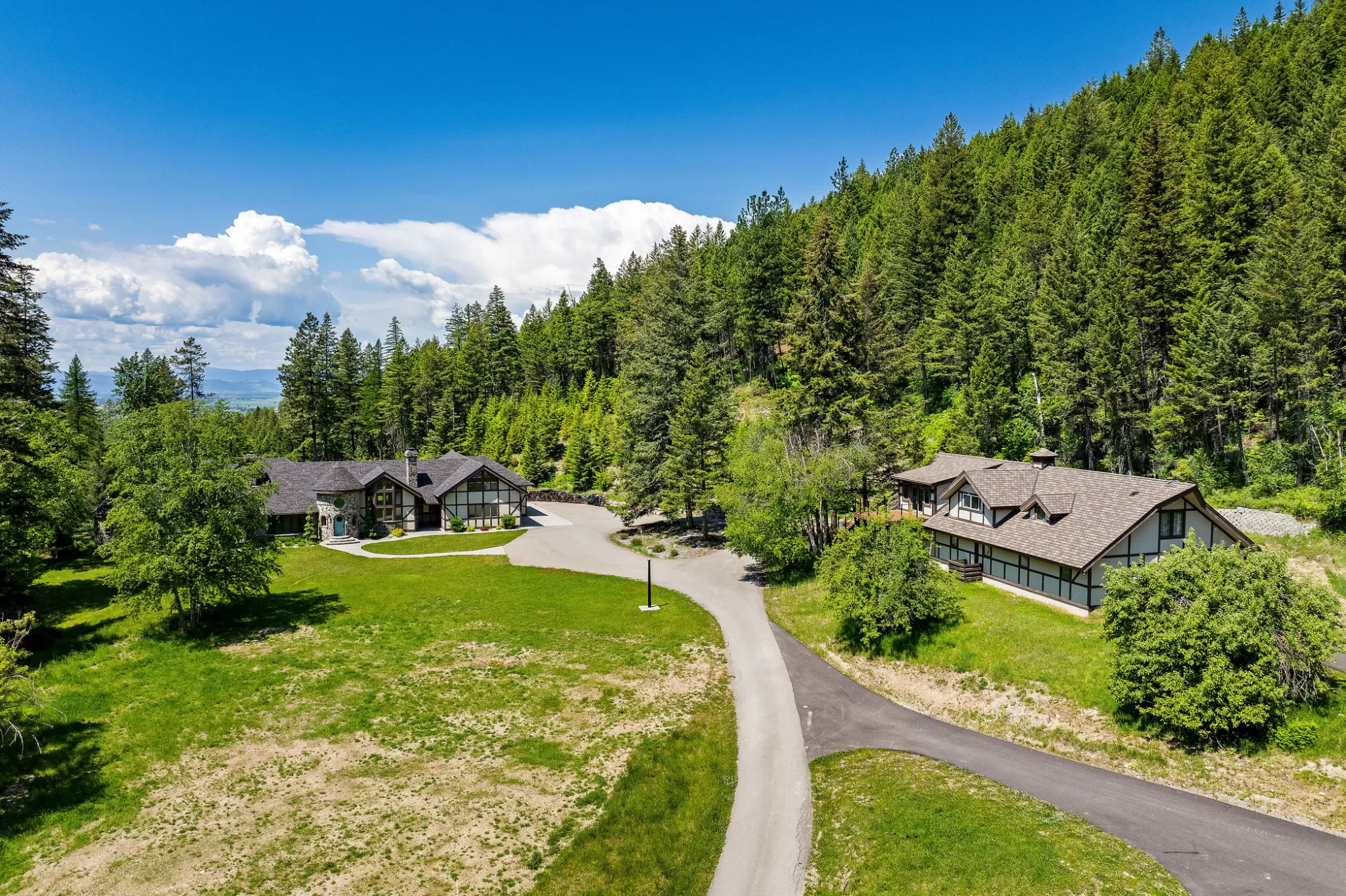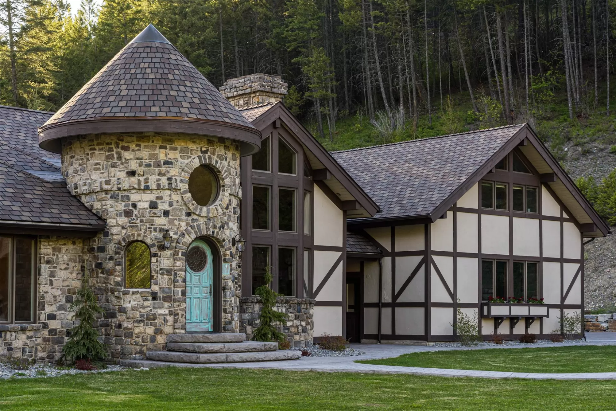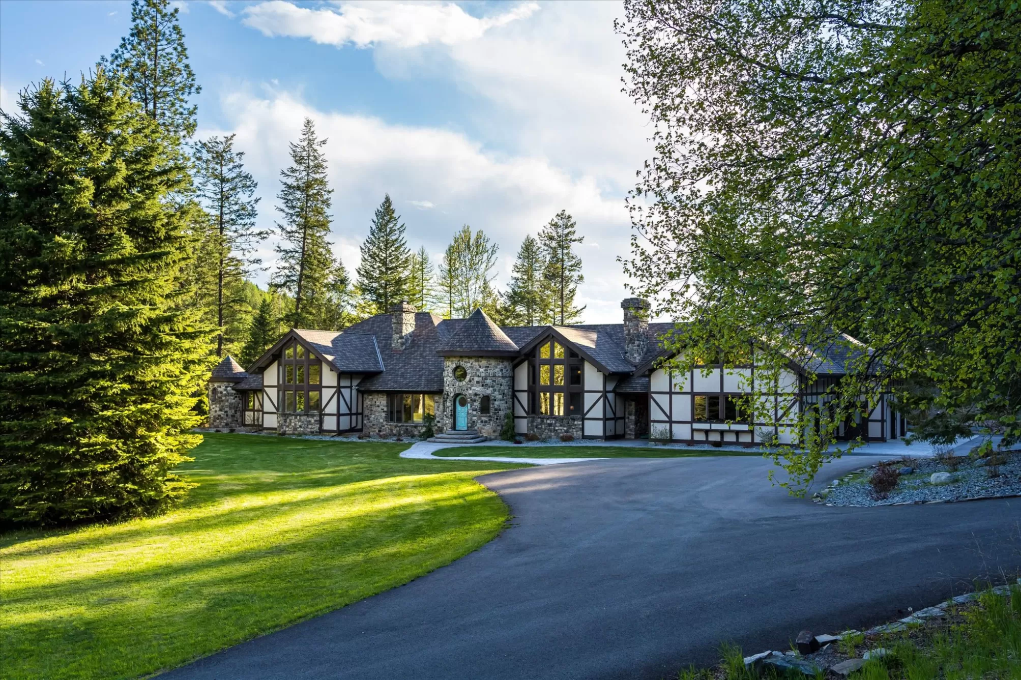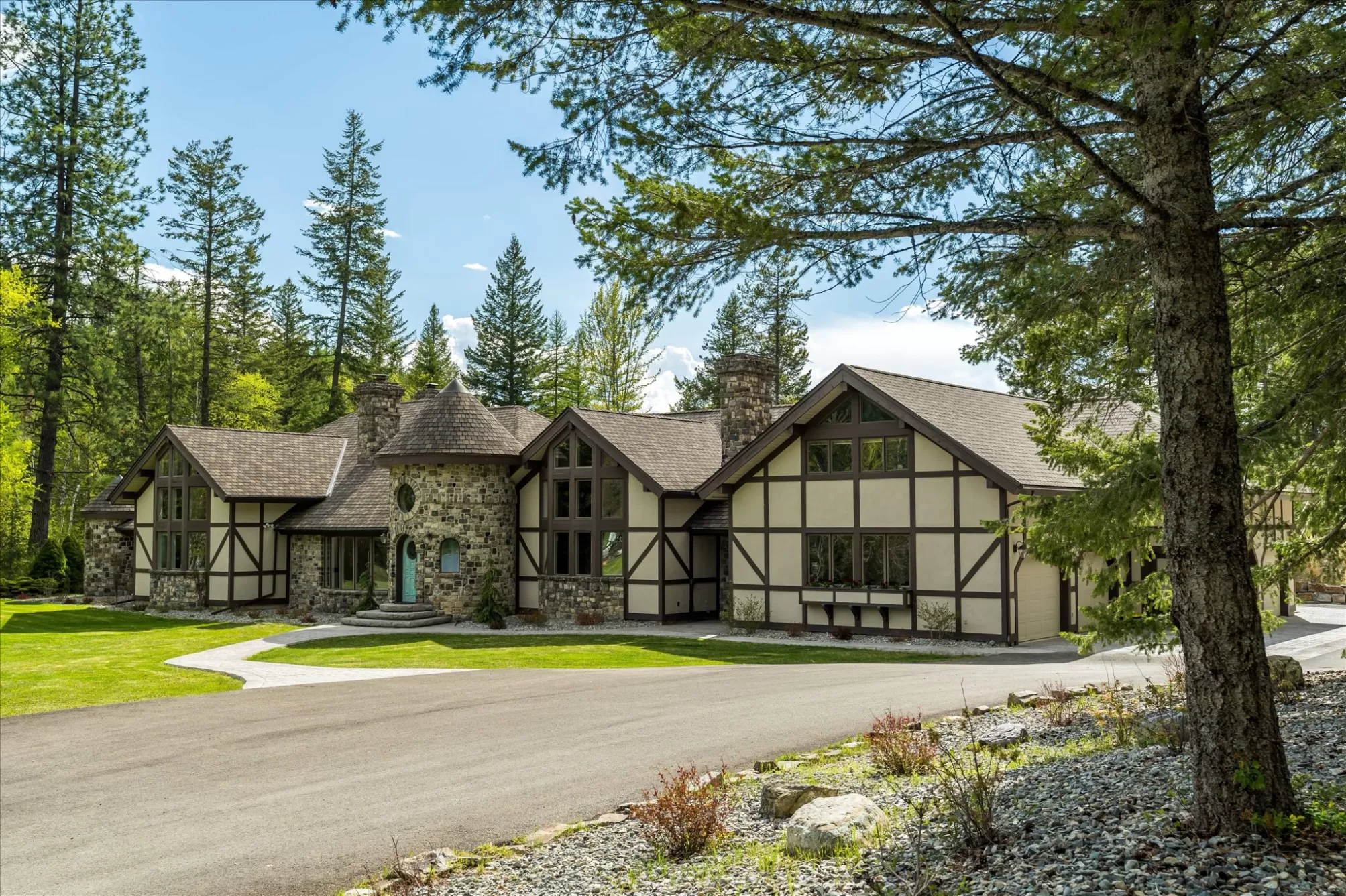 Storybook European-Style Estate on 21+ Acres with a 2-bedroom Guesthouse & 60' x 80' Shop. Step into a fairytale with this enchanting European-inspired estate, nestled on 21.32 private acres at the base of the Swan Mountain Range. Enjoy lush forest & the gentle sounds of Brown Creek, the scenic drive opens to captivating valley views & timeless Tudor-style architecture. Stone accents & expansive windows define the home’s exterior, while the interior is bathed in natural light & filled with old-world charm. A grand turret entry introduces the formal living & dining rooms, ideal for entertaining or peaceful retreat. The primary suite is a private sanctuary with vaulted ceilings & a spa-like ensuite featuring a one-of-a-kind shower in the home’s second turret. Additional features include a spacious kitchen, warm family room with vaulted ceiling, living room, cozy library, exercise room, a spacious 4 stall garage & large, landscaped area for recreational activities. Guests will enjoy the private guesthouse, and hobbyists or collectors will appreciate the spacious 80'x60' shop. This is a truly special Montana property—offering privacy, beauty, and a lifestyle to be cherished for generations