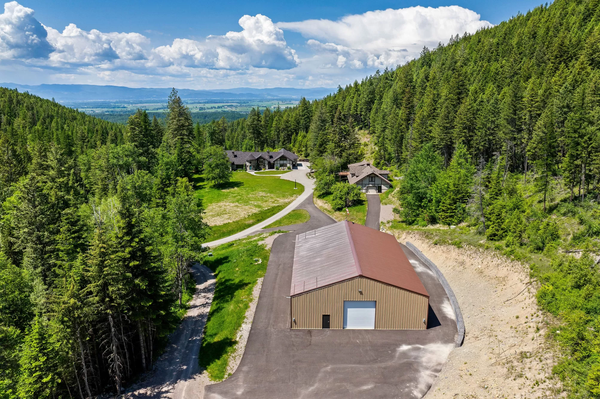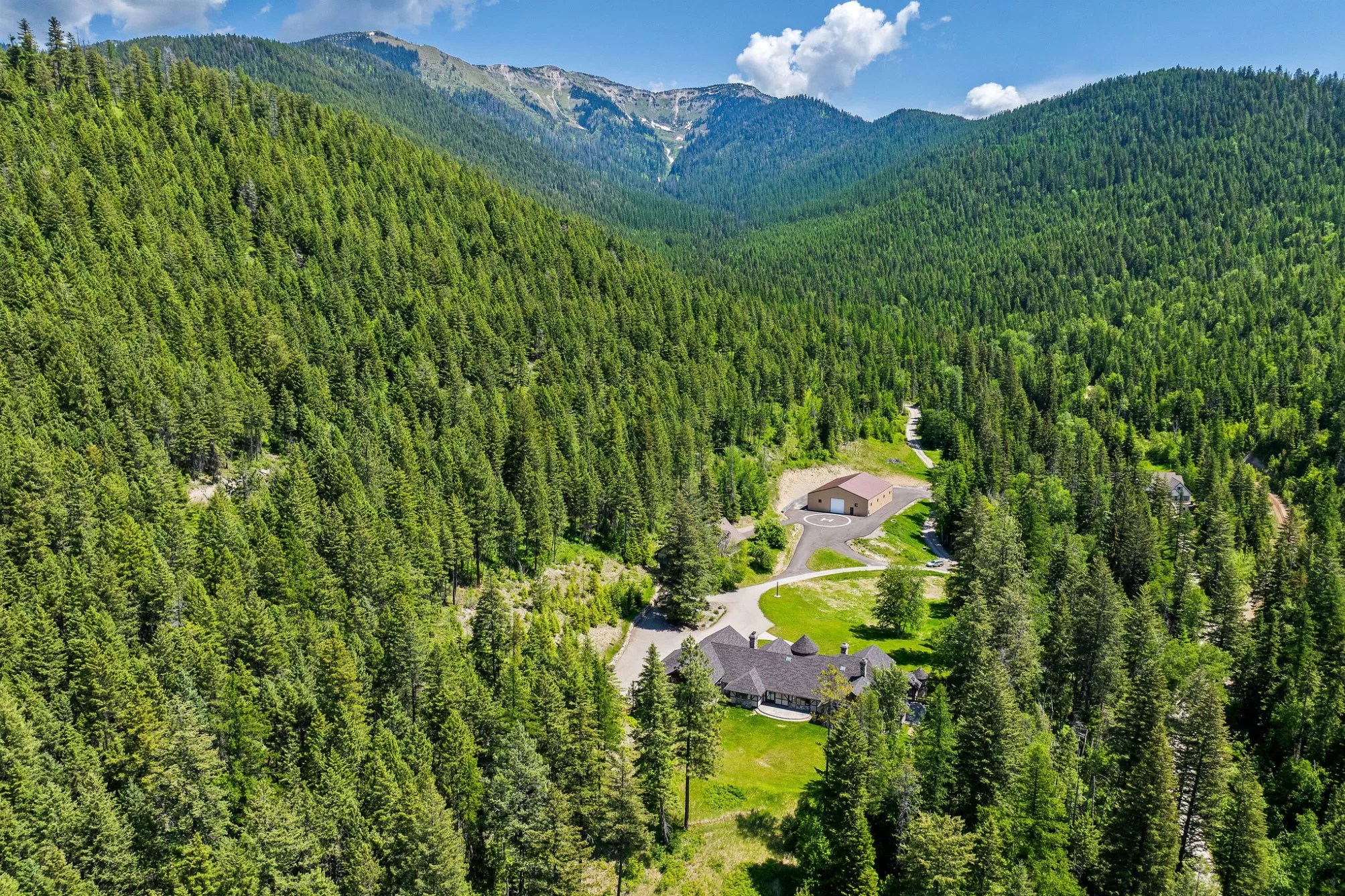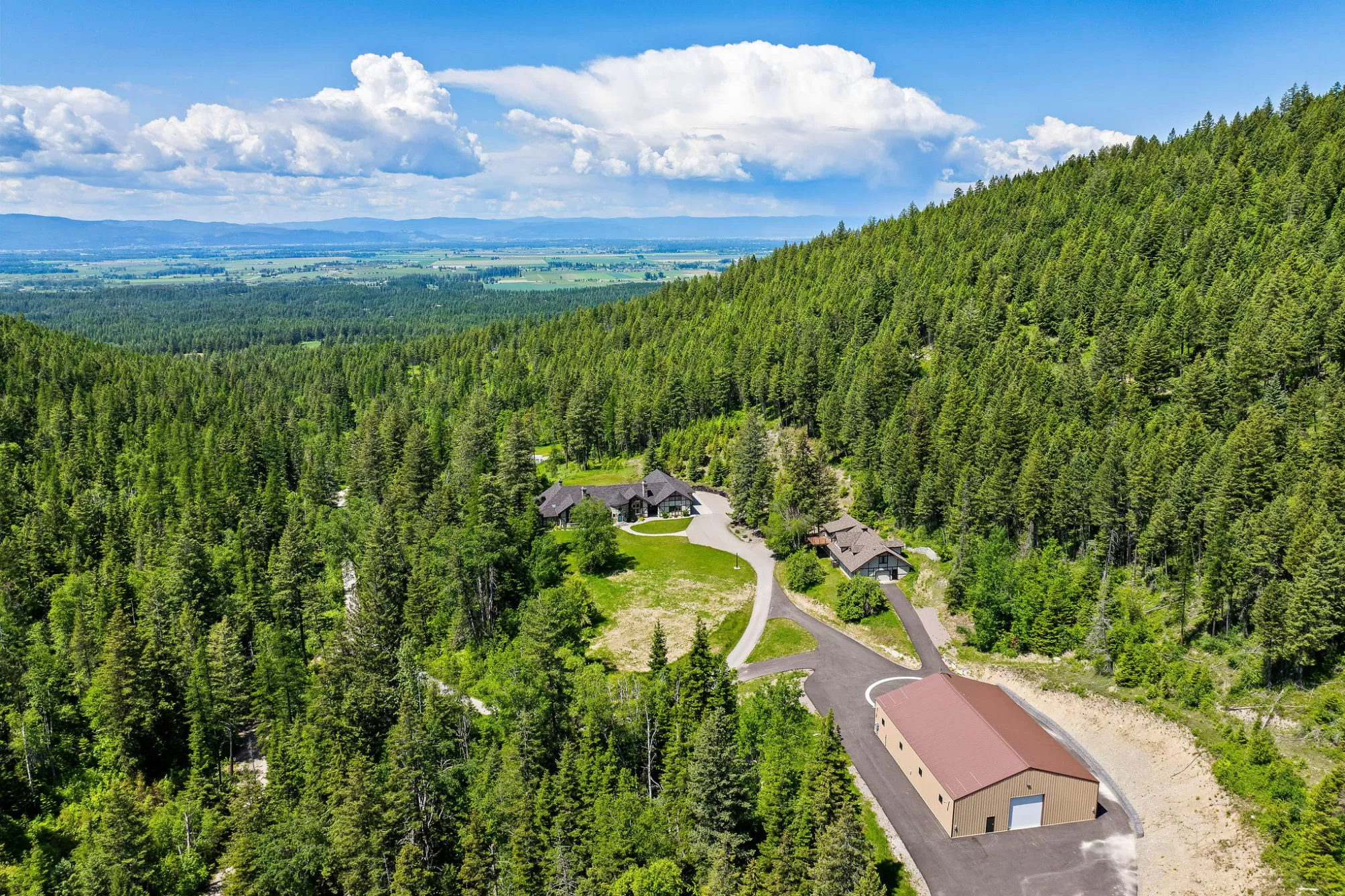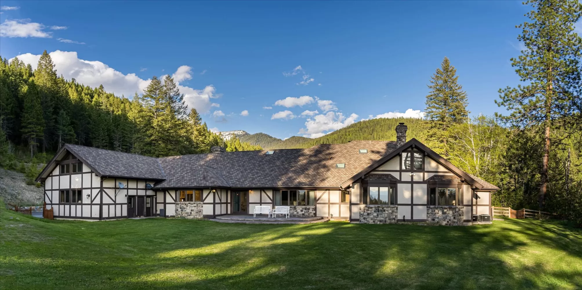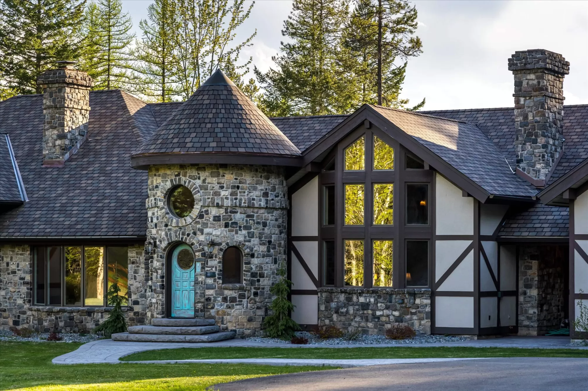 Storybook European-Style Estate on 21+ Acres with a 2-bedroom Guesthouse & 60' x 80' Shop. Step into a fairytale with this enchanting European-inspired estate, nestled on 21.32 private acres at the base of the Swan Mountain Range. Enjoy lush forest & the gentle sounds of Brown Creek, the scenic drive opens to captivating valley views & timeless Tudor-style architecture. Stone accents & expansive windows define the home’s exterior, while the interior is bathed in natural light & filled with old-world charm. A grand turret entry introduces the formal living & dining rooms, ideal for entertaining or peaceful retreat. The primary suite is a private sanctuary with vaulted ceilings & a spa-like ensuite featuring a one-of-a-kind shower in the home’s second turret. Additional features include a spacious kitchen, warm family room with vaulted ceiling, living room, cozy library, exercise room, a spacious 4 stall garage & large, landscaped area for recreational activities. Guests will enjoy the private guesthouse, and hobbyists or collectors will appreciate the spacious 80'x60' shop. This is a truly special Montana property—offering privacy, beauty, and a lifestyle to be cherished for generations