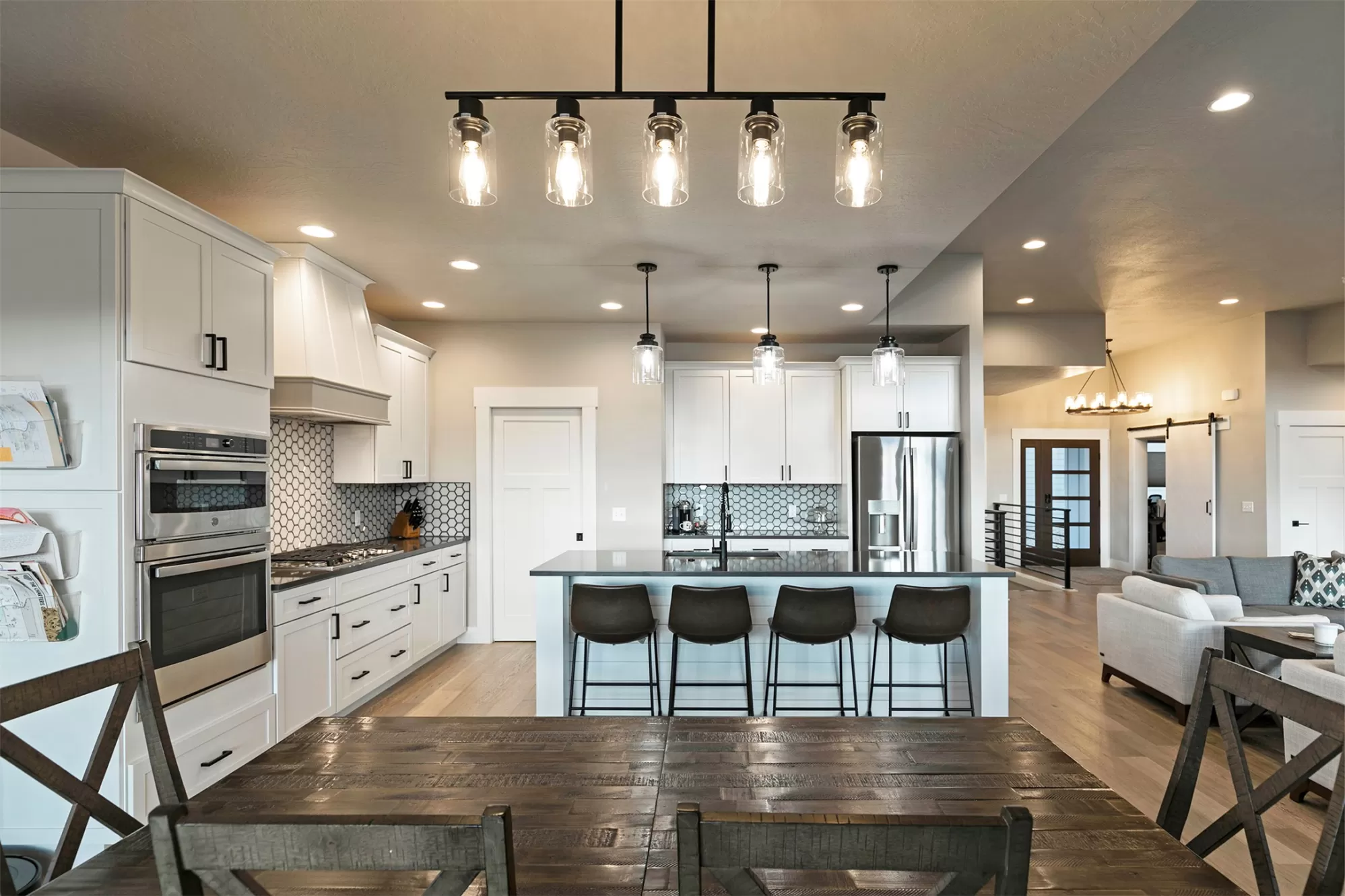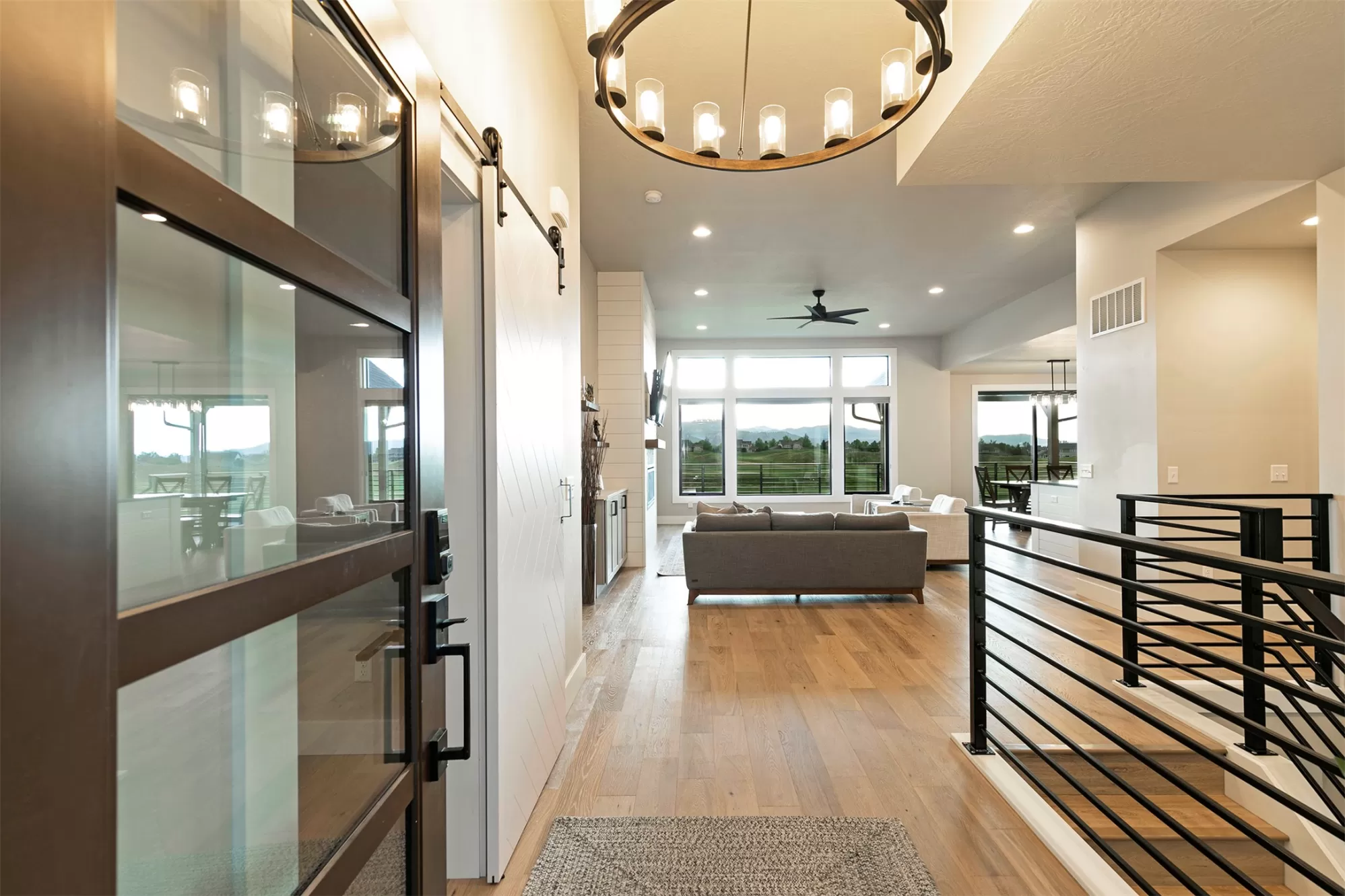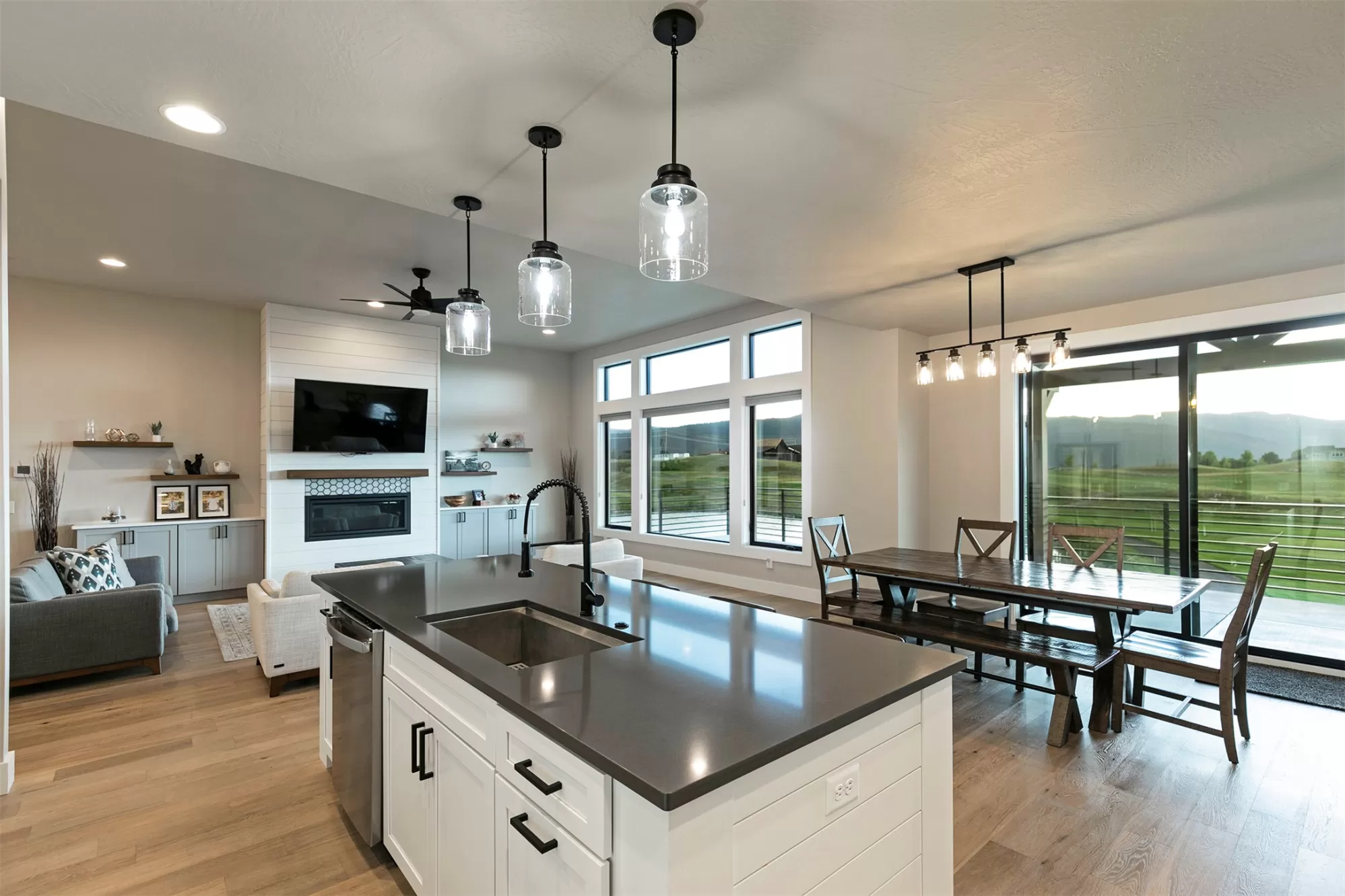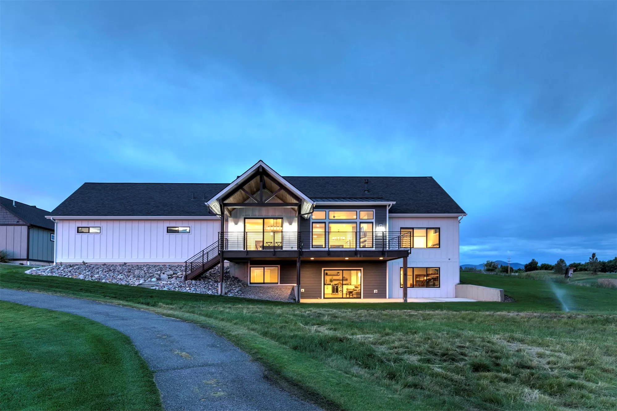 Set on a generous corner lot in the heart of Missoula’s sought-after Ranch Club community, this newer 5-bedroom, 4-bathroom custom home offers nearly 3,900 square feet of well-designed living space with gorgeous views stretching across fairways, ponds, and surrounding mountains. Inside, the home’s open concept design flows naturally from room to room. The kitchen features a pantry, gas range stove, handcrafted tile work, and a large, functional island - making both daily meals and entertaining easy. The living spaces are anchored by custom finishes, including a standout handrail, a wet bar, and easy-to-maintain engineered hardwood flooring throughout. An oversized 3-car garage (with 10-foot ceilings) provides plenty of room for vehicles, gear, storage, and more. The primary suite was designed with comfort and style in mind, featuring a spacious custom walk-in closet, a large custom-tiled shower, and a soaking tub. A Jack-and-Jill bathroom connects two of the secondary bedrooms, while a built-in Murphy bed adds flexibility - perfect for guests or a home office. A large, low-maintenance concrete deck offers both style and function, with 180-degree views of the 17th green, adjacent pond, surrounding mountains, and 18th fairway setting the backdrop for everyday life. Custom railings and a mix of shaded and open-air areas make it a space you’ll use year-round. Located on the site of the historic Deschamps Ranch, once home to four generations of Montana ranchers, the Ranch Club is now a well-established community with access to an 18-hole championship golf course, clubhouse, fitness center, swimming pools, and a full-service restaurant and lounge. Modern Montana living meets a sense of history in this stunning home, where thoughtful design, enduring craftsmanship, and everyday comfort come together in one of Missoula’s most desirable settings. This Ranch Club property is more than a home, it’s a lifestyle.