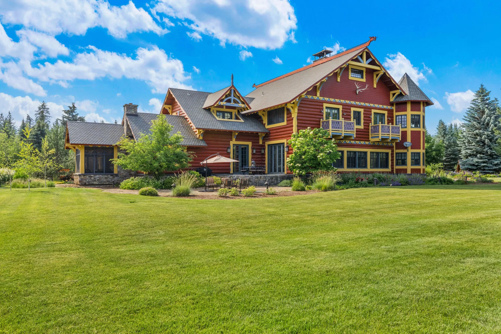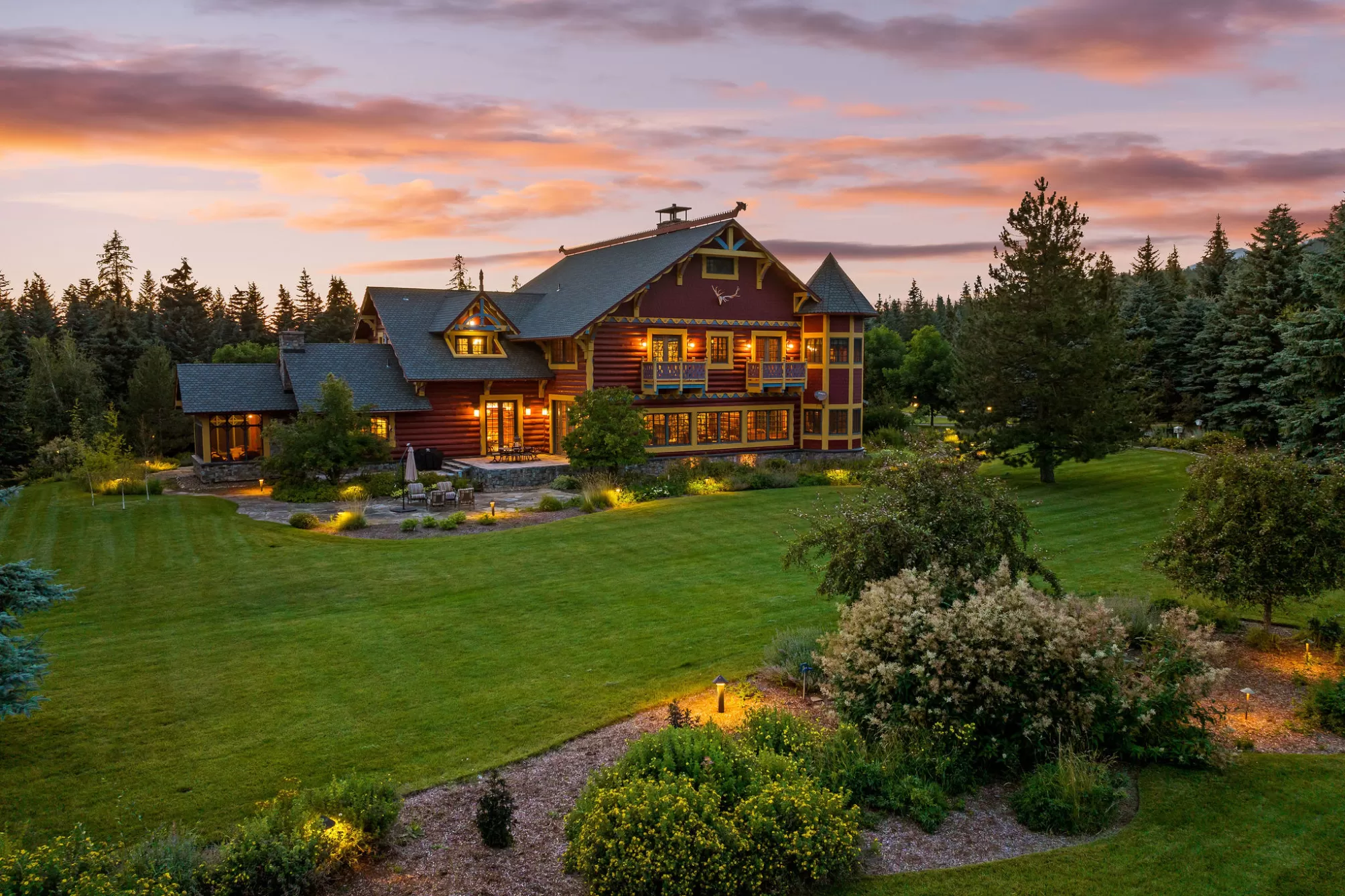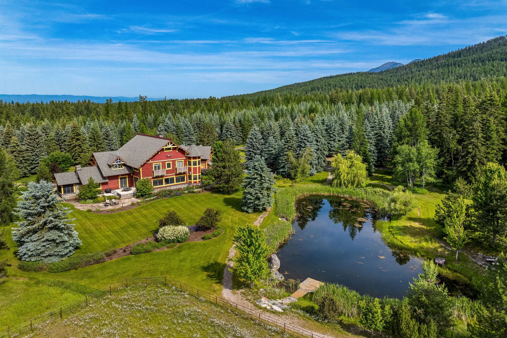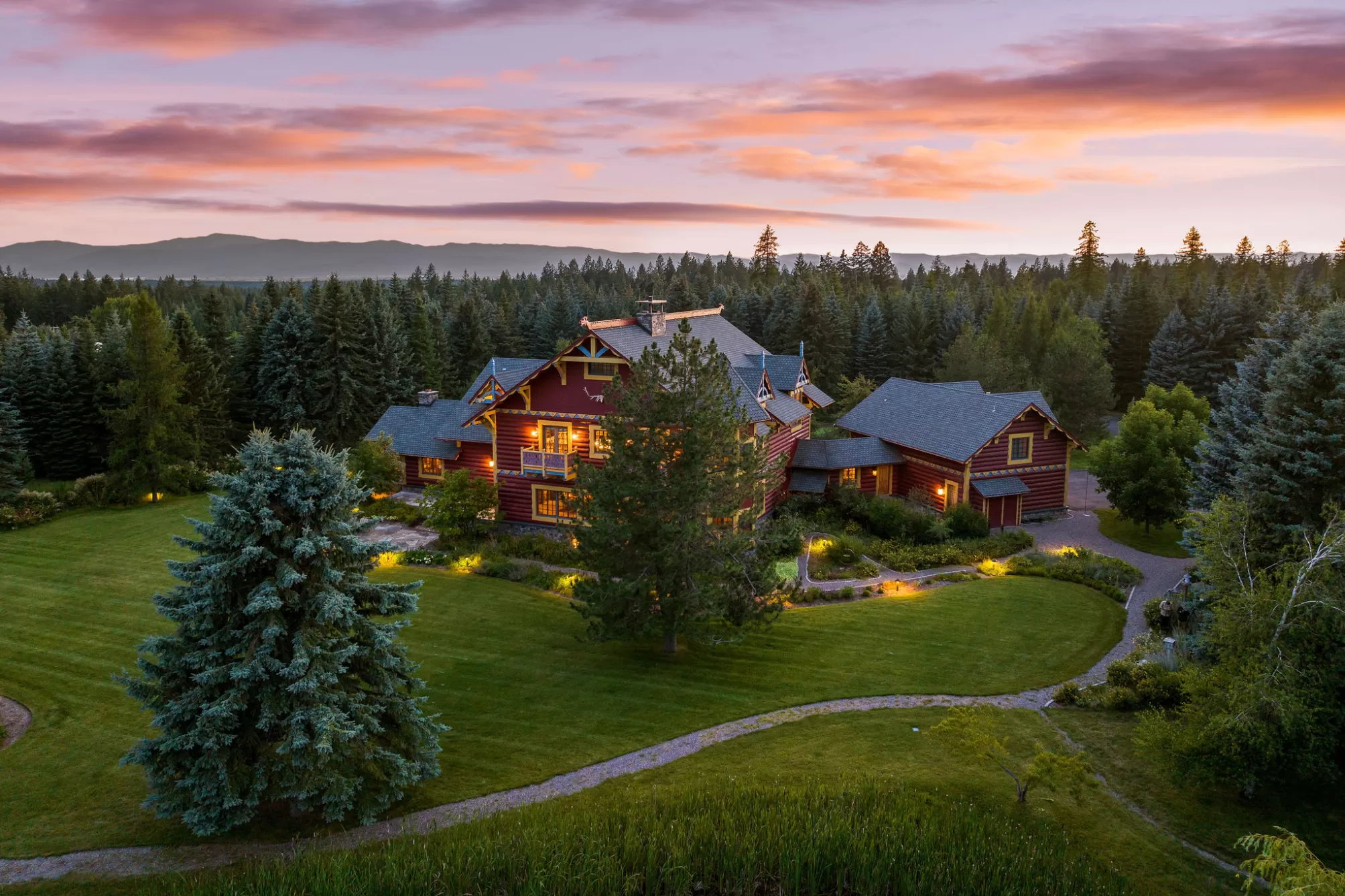 Welcome to this iconic 14,228 SF lodge with five additional homes on nearly 60 acres of hayfields, forest, fenced pasture, & trails. An authentic Montana legacy property defined by privacy, expansive acreage, & timeless craftsmanship, Plaid Swan Ranch is a rare sanctuary for gathering & roaming, set apart from conventional development and standing among the Flathead Valley’s most distinguished estates. Nestled at the base of the Swan Mountain Range, this property includes fabulous views of Jewel Basin, one of the region’s premier hiking areas. 30 miles from Glacier Park Intl. Airport & near the village of Bigfork, this property is an exceptional haven for those who value both seclusion & proximity to vibrant community life. Whether envisioned as a family compound, equestrian paradise, retreat space, or wedding venue, Plaid Swan Ranch presents a rare opportunity to own a true Montana heritage property, one that stands as a masterful fusion of history, refined design, & enduring beauty. At its center stands an extraordinary 14,228 square foot, chalet-style main residence inspired by the iconic McDonald Lake Lodge in Glacier National Park. Designed with a refined, upscale mountain style and decorated to represent a European hunting lodge, this architectural masterpiece showcases a breathtaking great room of more than 2,000 square feet, with soaring 27-foot vaulted ceilings and an impressive stone fireplace that doubles as a rock-climbing wall. Blending luxury and function, the home is set up for unforgettable entertaining and features a sunroom with fossil stone floors and exquisite hand-painted ceiling murals, elegant marble-floored dining areas, a custom-designed theater, an expansive wine cellar accommodating approximately 2,900 bottles, multiple balconies and patios, whole-house speakers and smart lighting automation, an elevator servicing all levels, and countless refined and romantic touches throughout. Beyond the main residence, the estate offers a wealth of additional accommodations and amenities. These include a 2BD/1BA carriage house apartment attached to the main residence; a 2BD/1BA caretaker’s cottage; two charming 1BD/1BA guest chalets; a 2BD/1BA fairytale-like cottage, enchanting visitors with its storybook character; and a 1BD/2BA ranch house. A 4,200-square-foot, 4-stall stable complements the property, alongside cross-fenced pastures, a private trout-stocked pond, Finnish sauna, scenic walking trails, a greenhouse, chicken coop, and an array of outbuildings that include a heated generator house and loafing sheds. Approximately 20 acres are dedicated to dryland hay, with another 20 acres of mature forest, while the remaining acreage encompasses barns, pastures, manicured landscaping, and residences, all seamlessly connected by a winding paved driveway, adorned with wired lamp posts, that ensures privacy and effortless access throughout the estate. No expense was spared in developing this remarkable property, which features superior infrastructure and exceptional versatility for a wide range of uses. This property is offered turn-key with exclusions and enjoys the benefits of no HOA or CC&Rs. Plaid Swan Ranch is not merely a property, but an invitation to embrace the grandeur, serenity, and boundless possibilities that define the Montana dream. A 55+ page Homebook will be provided upon request. All prospective buyers must provide financial pre-qualifications/certification of funds & information on buyer profile.