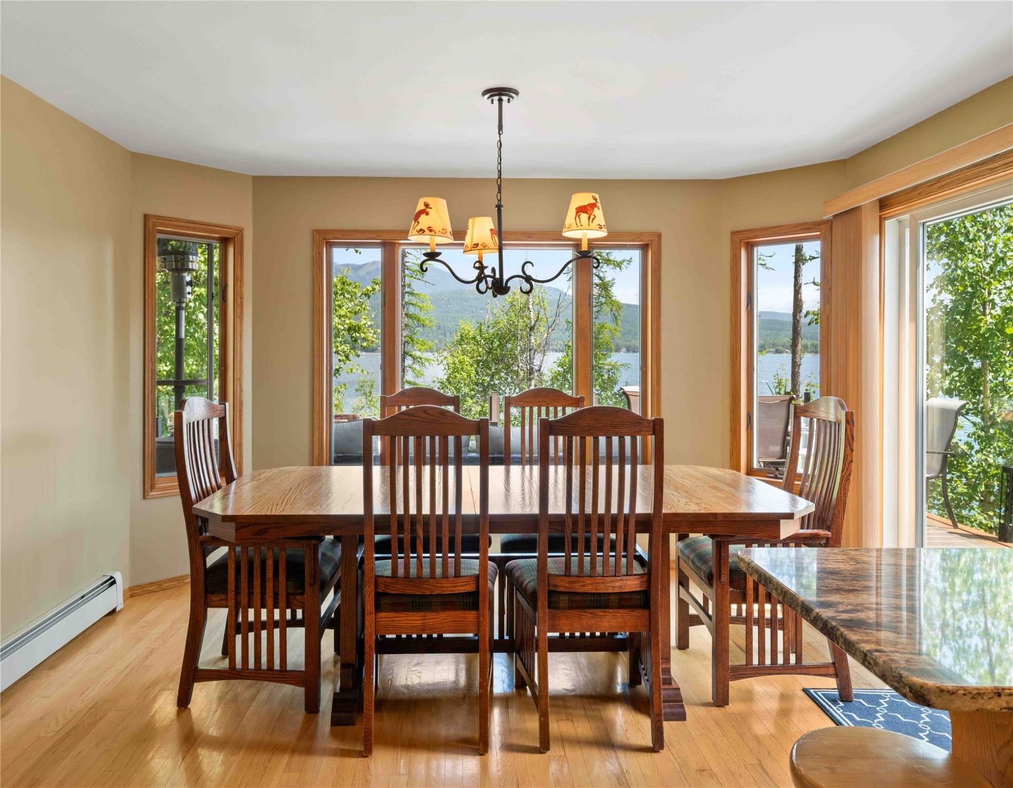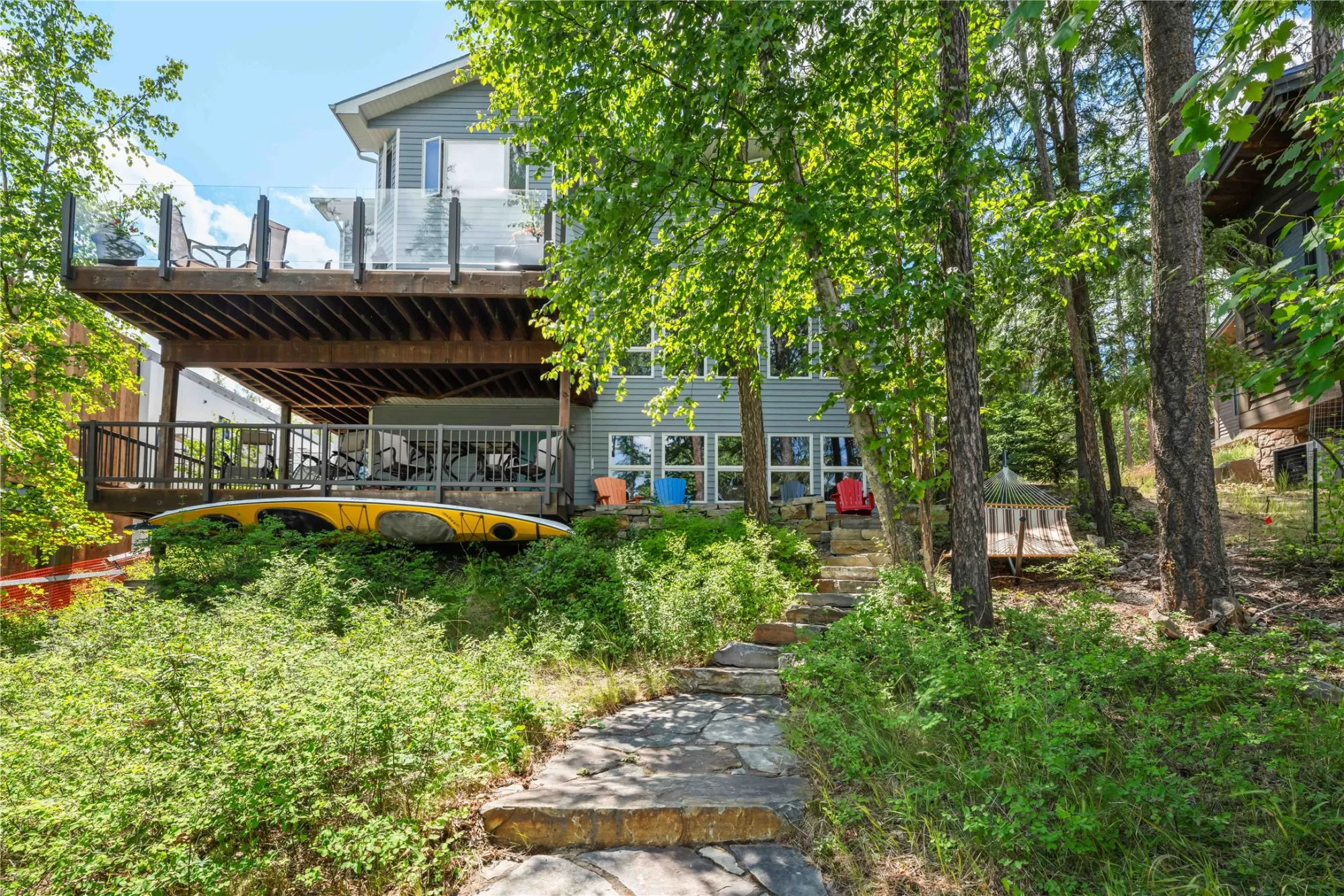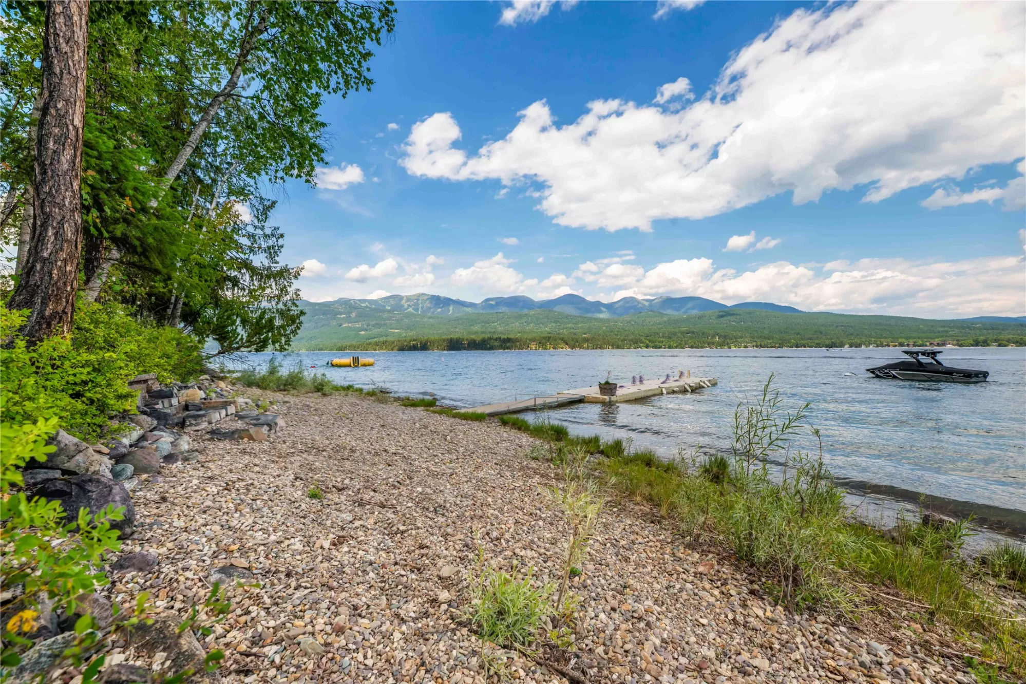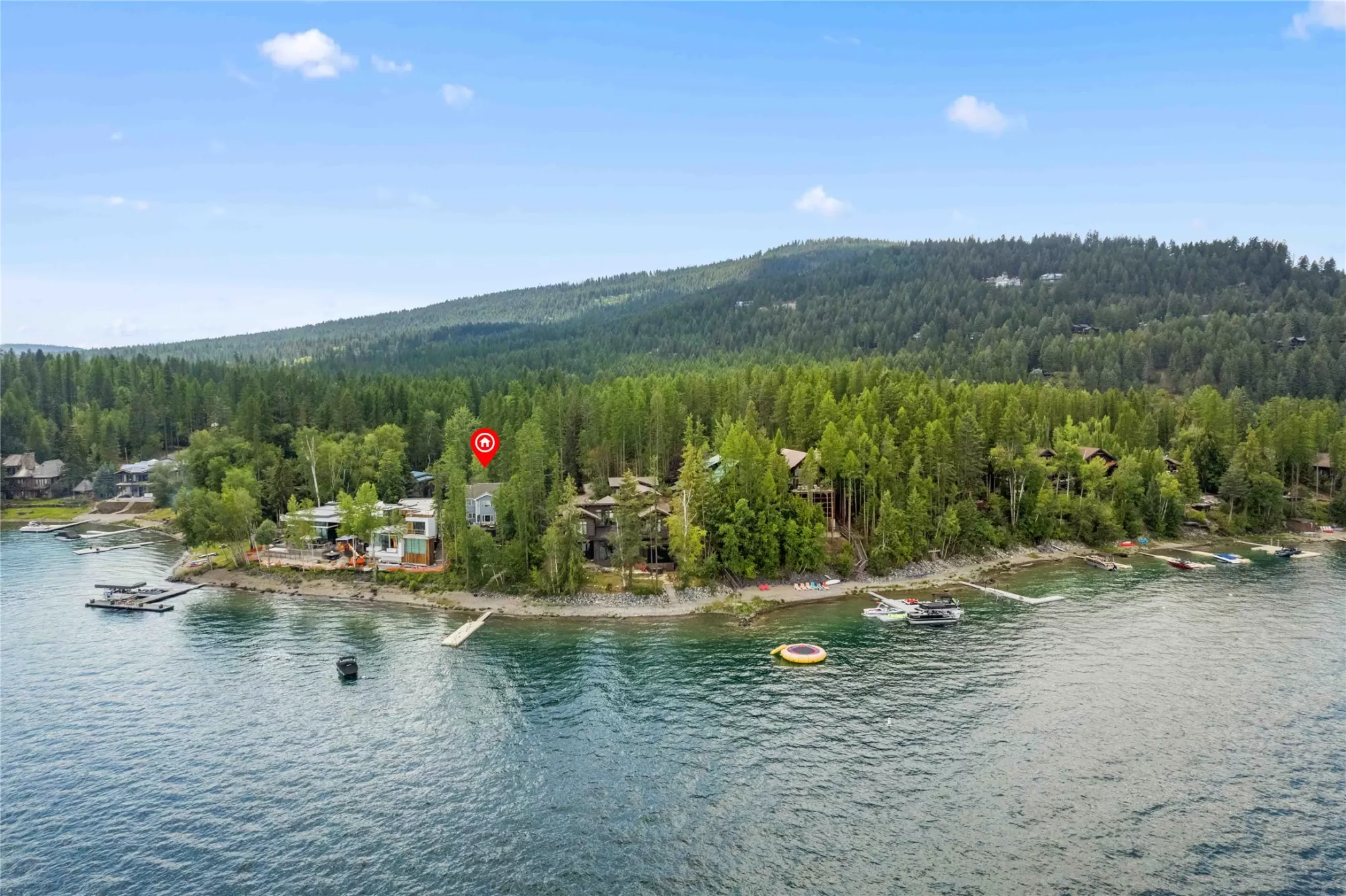 Experience the serenity of Montana lakefront living in this immaculate three-level home with 59 feet of shoreline on Whitefish Lake. Perfectly designed for large gatherings with multiple decks and spacious living and family rooms. This meticulously kept 5 bedroom 4 bath home along with an additional finished bonus room is well maintained and offers amazing mountain and lake views from many rooms in the home. A beautiful stone hardscape surrounded by mature vegetation leads you to the private pebble beach and boat dock.
