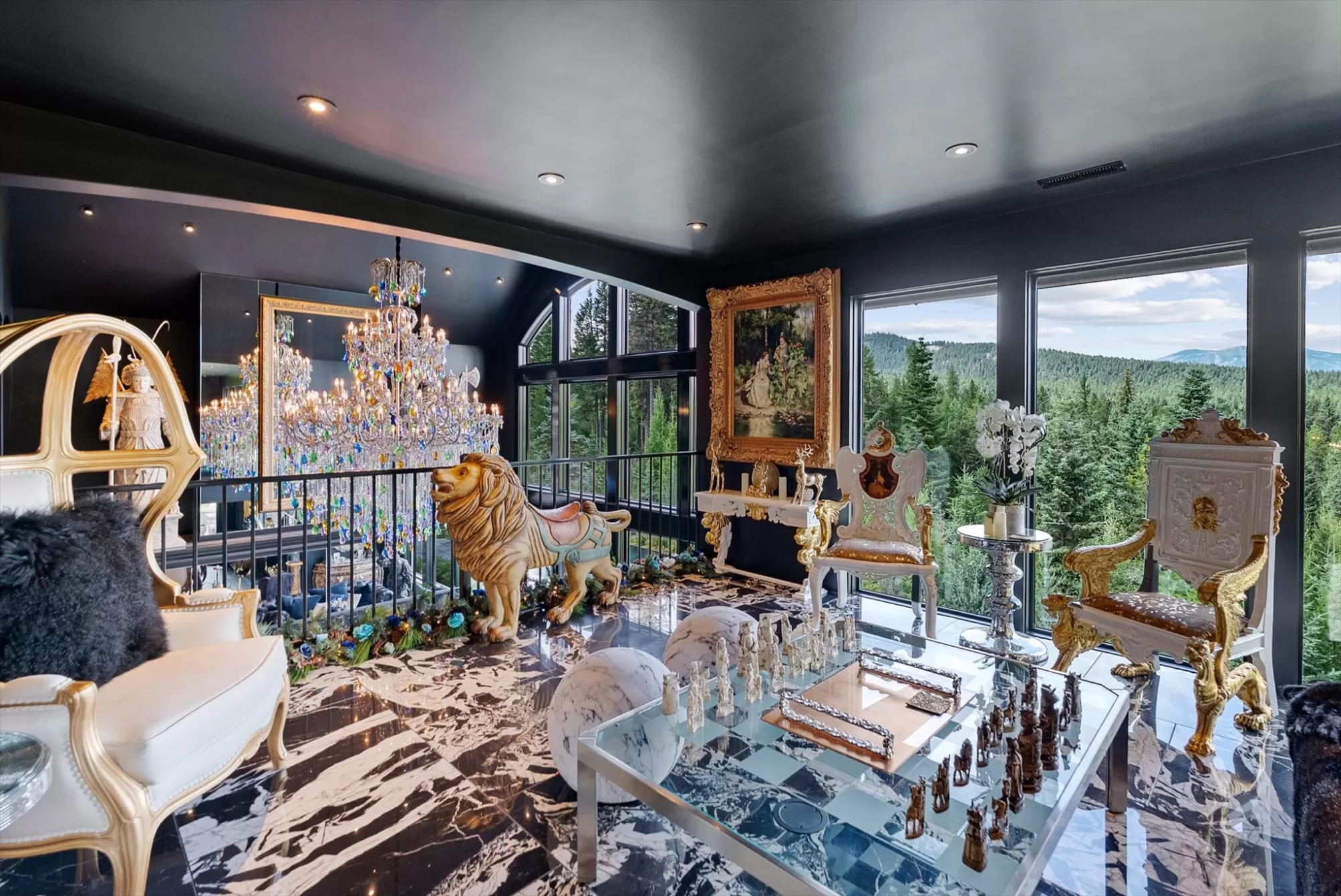 TWO grand homes on 40 fenced acres with mountain views in the coveted Whitefish Hills community. Both furnished homes are a masterpiece of design. Soaring ceilings, floor-to-ceiling windows, and expansive spaces for grand scale entertaining. Hand-selected stone, rich woods, and bespoke textiles adorn every surface. The true genius of this property lies in its amenities, which rival exclusive resorts. A private playground, offering an array of recreational and leisure opportunities: gym, spa, theatre room, bowling ally, game room, swimming pool, 2 hot tubs, Olympic-depth, man-made swimming lake with waterfall and rock cliff for diving, Astro turf entertaining spaces, putting green, bocce ball, 6 fire pits & 7 water features. Miles of walking/skiing trails wind through the property's lush forests, which border State land. An established orchard and herb garden provide farm-to-table living. The detached garage and barn provide space for vehicles, toys or future living space expansion.