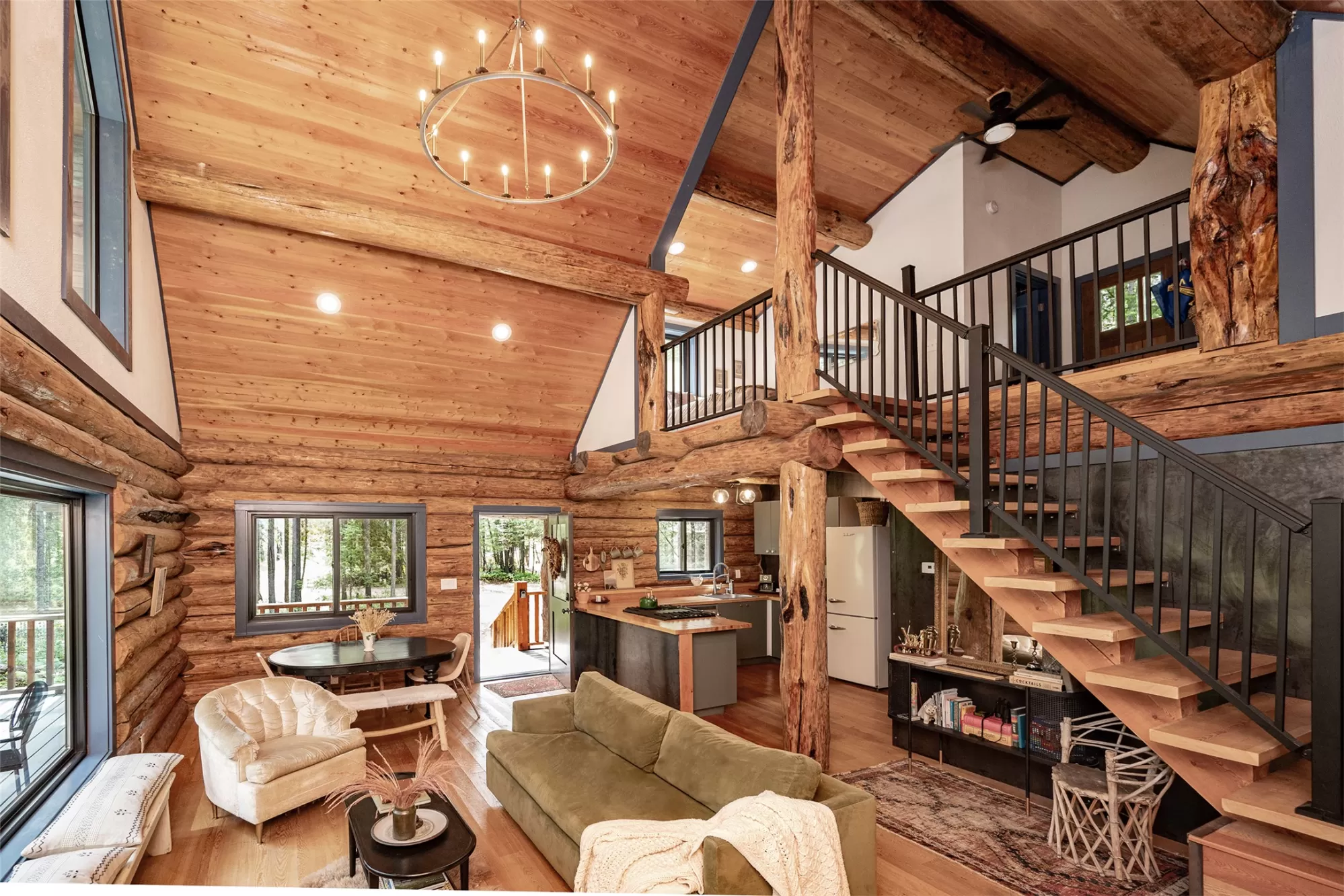 Turn-key and income-producing, this fully furnished, 2022 custom Montana log cabin blends modern finishes with timeless rustic character in a private wooded setting near Glacier National Park. Established as a successful short-term rental, it also serves as a year-round retreat. The main floor features the primary bedroom and full bath, while the open loft offers additional sleeping space with a half bath, laundry, and access to a private balcony. Vaulted timber ceilings and expansive windows highlight the great room, flowing into an open kitchen and dining area. A wraparound deck and covered porch extend the living space outdoors. The half-acre lot offers privacy, native landscaping, and a fire pit for evenings under the trees. Ideally located near Glacier National Park with access to lakes, rivers, golf, and trails, and only 30 minutes to skiing in Whitefish and 45 minutes to Kalispell shopping and dining. This property operates as an active STR / vacation rental. Showings must be coordinated with the listing agent to work around guest reservations. Please request property showings in advance to accommodate guest schedule. Home was completed in 2022; foundation poured in 2018. Public records classify the property as 2 bedrooms. Main floor bath is a tub/shower combo and the loft bath is a half bath with washer and dryer. Septic system is approved for 2–5 bedrooms, providing capacity beyond current layout. Property will be sold furnished, including appliances, furniture, kitchenware, linens, and décor unless specifically excluded. Propane gas conveys; propane tank is leased and transferable with provider. Internet service is available; Dish internet equipment is leased and may be transferable through the provider.