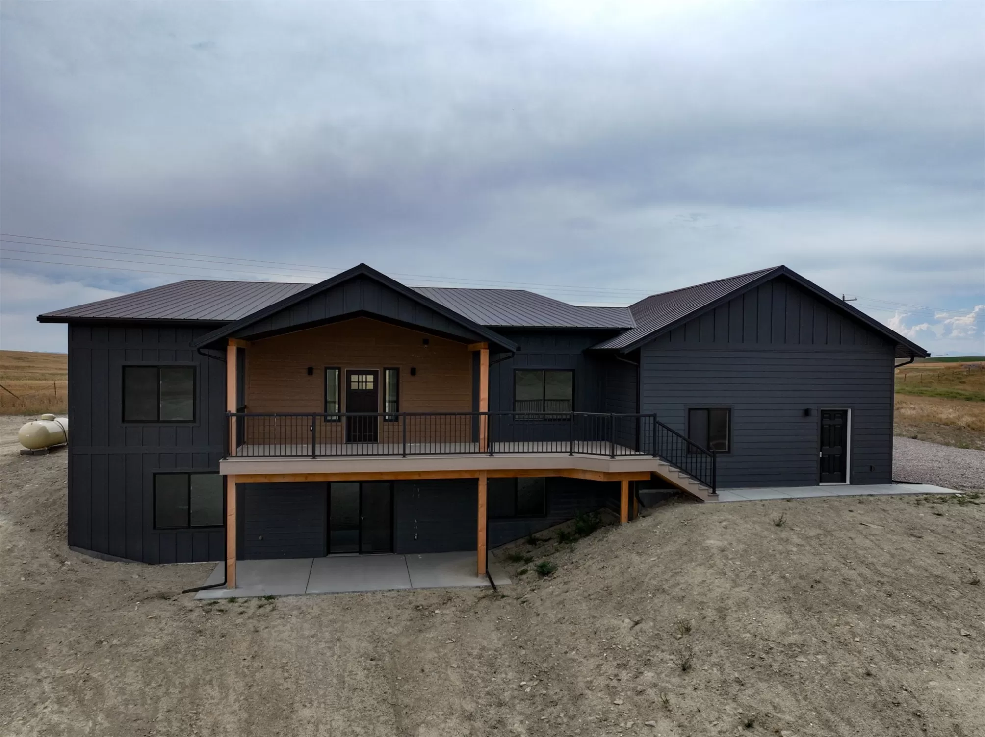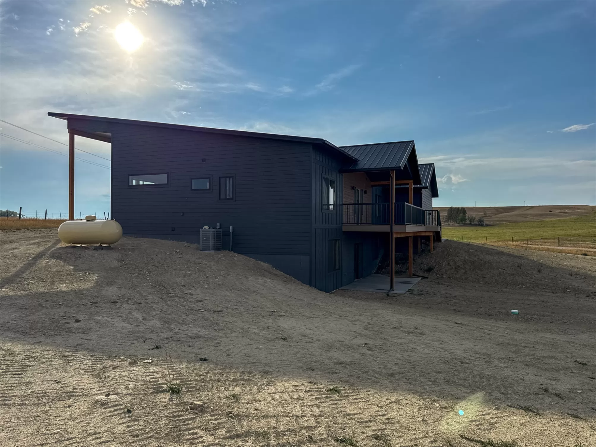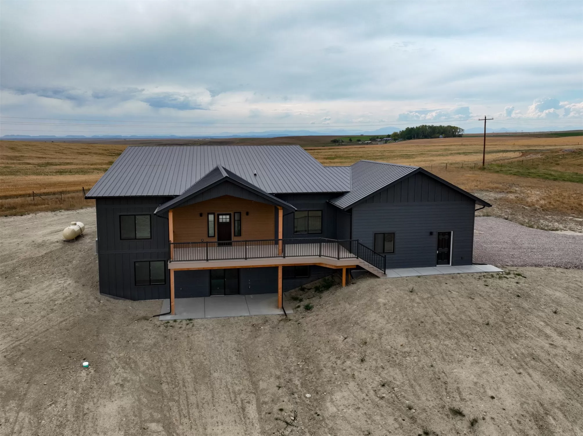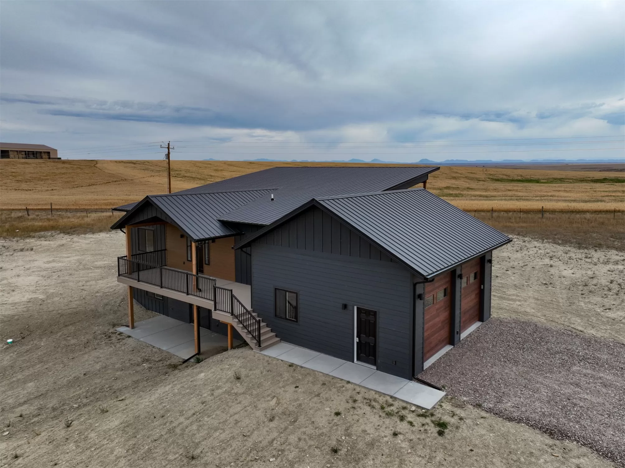 Come home to a high style NEW CONSTRUCTION home that showcases modern elements, along with classic lodge features. The house sits on over 10 acres with Rocky Mountain Front and territorial views which can be seen from the enormous windows or from one of the 3 covered decks; two of which are Trex. Inside, find a high-ceilinged, open concept great room to include a kitchen with a huge eating island, stainless appliances, handsome cabinetry and black granite countertops. The primary bedroom has a large tile shower, plus a double sink vanity. There are three bedrooms on the main floor and two more are in the lower level. The walk-out lower level has 9' ceilings and it boasts a versatile recreation room and another full bathroom. All the finishes, from lighting, hardware, flooring, doors, appliances are high-end and tasteful. You'll enjoy the attached 2 car garage that leads to a mud room. NO COVENANTS, so bring horses, chickens, cows, goats or pigs and utilize it how YOU like! It is located with close proximity to hunting, fishing, hiking and to the small rural towns of Fairfield, Augusta and Choteau. It is a little over 30 minutes to Great Falls, so is easily commutable. Garage is sheet-rocked and has gas pumped to it, so can be heated. 12 GPM well and septic. Central air and forced air propane. Home is 3400' feet with 5 bedrooms and 3 full bathrooms. With the walk-out basement and the way plumbing is set up, it is a prime candidate for creating two full and separate living areas on each floor. Separate listing includes house and a to-be-built 28 X 32' shop.