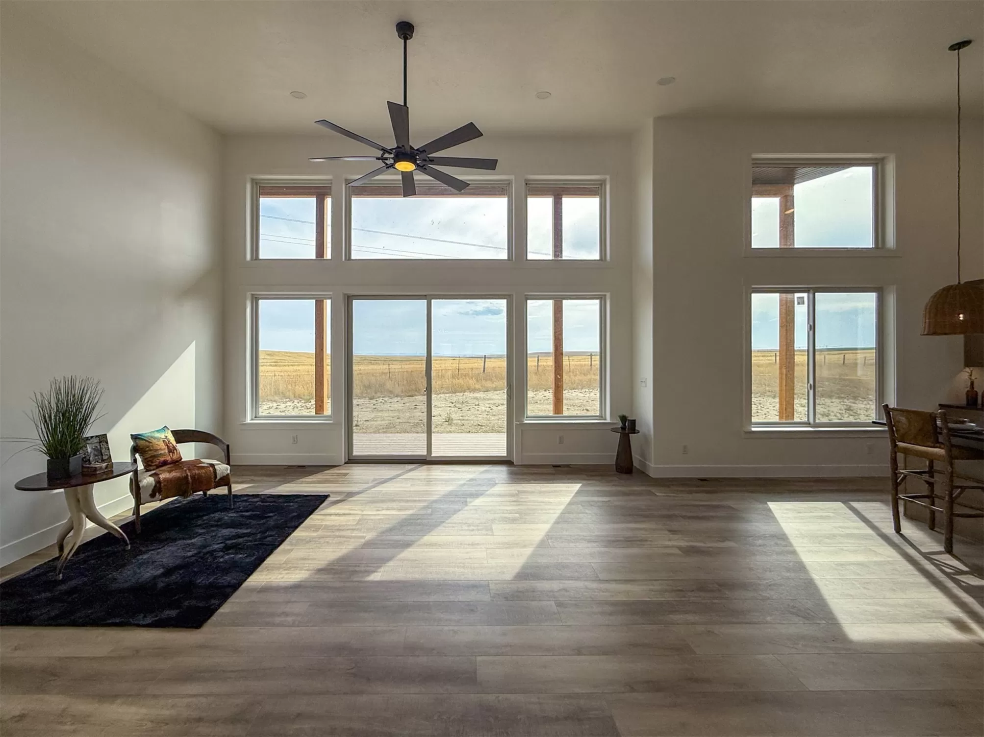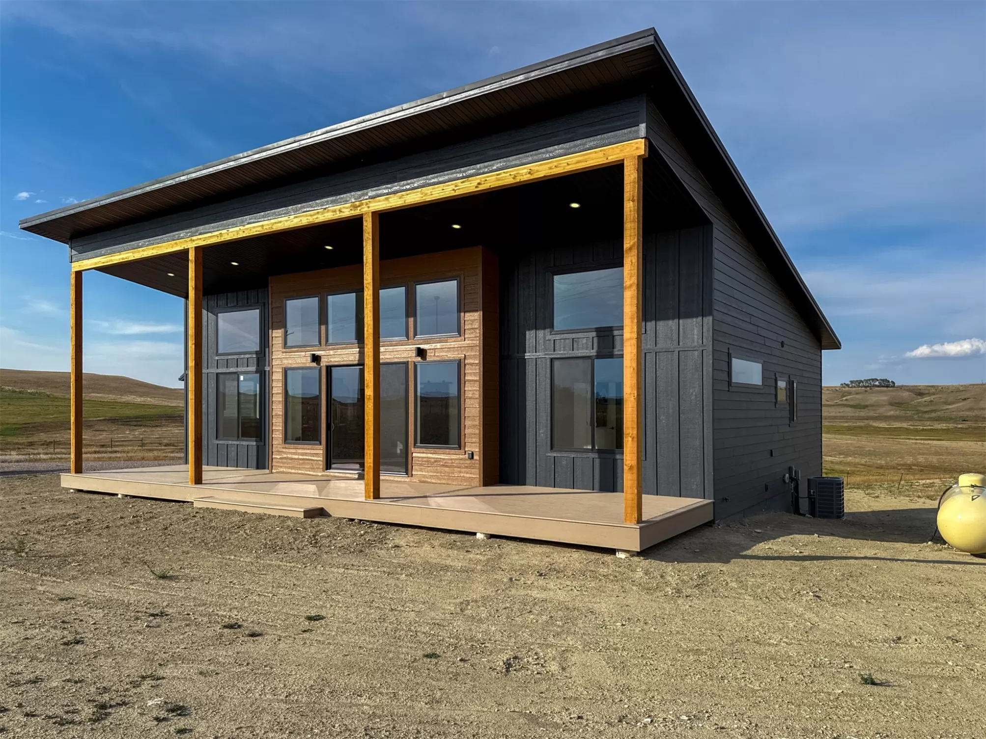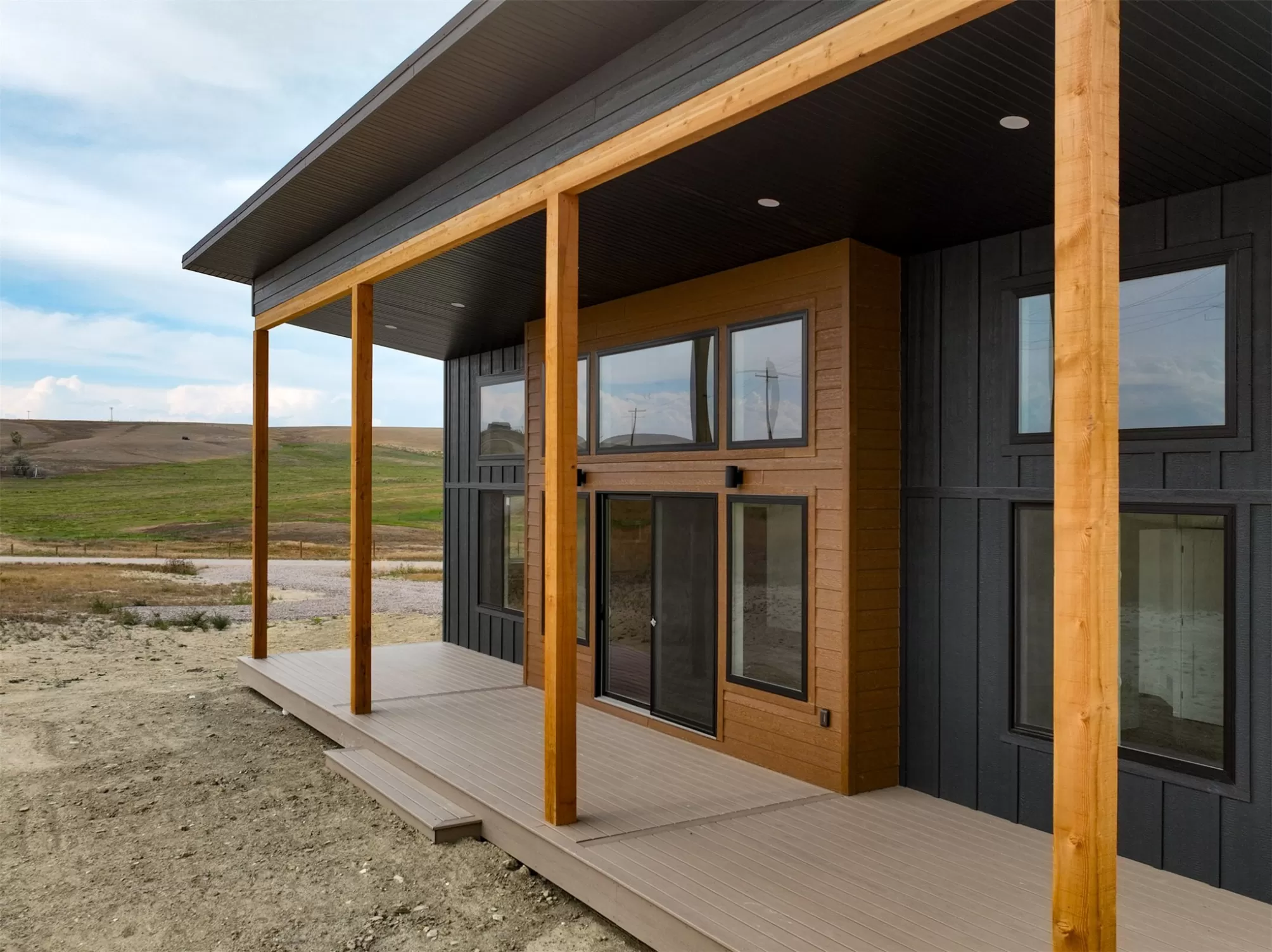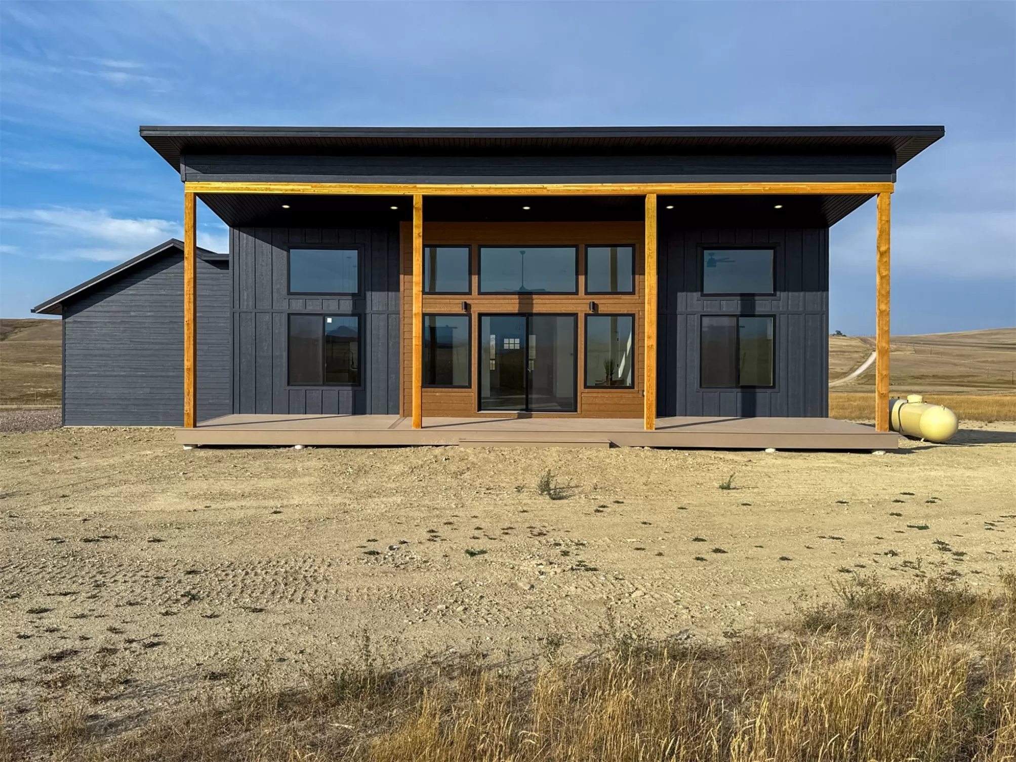 Come home to a high style NEW CONSTRUCTION home that showcases modern elements, along with classic lodge features. The house sits on over 10 acres with Rocky Mountain Front and territorial views which can be seen from the enormous windows or from one of the 3 covered decks; two of which are Trex. Inside, find a high-ceilinged, open concept great room to include a kitchen with a huge eating island, stainless appliances, handsome cabinetry and black granite countertops. The primary bedroom has a large tile shower, plus a double sink vanity. There are three bedrooms on the main floor and two more are in the lower level. The walk-out lower level has 9' ceilings and it boasts a versatile recreation room and another full bathroom. All the finishes, from lighting, hardware, flooring, doors, appliances are high-end and tasteful. You'll enjoy the attached 2 car garage that leads to a mud room. NO COVENANTS, so bring horses, chickens, cows, goats or pigs and utilize it how YOU like! It is located with close proximity to hunting, fishing, hiking and to the small rural towns of Fairfield, Augusta and Choteau. It is a little over 30 minutes to Great Falls, so is easily commutable. Garage is sheet-rocked and has gas pumped to it, so can be heated. 12 GPM well and septic. Central air and forced air propane. Home is 3400' feet with 5 bedrooms and 3 full bathrooms. With the walk-out basement and the way plumbing is set up, it is a prime candidate for creating two full and separate living areas on each floor. Separate listing includes house and a to-be-built 28 X 32' shop.