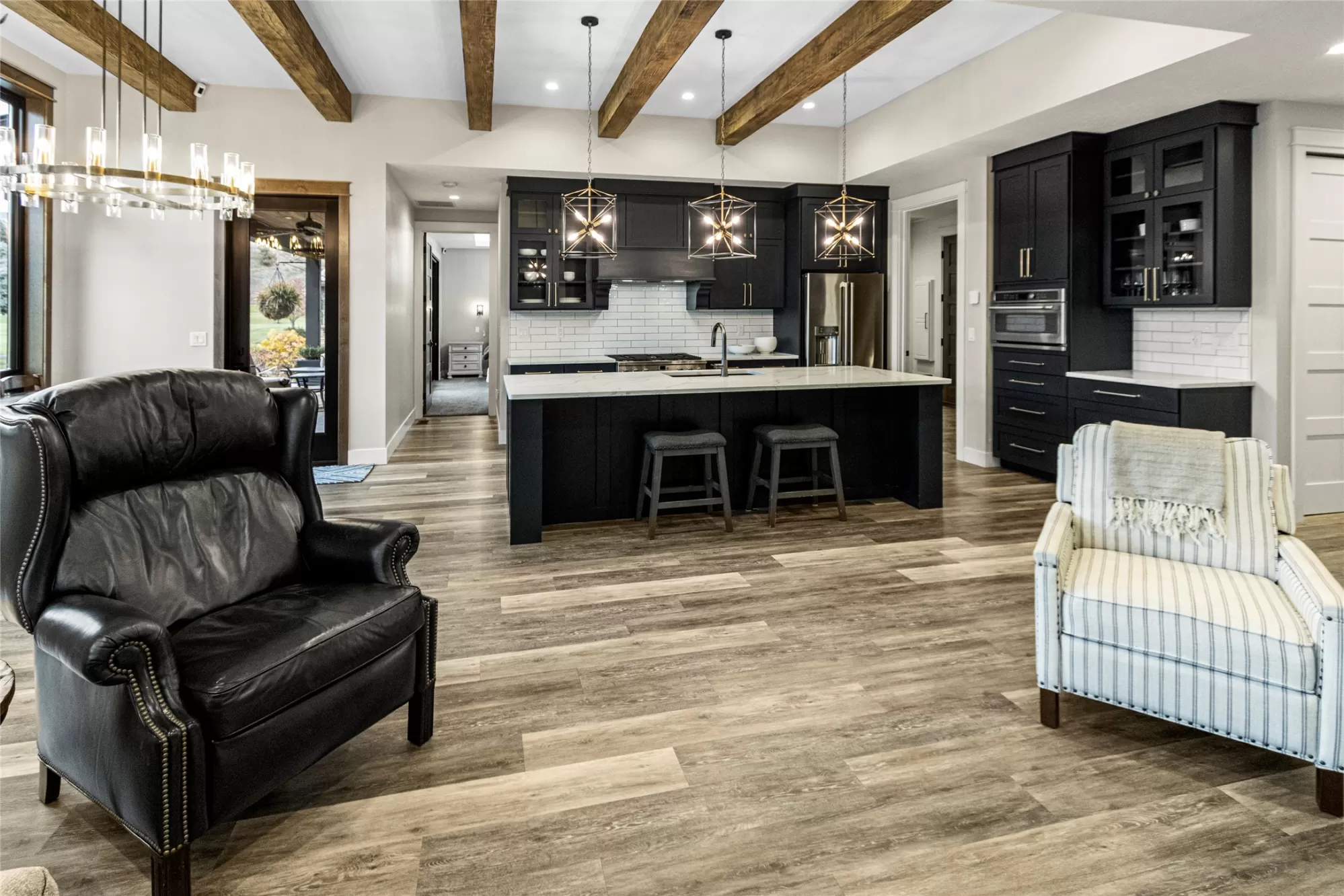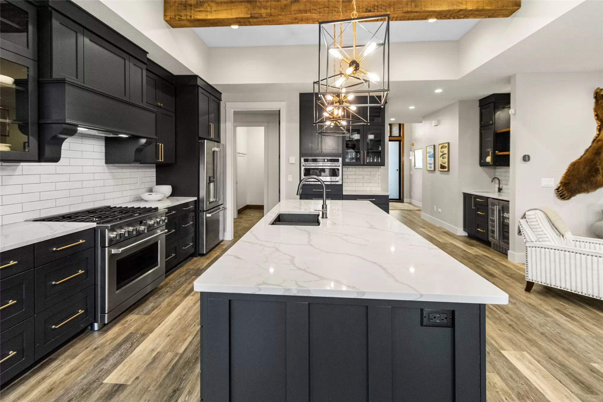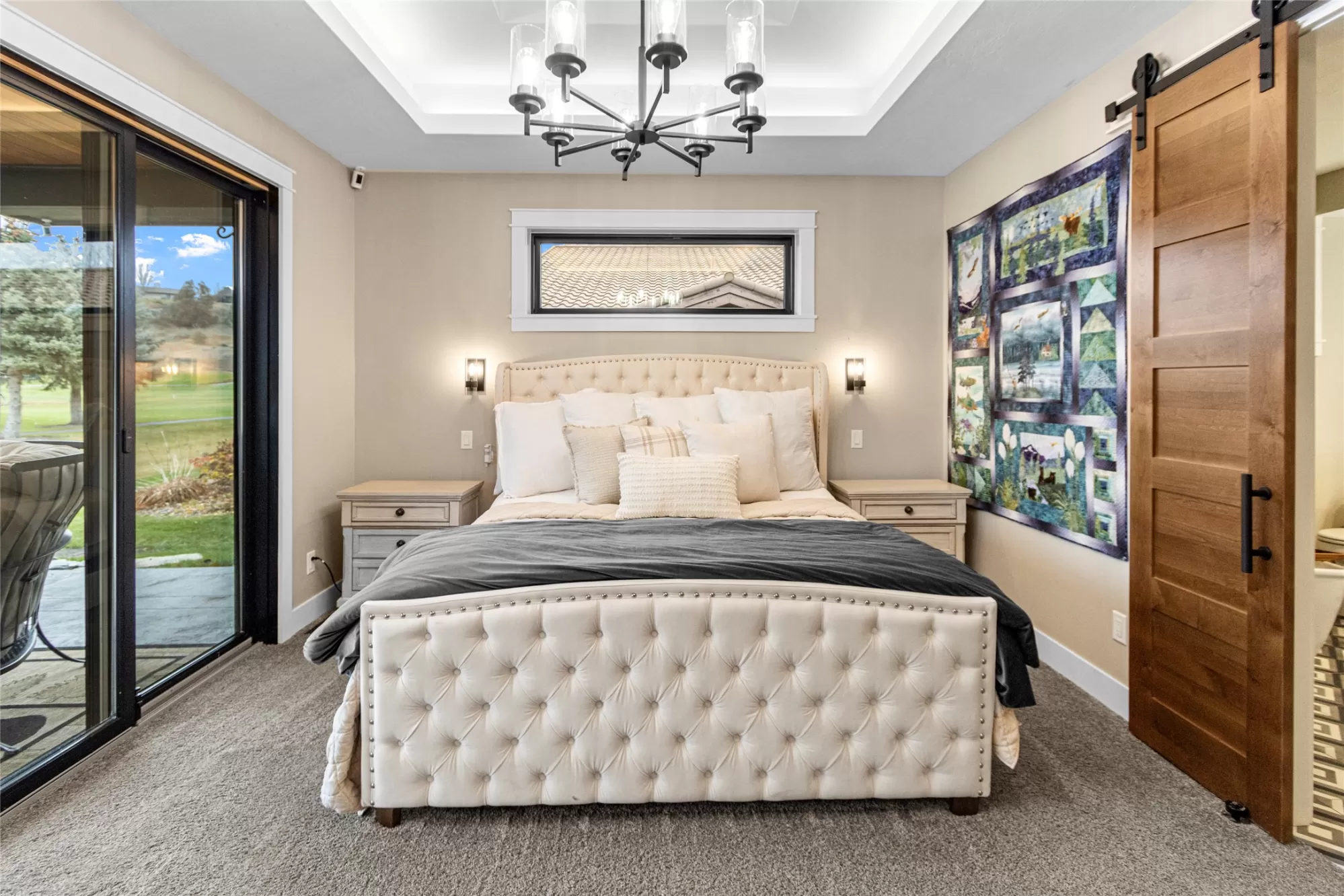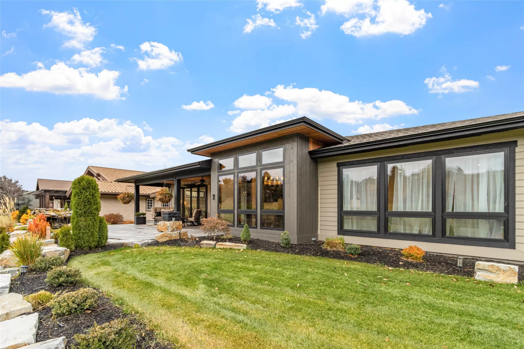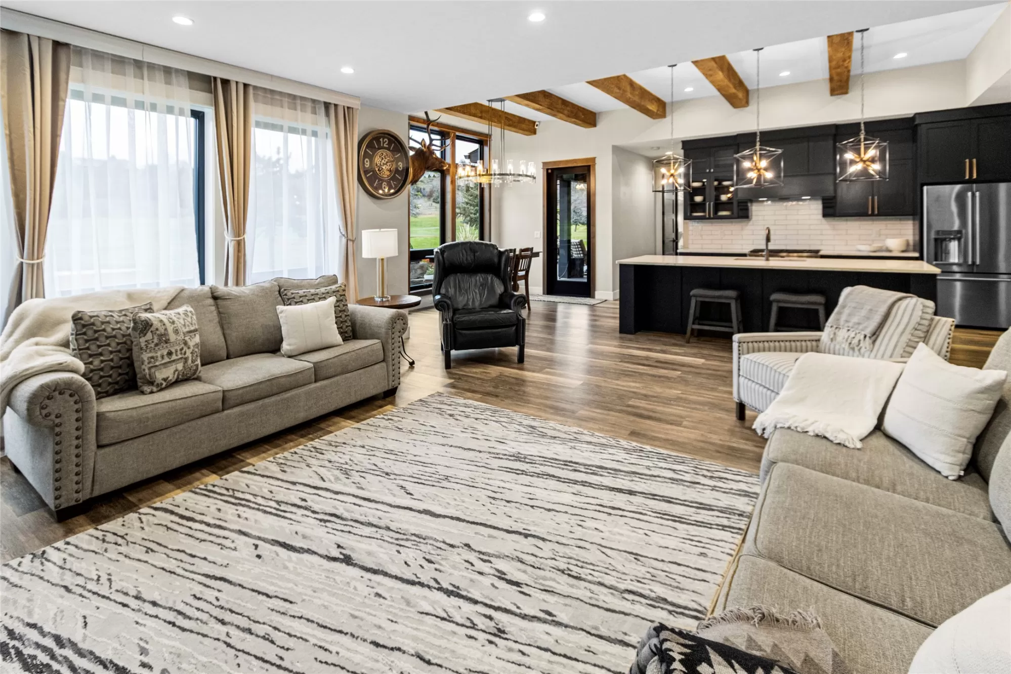 FORE! This is Montana’s premier golf lifestyle at Village Greens, where modern elegance meets effortless living on the 13th hole! This 2022 custom single-level, ADA-compliant 4BD/3BA home offers 2,207 sq ft of open, light-filled design. Expansive floor-to-ceiling glass windows frame fairway views like fine art. The chef’s kitchen features custom shaker cabinets, wet bar, and large island perfect for entertaining. The primary suite is a spa-inspired retreat with soaking tub, walk-in tile shower, dual vanity, and full ADA accessibility with wide doorways and zero-threshold entries. Step outside to a landscaped patio with tranquil water feature overlooking the 13th hole. Heated 2-car garage plus golf cart bay offers hot water, workspace, and sleek glass doors. Close to downtown Kalispell, shopping, dining, and Glacier National Park—luxury, light, and lifestyle combined.