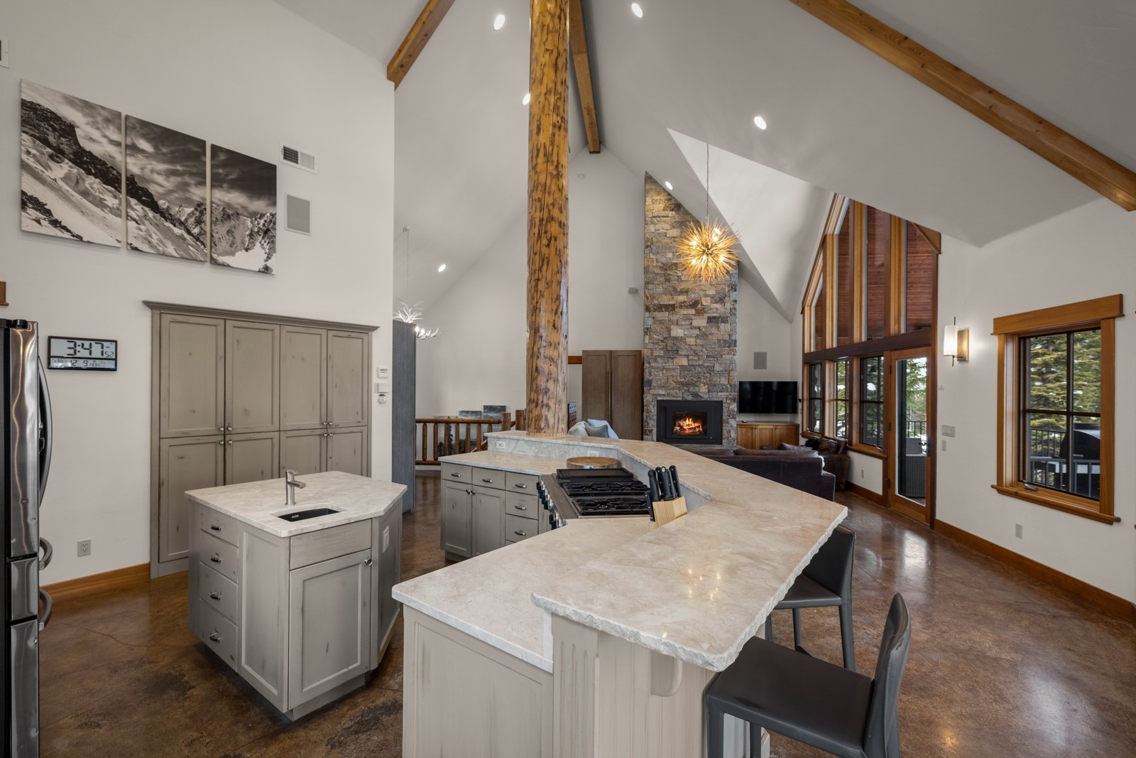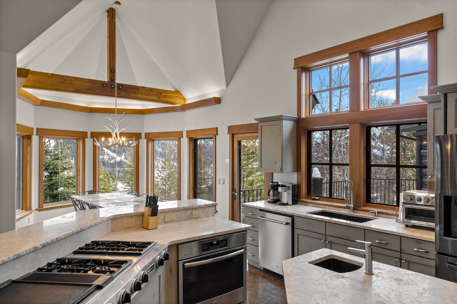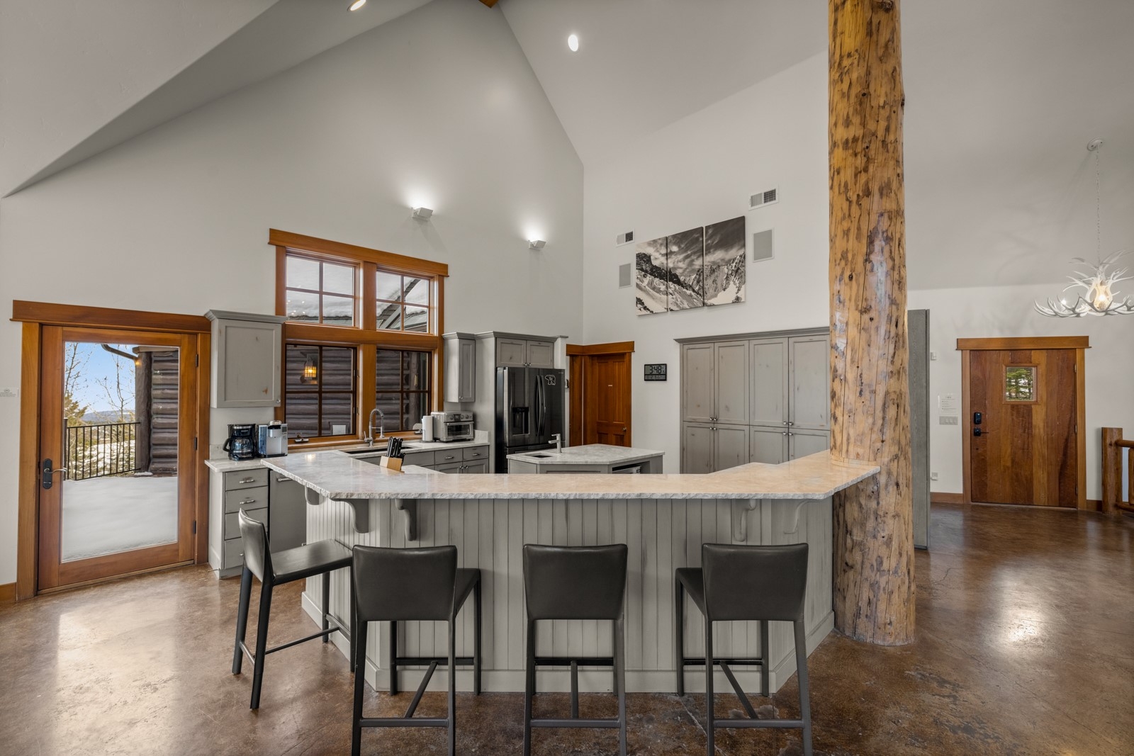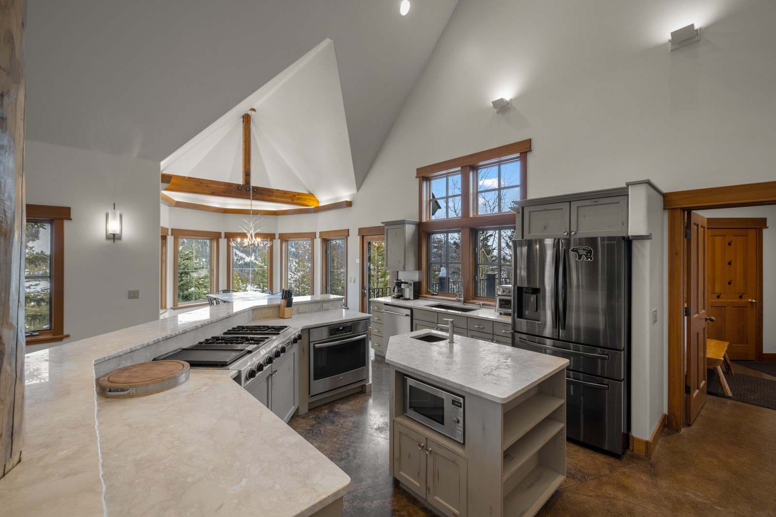 SKI IN SKI OUT WITH UNOBSTRUCTED VIEWS OF THE SKI MOUNTAIN AND NEAR A VERY PRIVATE CUL-DE-SAC. Charm and modern luxury merge in this remarkable alpine retreat at Whitefish Mountain Resort, offering the ultimate slopeside experience. Elevated on the hillside, near the Elk Highlands Chairlift, this furnished, 4-bedroom + flex space, 3.5-bath, 3,800+ sq ft custom lodge-style home delivers true ski-in/ski-out access, privacy, and panoramic views of both Whitefish Mountain Resort and Glacier National Park, all framed by awe-inspiring sunrises. The main level welcomes you with vaulted ceilings, warm wood accents, and a soothing contemporary palette that enhances the open concept living, dining, and kitchen areas. A striking floor-to-ceiling gas fireplace serves as the centerpiece of the great room, while the gourmet kitchen is filled with natural light & designed for entertaining, featuring an ideal gathering space with sweeping mountain vistas. The primary suite showcases a luxurious bathroom with a jetted tub & stunning mountain backdrop. The lower level extends the entertainment potential with two additional bedrooms, a theater room with plush recliner seating, and a convenient kitchenette for guests. After a day on the slopes, unwind in the private outdoor hot tub and take in the spectacular alpine scenery. From the quality craftsmanship to the unbeatable location, this residence embodies the very best of slopeside living on Sunrise Ridge. Make this Ridge Top Chalet your own, whether for adventure or investment! Partially renovated in 2018 with new heating/cooling installed at that time.