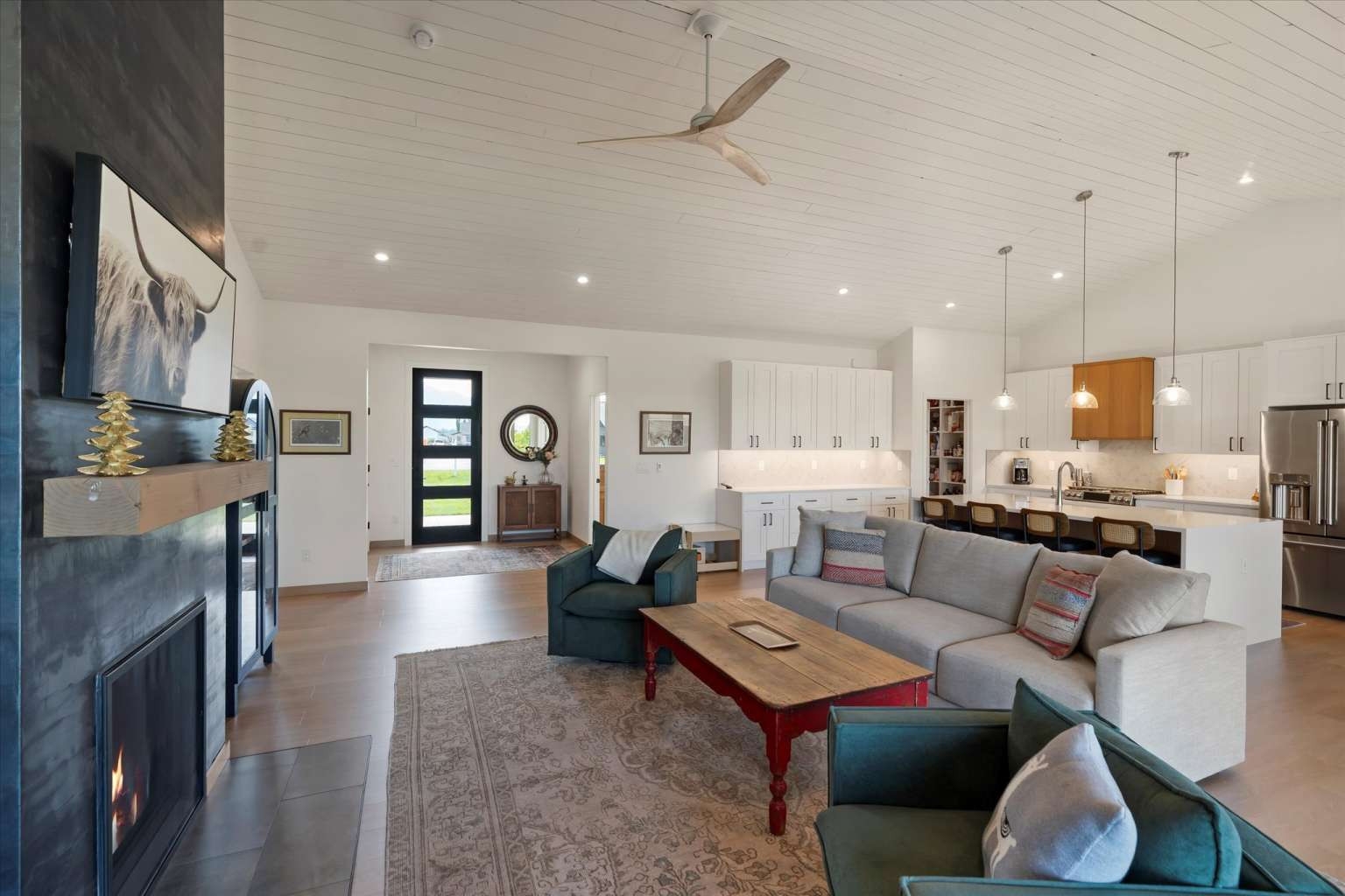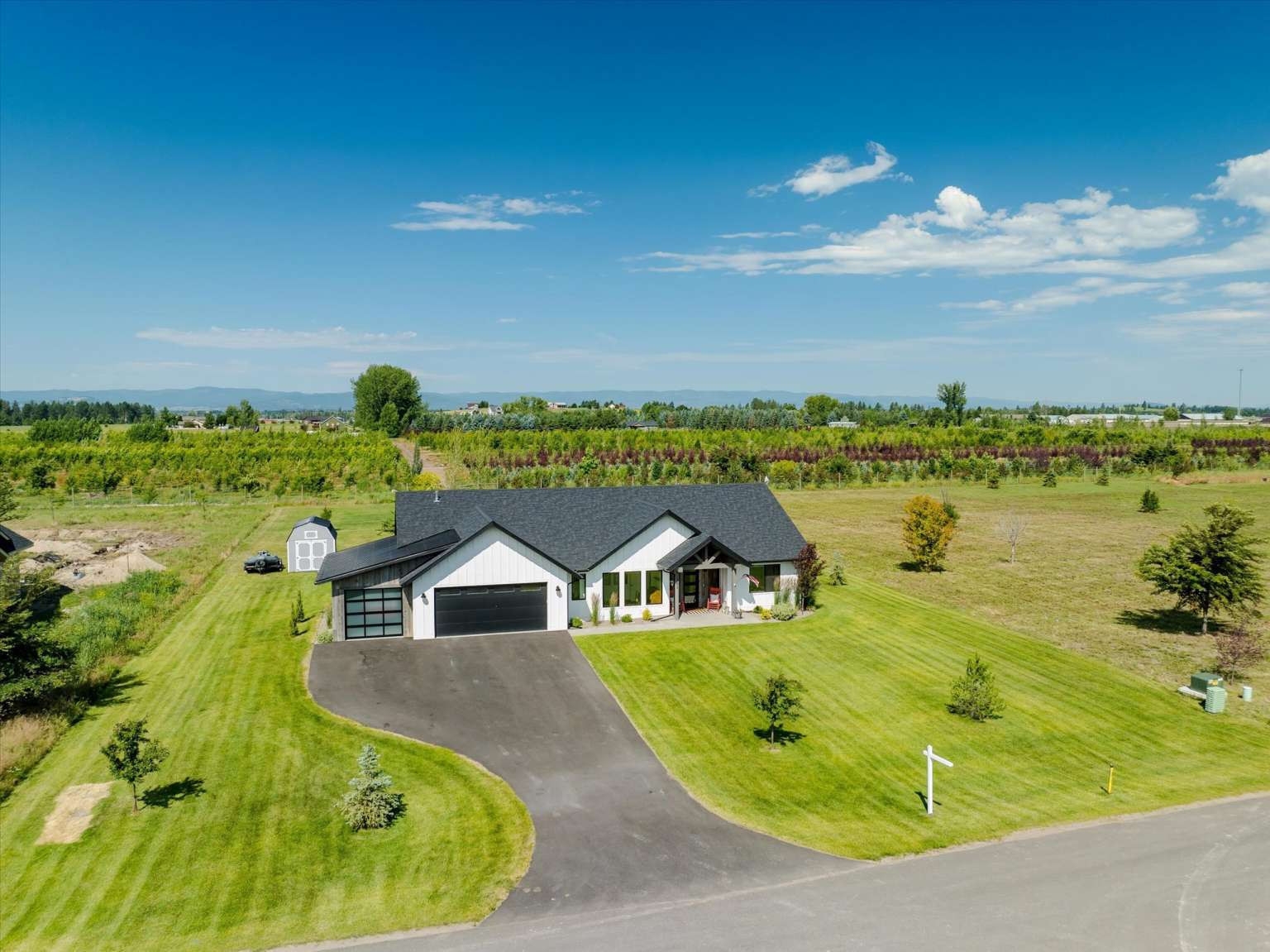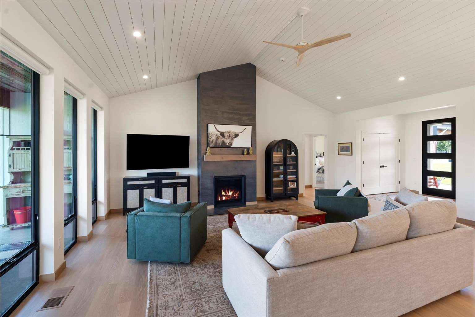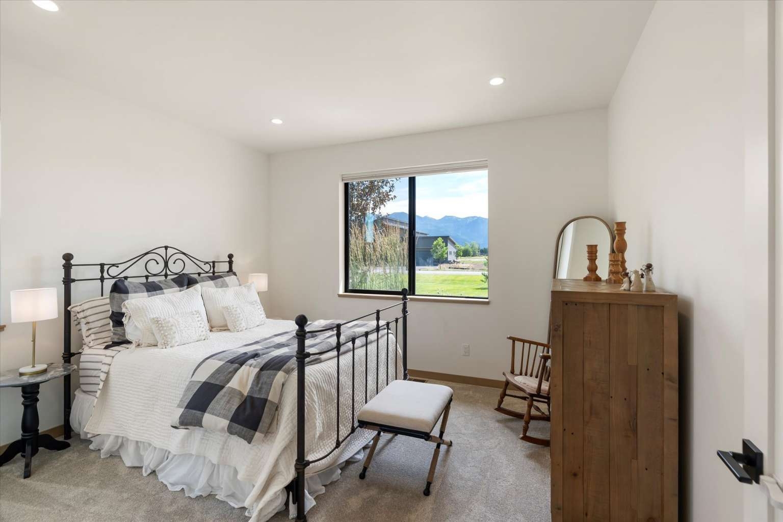 Nearly one acre with mountain views, this 2024 single-level, zero-step home offers modern Montana living just minutes from Kalispell and under 30 minutes from Glacier National Park. Designed for effortless everyday living, the home features vaulted ceilings, floor-to-ceiling windows, and covered front and rear patios that capture the surrounding landscape. The thoughtfully planned layout includes four bedrooms, two and a half bathrooms, a dedicated laundry room, and an inviting living space anchored by a gas fireplace. The kitchen is both functional and stylish, with Cafe appliances, a walk-in pantry, and clean, modern finishes throughout. The primary suite is a private retreat with heated bathroom floors and generous storage. Additional highlights include a heated three-car garage, quality construction, and a move-in-ready interior. Set in a peaceful Creston setting, this home blends comfort, functionality, and space in one of the Flathead Valley’s most desirable locations.