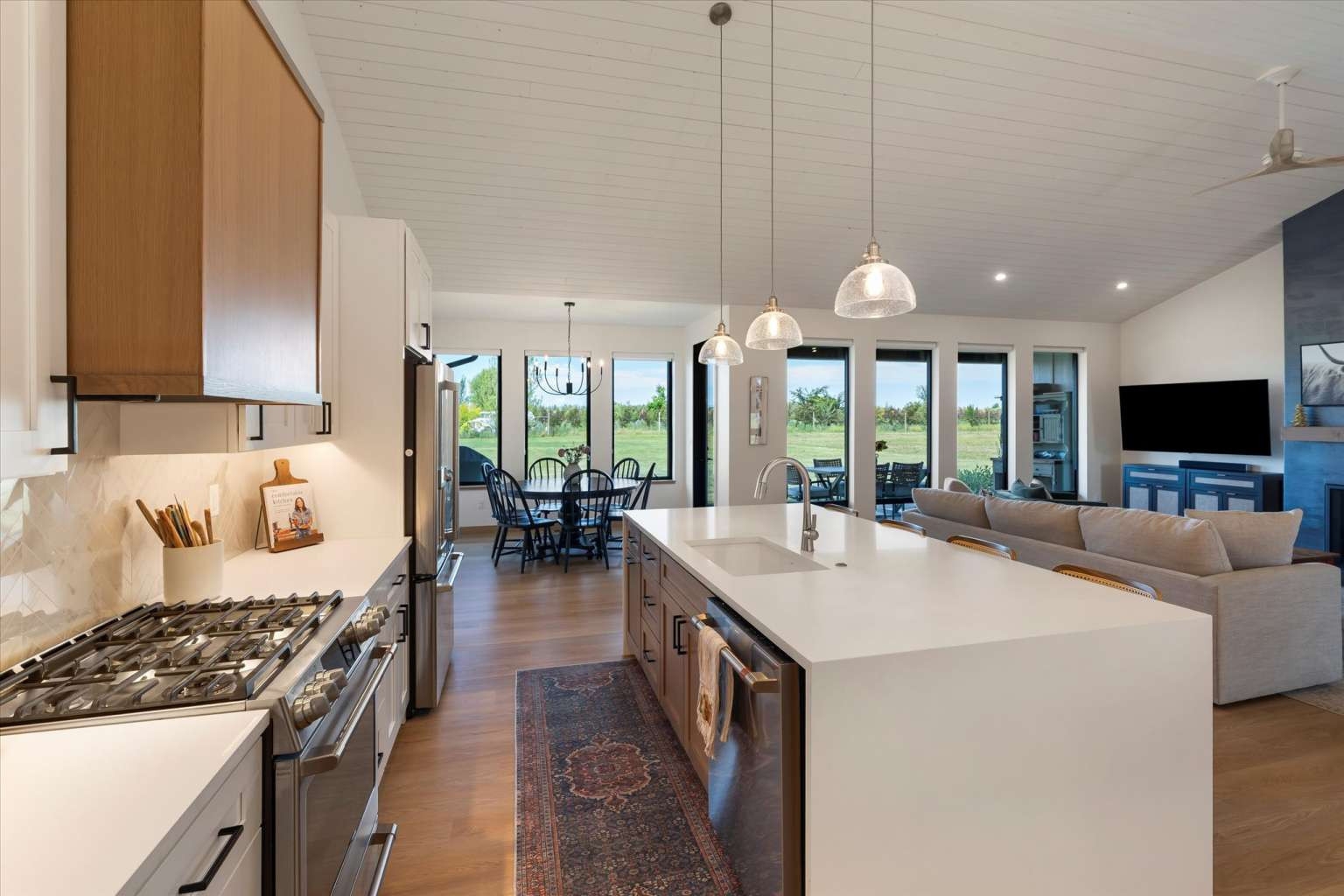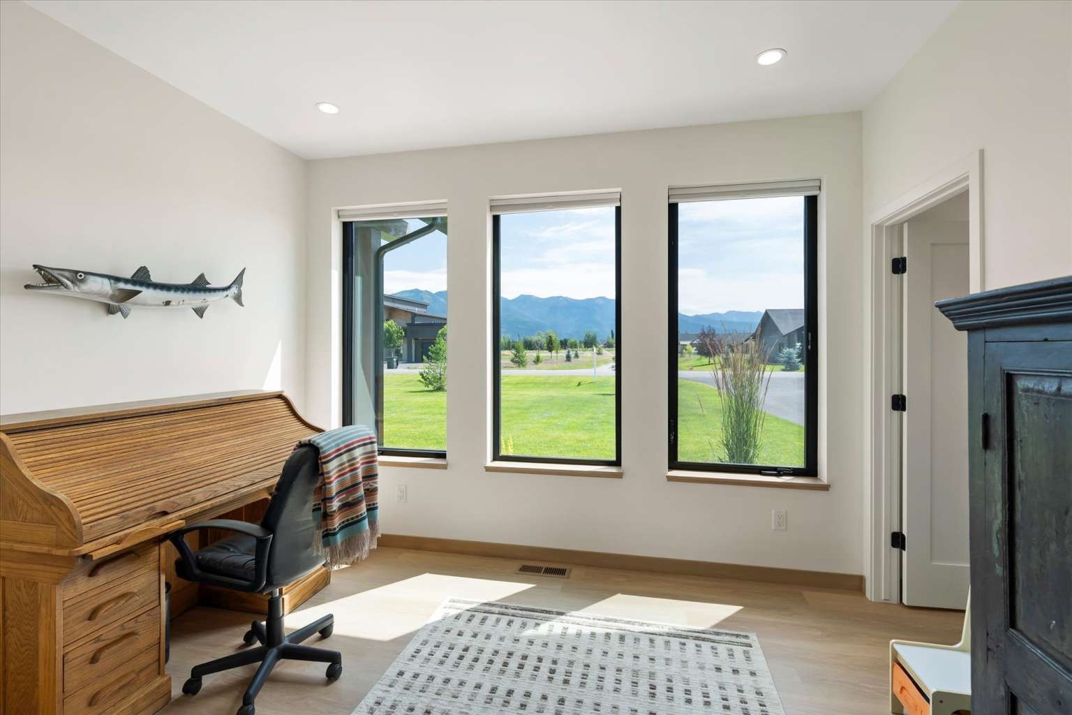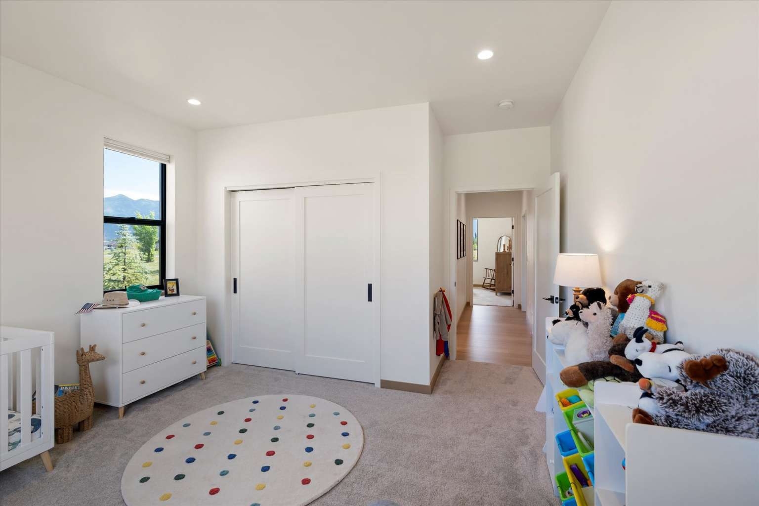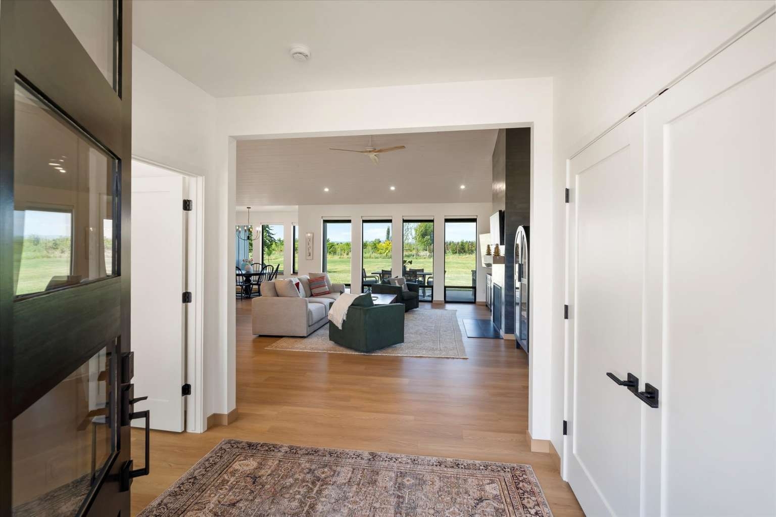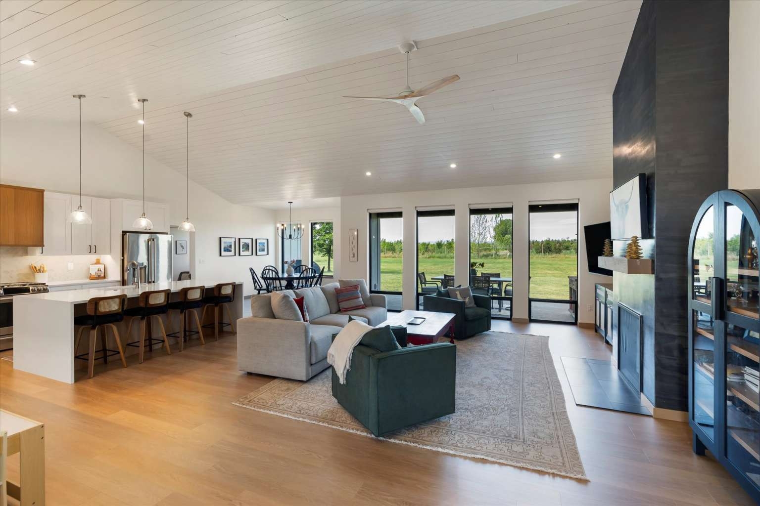 Nearly one acre with mountain views, this 2024 single-level, zero-step home offers modern Montana living just minutes from Kalispell and under 30 minutes from Glacier National Park. Designed for effortless everyday living, the home features vaulted ceilings, floor-to-ceiling windows, and covered front and rear patios that capture the surrounding landscape. The thoughtfully planned layout includes four bedrooms, two and a half bathrooms, a dedicated laundry room, and an inviting living space anchored by a gas fireplace. The kitchen is both functional and stylish, with Cafe appliances, a walk-in pantry, and clean, modern finishes throughout. The primary suite is a private retreat with heated bathroom floors and generous storage. Additional highlights include a heated three-car garage, quality construction, and a move-in-ready interior. Set in a peaceful Creston setting, this home blends comfort, functionality, and space in one of the Flathead Valley’s most desirable locations.