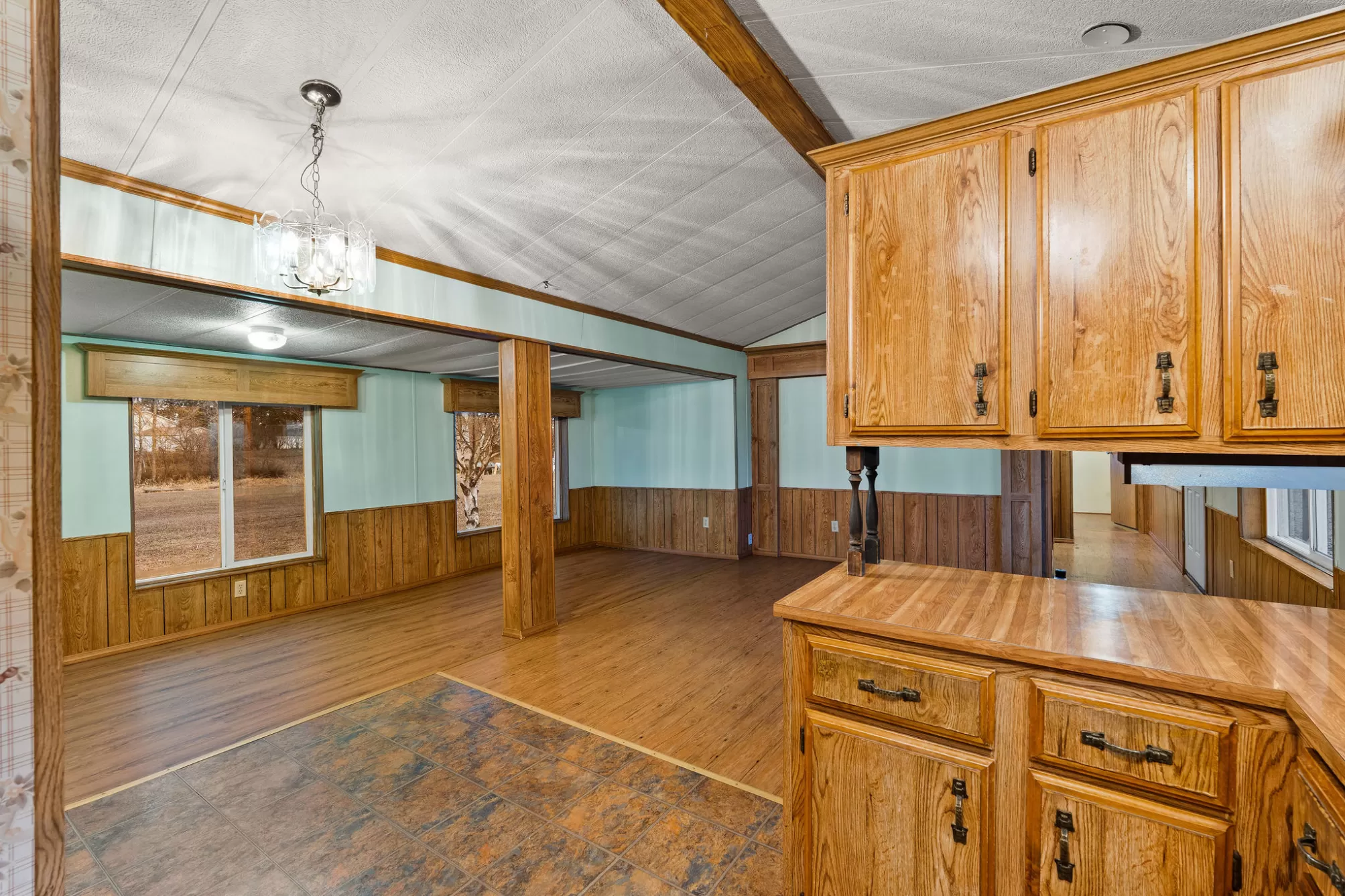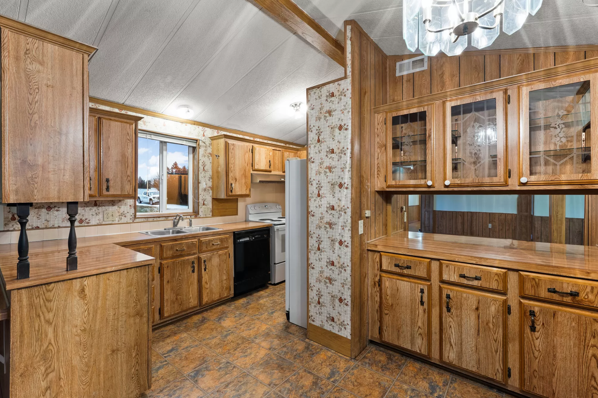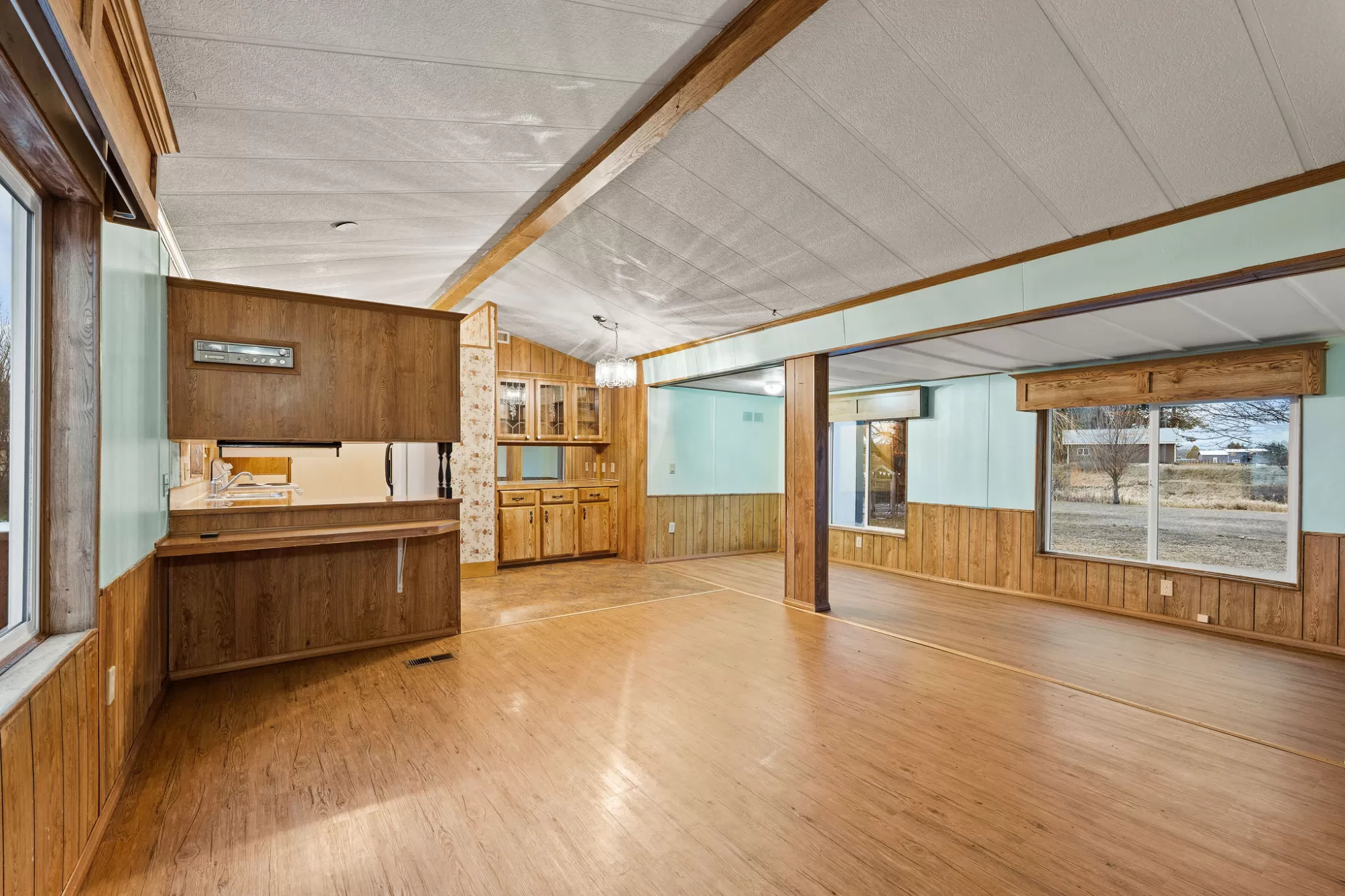 This 1984 Fleetwood Vogue offers a spacious 1,246-square-foot layout featuring 3 bedrooms and 2 bathrooms, making it an ideal choice for affordable housing or a custom renovation project. The interior is defined by a bright, open-concept living area with vaulted ceilings, exposed decorative beams, and classic wood wainscoting that adds a cozy, rustic charm. The functional kitchen includes extensive wood cabinetry and leads into a dining space with a built-in hutch and glass display cases. The primary suite provides a private retreat with built-in storage and an en-suite bathroom featuring a wide vanity with theater-style lighting, while the additional bedrooms offer versatility with integrated shelving and desk spaces. The exterior features durable metal siding and a large wooden deck perfect for taking in the surrounding views. Please be advised that this is a Personal Property Only Listing; no land or real estate is included in the sale. Seller is open to offering concessions to assist the buyer with mobile home relocation costs.