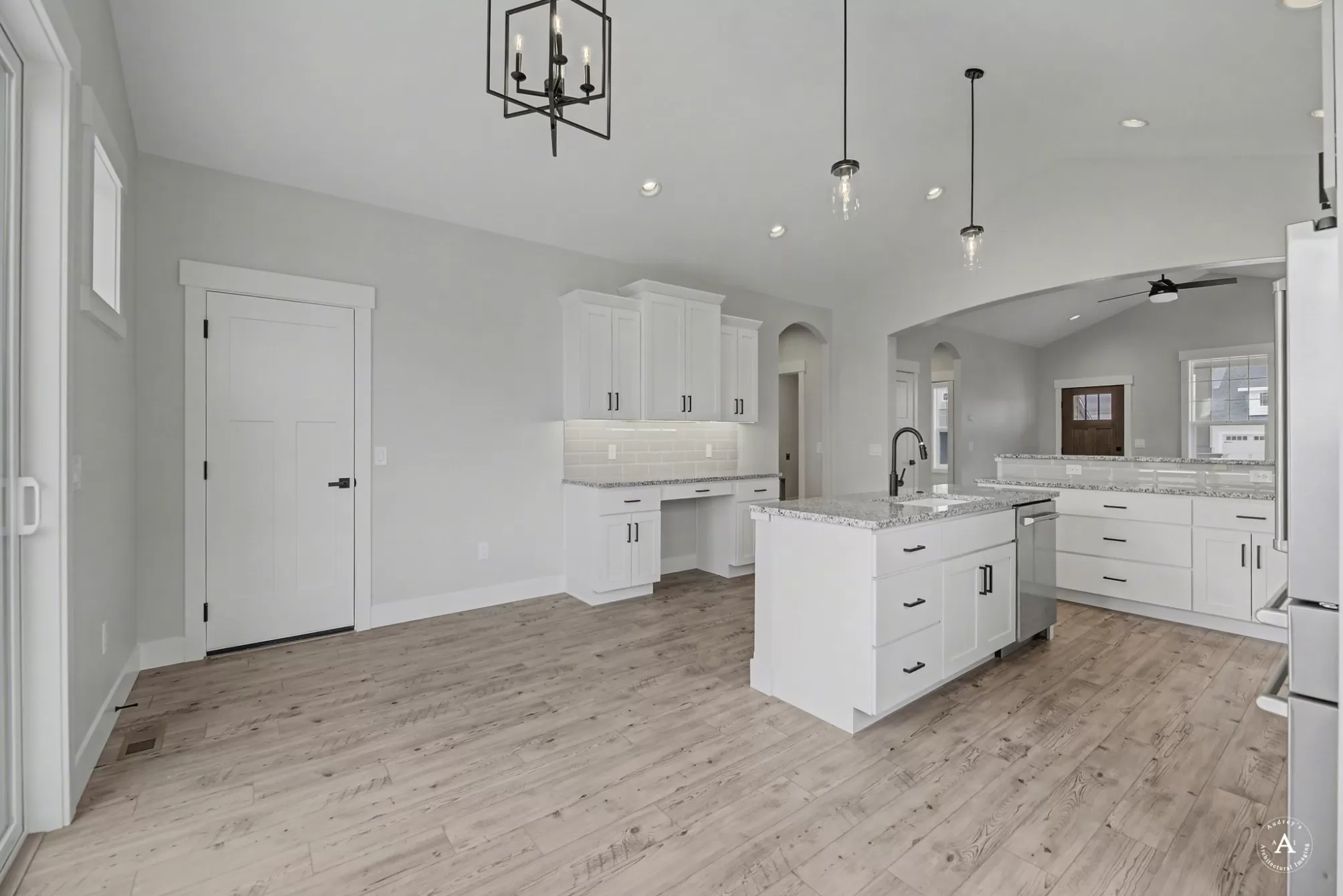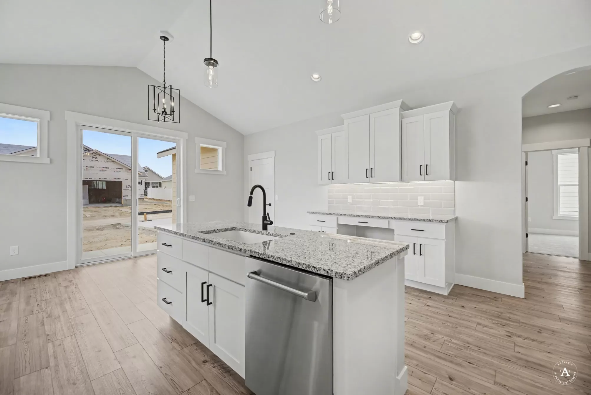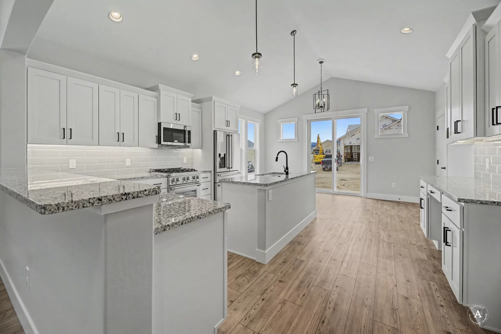 Sierra Custom Home, located in Mountain View Meadows. Imagine gathering in the living room, where the high ceiling enhances the sense of spaciousness, and a fireplace creates a warm and inviting ambiance. The vaulted ceiling adds architectural interest and a touch of grandeur to this central gathering space. The kitchen is truly a chef's dream, featuring stone countertops and shaker cabinets that provide both style and functionality. A large kitchen island stands as a focal point, offering ample space for meal preparation and casual dining, enhanced by a kitchen bar. High-end appliances, including a refrigerator and range oven, promise a delightful cooking experience, complemented by a backsplash that adds a touch of elegance. The open floor plan ensures the kitchen remains connected to the rest of the home, making it perfect for entertaining.