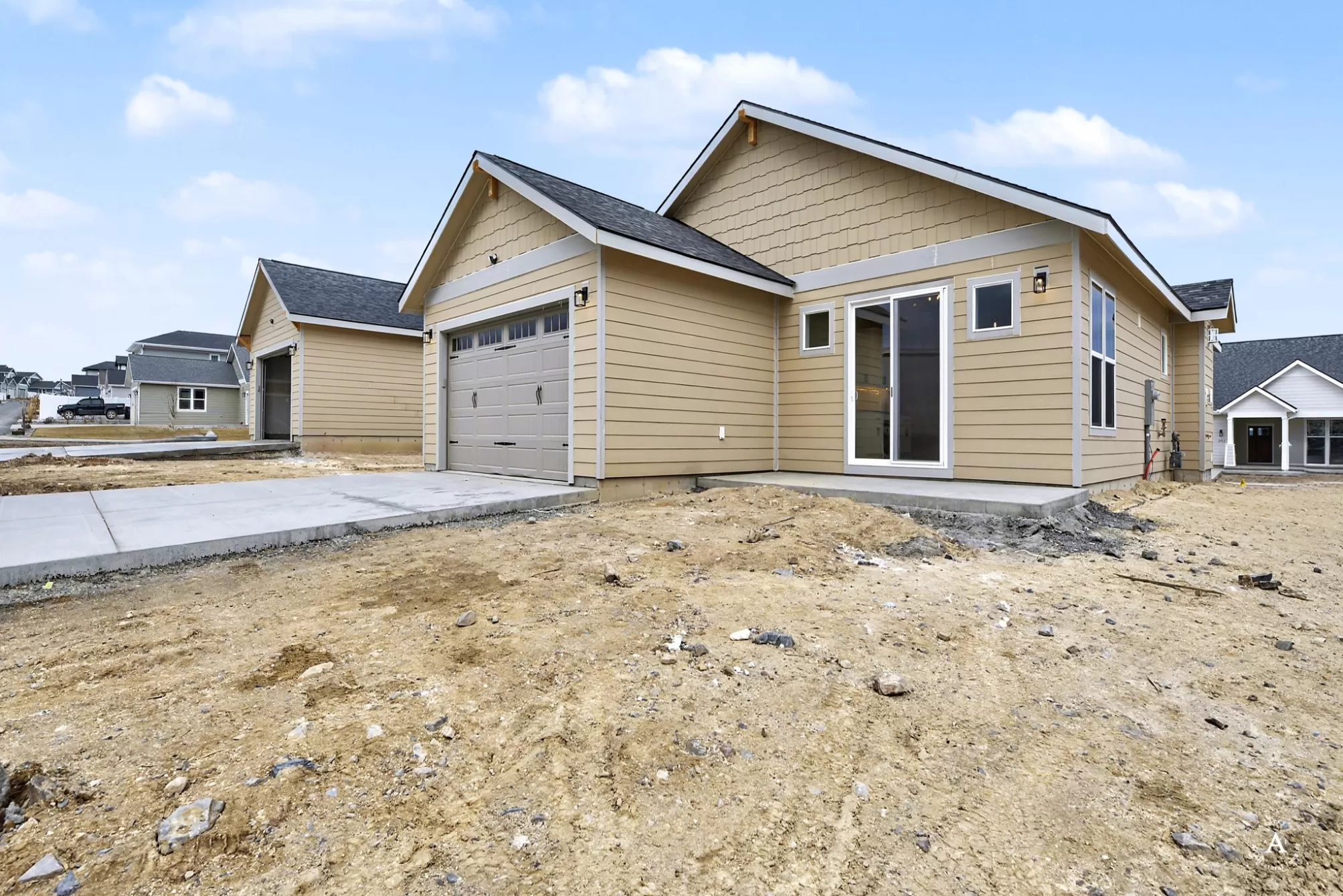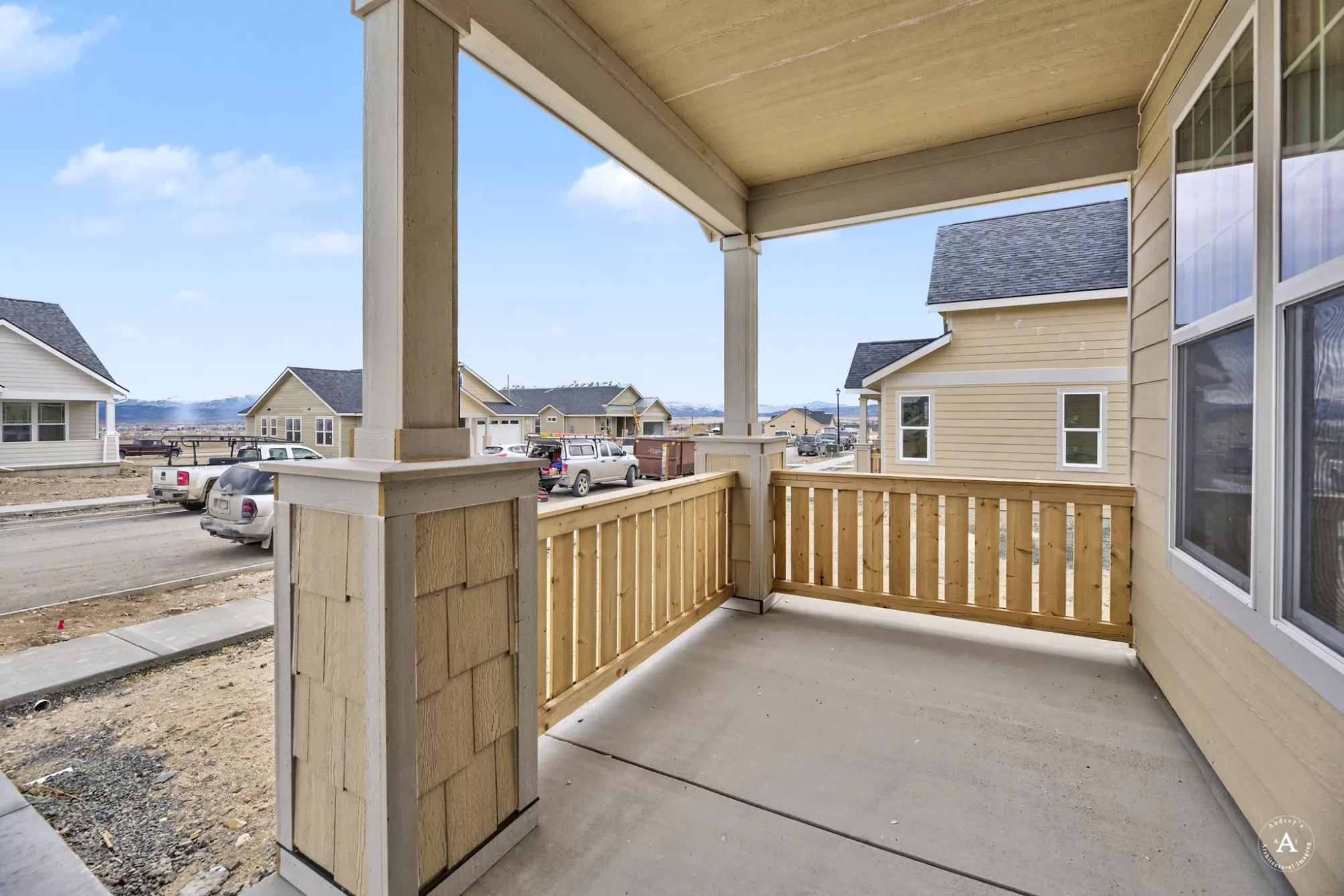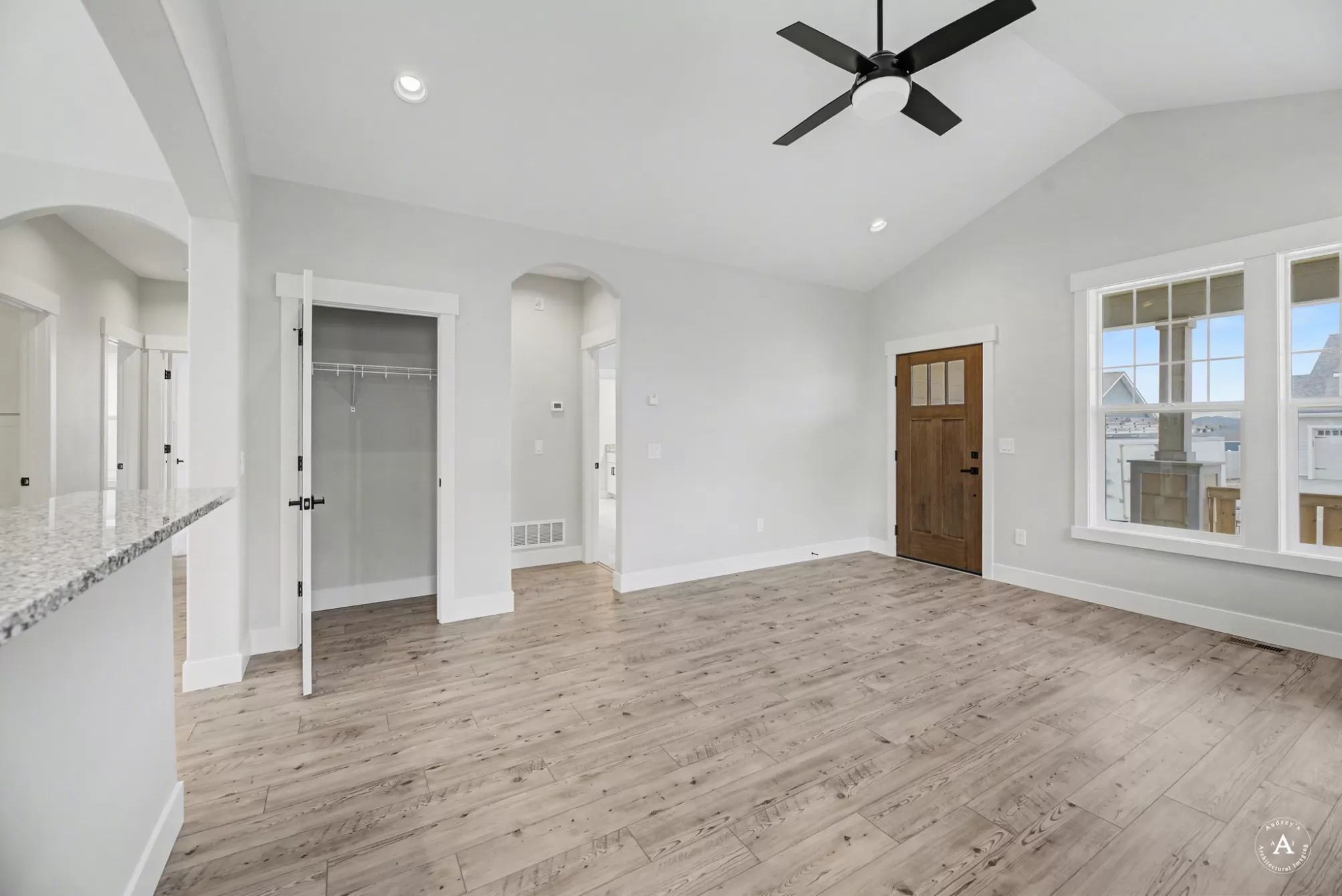 Sierra Custom Home, located in Mountain View Meadows. Imagine gathering in the living room, where the high ceiling enhances the sense of spaciousness, and a fireplace creates a warm and inviting ambiance. The vaulted ceiling adds architectural interest and a touch of grandeur to this central gathering space. The kitchen is truly a chef's dream, featuring stone countertops and shaker cabinets that provide both style and functionality. A large kitchen island stands as a focal point, offering ample space for meal preparation and casual dining, enhanced by a kitchen bar. High-end appliances, including a refrigerator and range oven, promise a delightful cooking experience, complemented by a backsplash that adds a touch of elegance. The open floor plan ensures the kitchen remains connected to the rest of the home, making it perfect for entertaining.