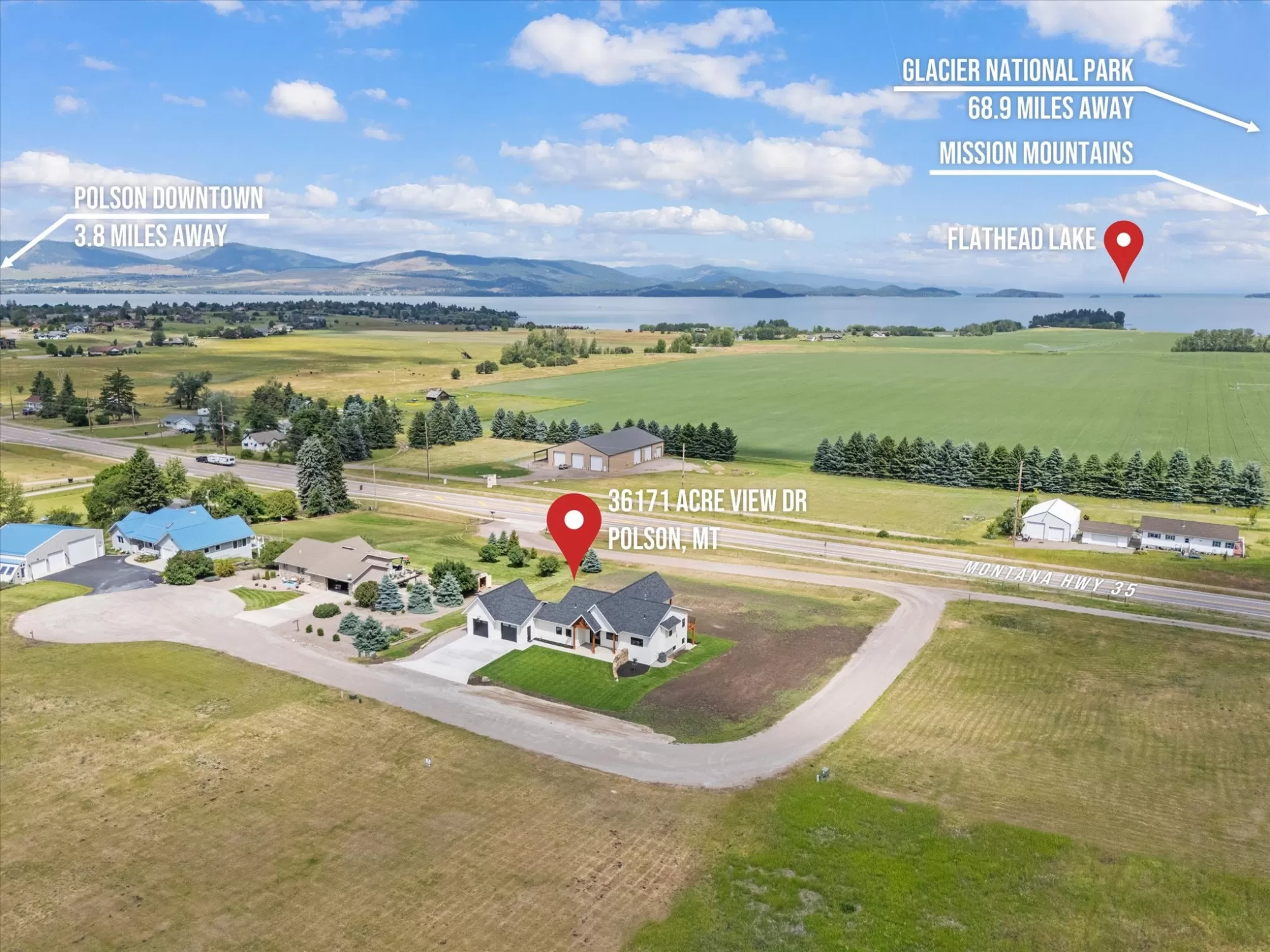 Big Views on Acre View-where nearly an acre of land meets million-dollar views of Flathead Lake and the surrounding mountain ranges. This brand-new mountain modern built home was thoughtfully designed to showcase the scenery with oversized windows, open-concept living, and a seamless indoor-outdoor flow. The main-level primary suite offers private deck access, a spacious walk-in closet, and a spa-inspired bathroom. The walk-out lower level features an additional ensuite, plus a full bath, and third bedroom—perfect for guests or extended living. The kitchen is a chef’s dream with high-end appliances, sleek finishes, and a butcher block pantry for bonus prep and storage space. A 2-car garage adds convenience and room for your Montana toys. ?Conveniently located midway between Glacier Park International Airport & Missoula makes travel a breeze!