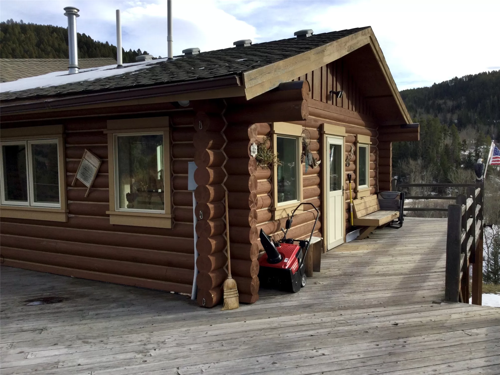 Set on 20.01 acres beneath the sweeping Gallatin Range, this 2,742-square-foot log cabin captures wide-open skies the way a front-row seat captures a sunset — unobstructed and unforgettable. East-facing walls of picture windows frame golden sunrises, drifting clouds, and star-filled nights, while the wraparound deck invites you to slow down and take it all in. Inside, the home feels like a modern mountain lodge. Whitewashed wood and rich flooring reflect natural light throughout the 3-bedroom, 2-bath layout, creating a space that is both warm and airy. The kitchen pairs rustic charm with refined function, featuring stainless KitchenAid appliances, a gas range, and granite countertops. The walk-out daylight basement adds flexibility for guests, entertaining, or quiet retreat. Outside, a single-car garage, storage shed, and dedicated workshop provide room for toys, tools, and passions alike. With a walking easement to Forest Service land, adventure becomes your neighbor.