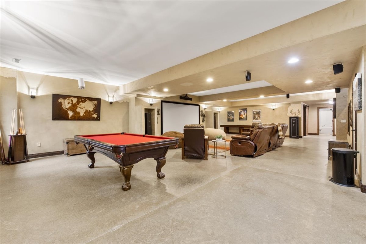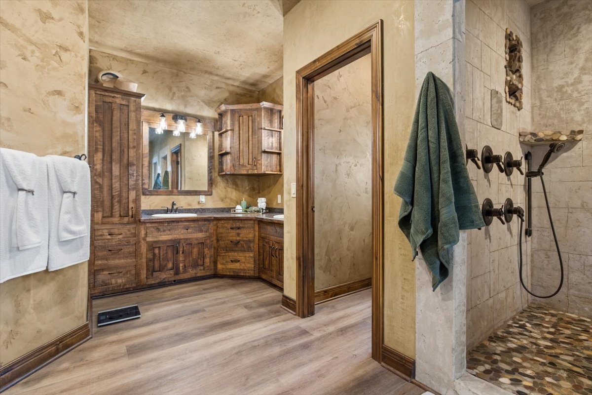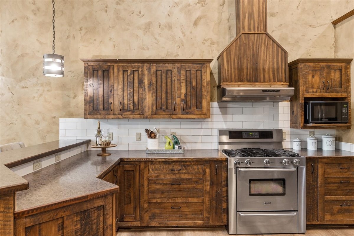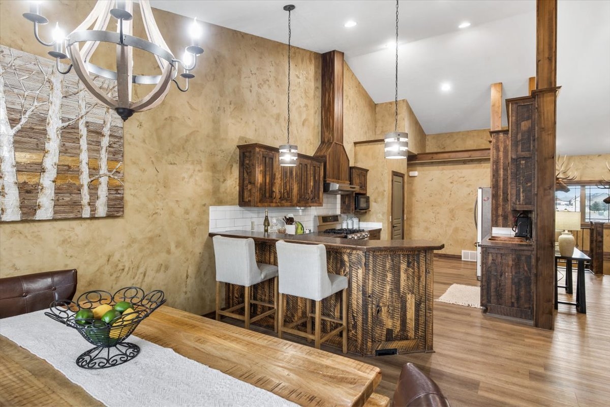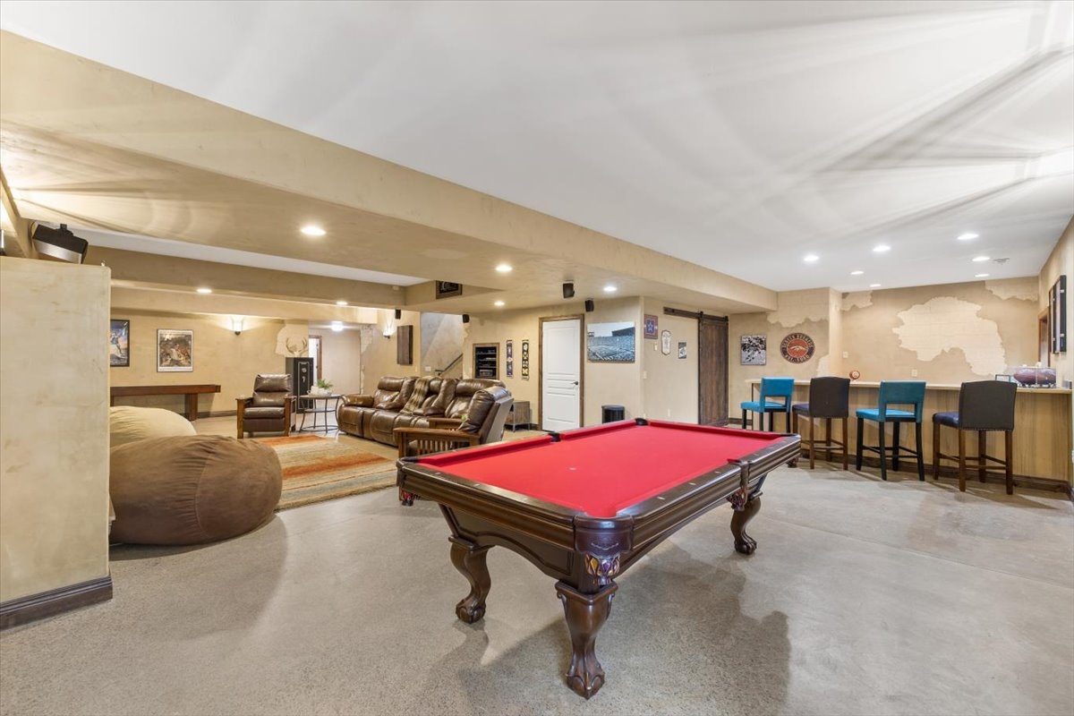 This 4,504 sq. ft. refined rustic residence is a home that welcomes you in and invites you to stay. The main level features three bedrooms and 2.5 baths, including a spacious primary suite with a large spa-like bath, walk-in shower, and his-and-her closets. The kitchen is both functional and striking with hickory cabinetry, stainless steel appliances, a gas range, and generous space designed for gathering. The lower level is designed for entertainment and relaxation, offering two additional bedrooms and a full bath, a weight room, hobby room, along with an impressive theater room and bar area. A large screen and sound system create the ultimate movie-night experience, with ample room for hosting family and friends. Adding exceptional versatility is a shop with approximately 1,800 sq ft (+/-) of livable space, featuring two bedrooms, a full bathroom, full kitchen, washer and dryer, and radiant heat and air conditioning—ideal for guests, family, or potential income opportunities.