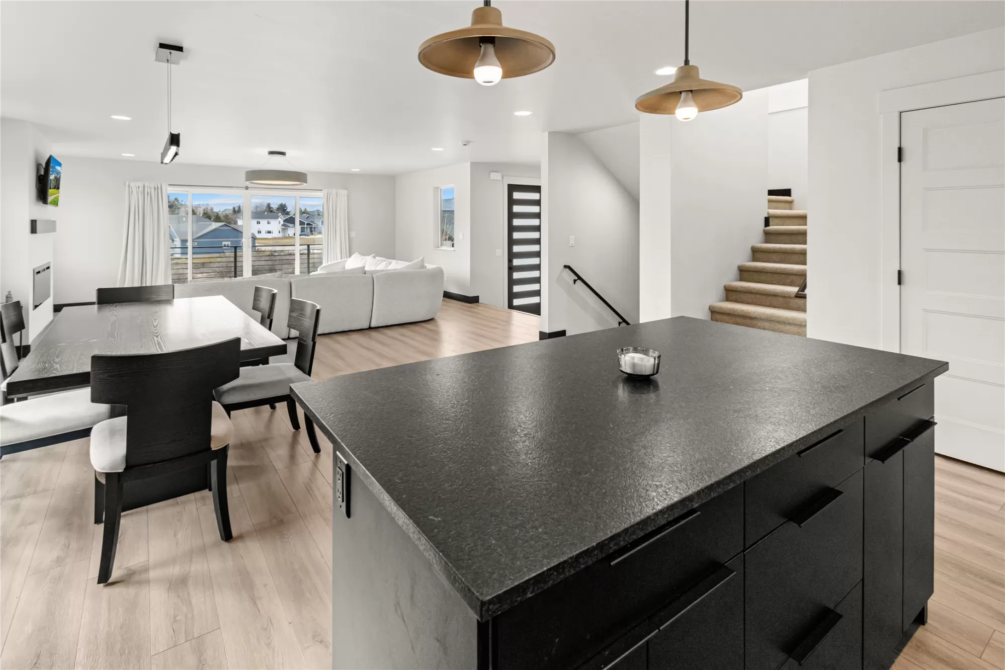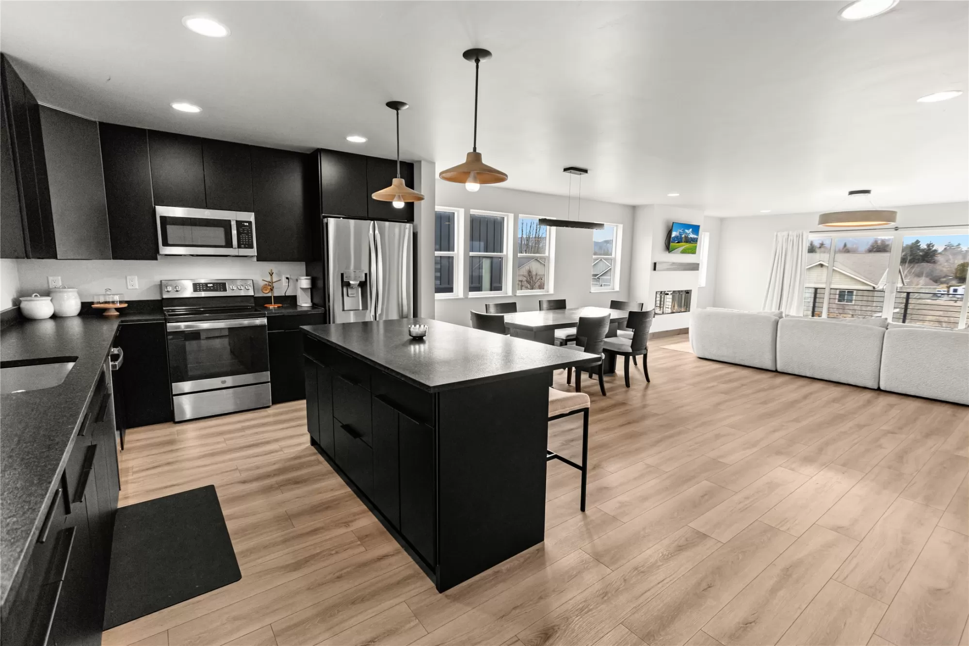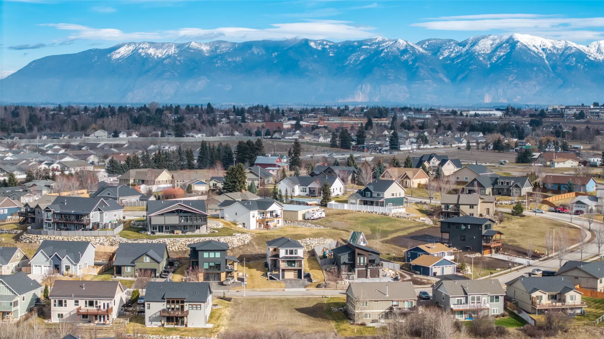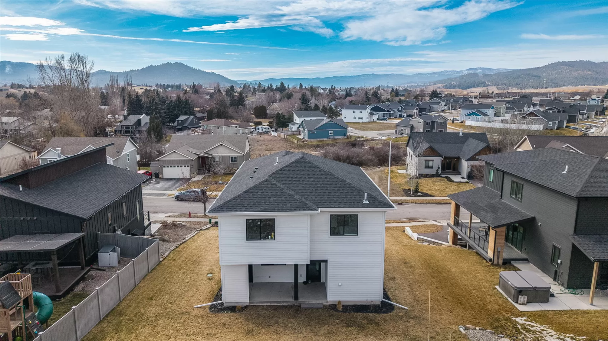 Built in 2024, this stunning mountain modern home is ready for new ownership and offers a bright, contemporary design in a convenient Kalispell location. An abundance of natural light fills the home, highlighting custom finishes and beautiful designer light fixtures throughout. The main living area features an open concept kitchen, dining, and living space, along with a powder bathroom, laundry room, and walk-in pantry, ideal for everyday living and entertaining. The bedroom level offers three spacious bedrooms, each with a walk-in closet, including a beautiful primary suite with a large walk-in closet and en suite bath. An oversized two-car garage provides additional space perfect for a workshop or workout area. Modern touches such as granite countertops, a tiled shower, and an outdoor gas BBQ complete this thoughtfully designed Mountain Modern home.