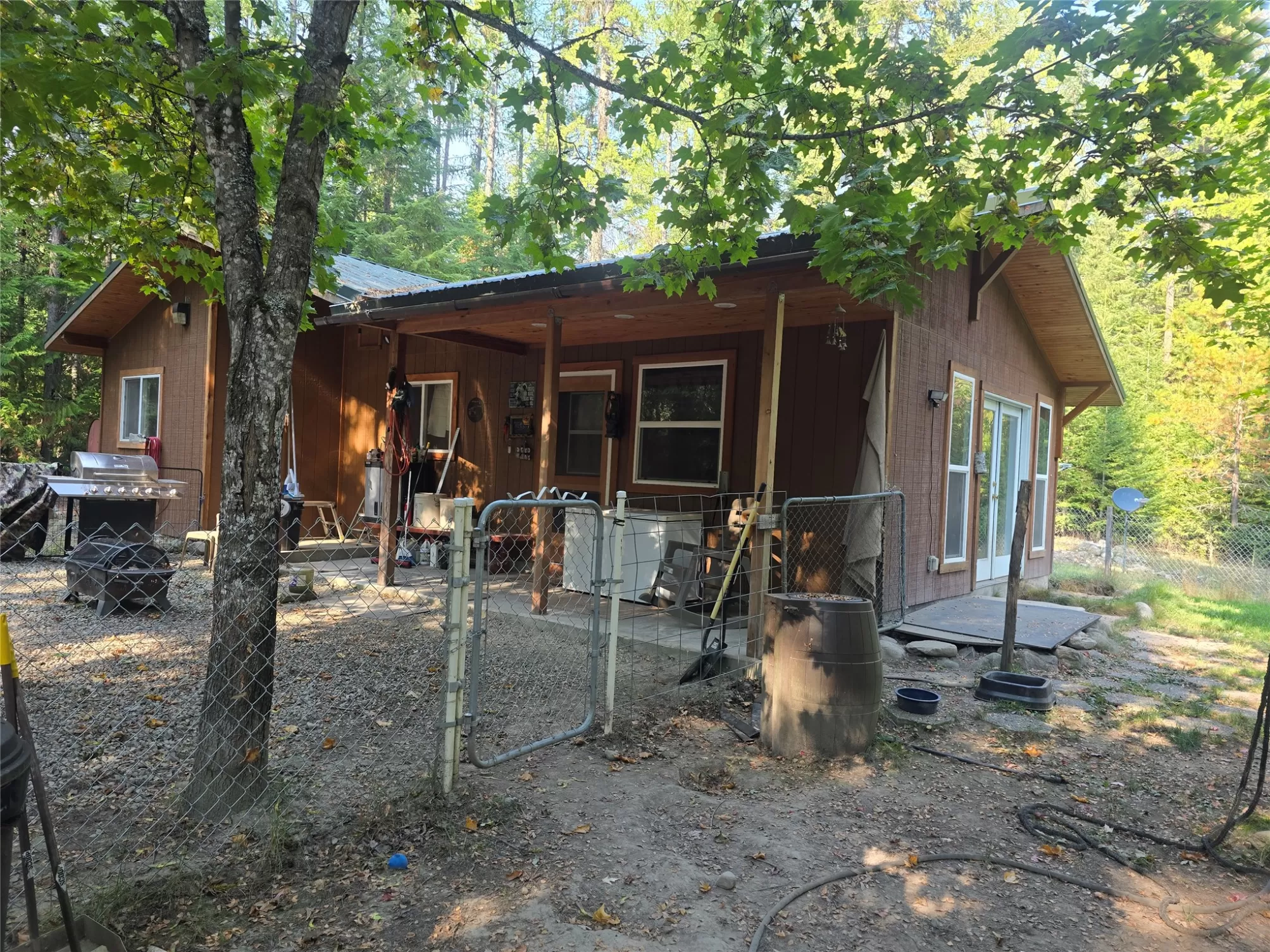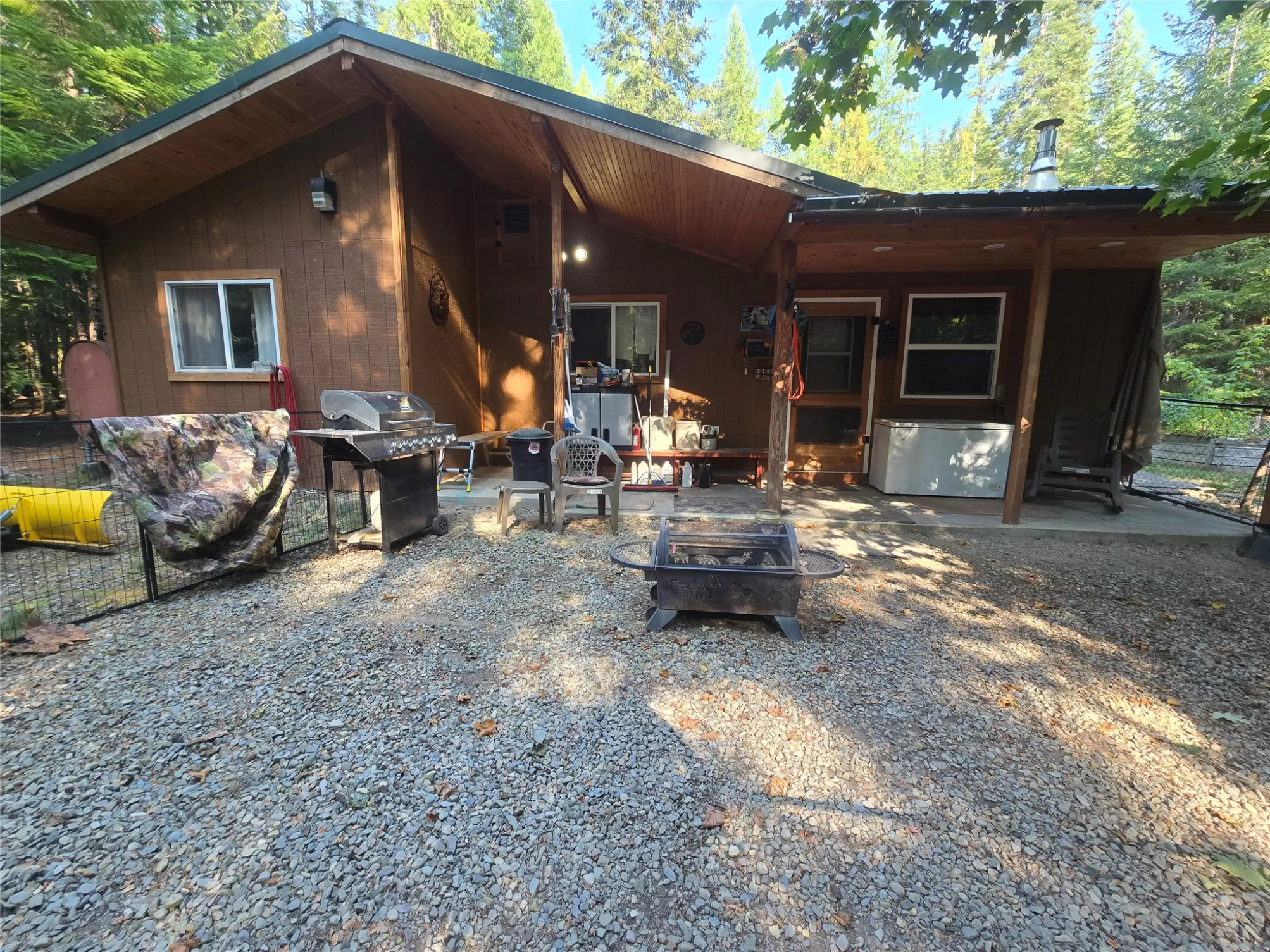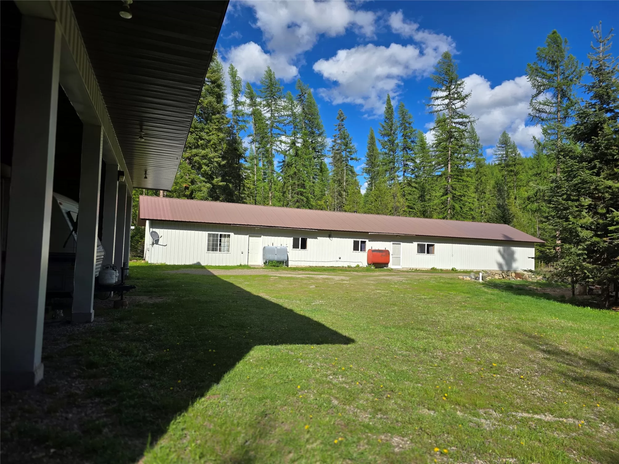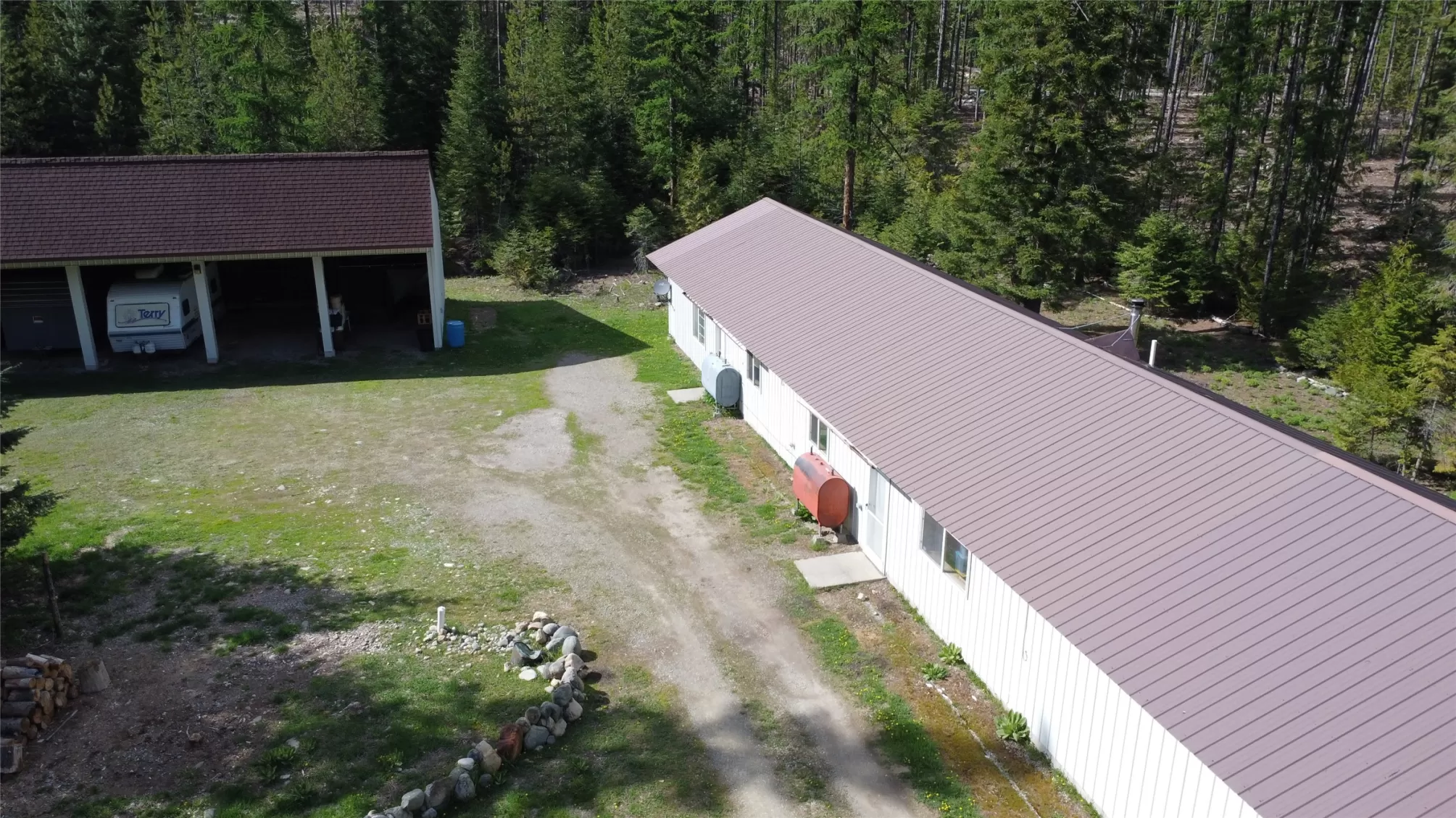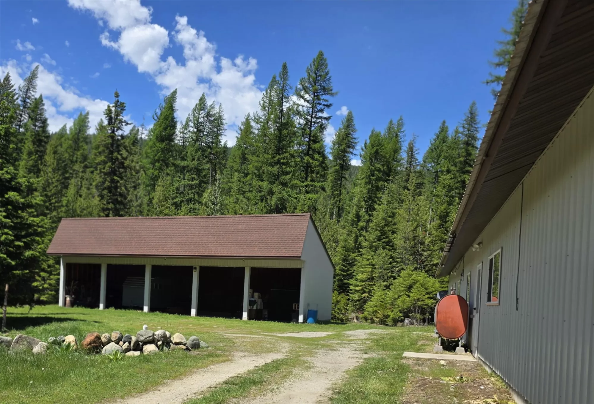 The Yaak River peacefully rolls along a quiet corner backed by Kootenai National Forest. This 7 acre parcel is valuable in itself, but also hosts a (1044 sq ft) 2 bedroom, 1 bath home with a wood stove and fuel oil heater. A large back-up generator shed, and another shed is close by it. Just out of view, tucked into pretty meadow among the trees is another, larger home / 2016 sq ft building with an oversized attached garage, bathrooms, bedrooms, kitchen area, storage rooms, great rooms. This home is so large and nicely laid out that it could easily be divided into 2 separate living areas. Because it is so big and single level, it would be great for a person needing one level/ease of access. A massive 5 stall 2592 sq ft carport can house a lot of toys. RV Plug in, additional outbuildings... The carport/meadow area could be easily converted to a horse property. Use your imagination - whatever your need, the value in the land/structures will be hard to match anything else! Both homes have 3 sources of heat. There are electric wall heaters, free-standing fuel oil furnaces, and free-standing wood stoves. The primary power source is electric. The back-up generator is a Kubota diesel generator that powers both places. There is an RV electric hook up on the property. The 5-stall car port is a nice, well-constructed building that could be enclosed for a shop too.