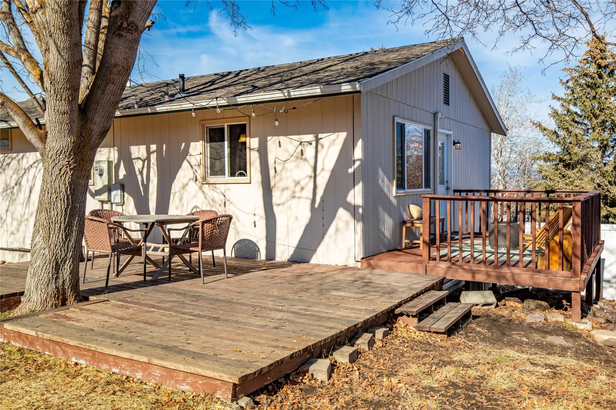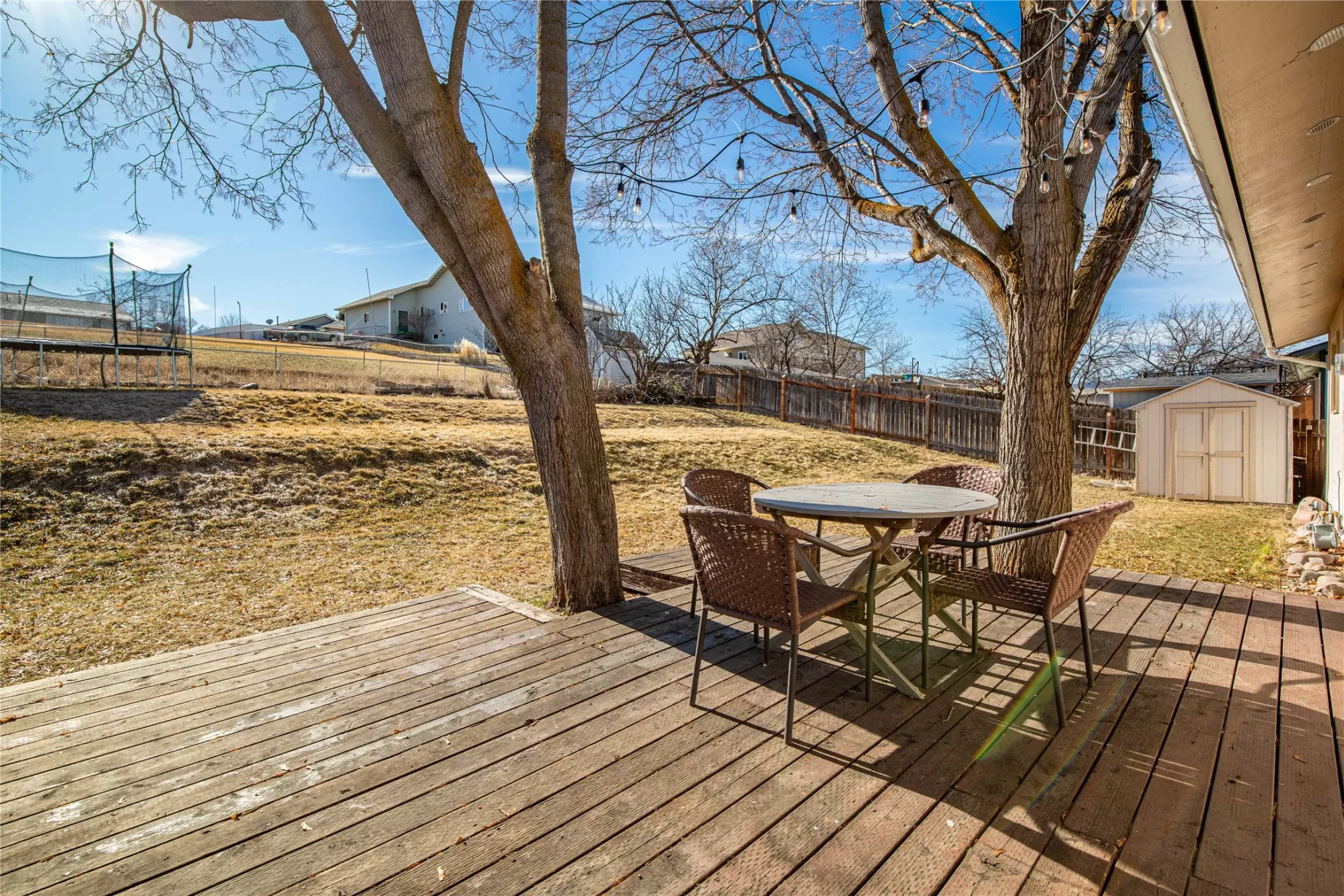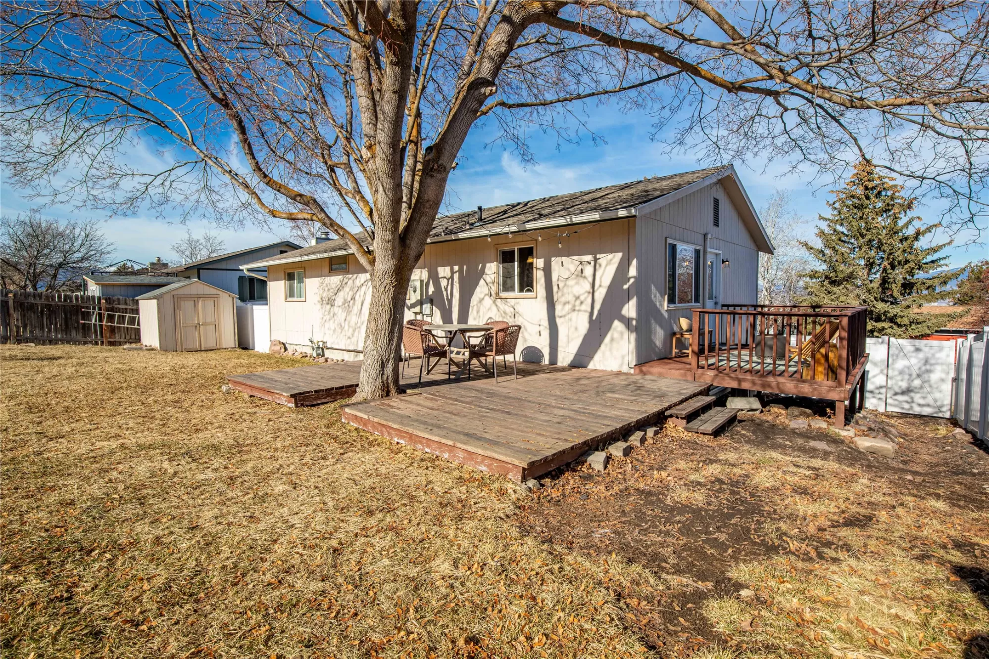 This inviting home features an open kitchen, dining and living room floor plan with brand new white oak LVP flooring. With 3 bedrooms and the laundry down the hall, this home is functional for everyday living. The lower level offers a cozy family room and another 4th Bedroom, with a newer Egress Window. Thoughtful touches add charm throughout, including crown molding on the kitchen cabinets, a beautiful cathedral ceiling in the Living Room and a built-in dining room bench for entertaining. Step outside to a backyard designed for enjoyment, with open views and no back home above you, peering in, offering a wonderful sense of privacy, compared to your neighbors. Mature shade trees create the perfect backdrop for summer picnics and gatherings on the wraparound deck. A garden shed provides extra storage, and the terraced yard offers flat, usable spaces for kids, toys, playtime, or outdoor fun. All of this is just a short walk to Skyview Park, making it easy to enjoy the outdoors and neighborhood lifestyle.