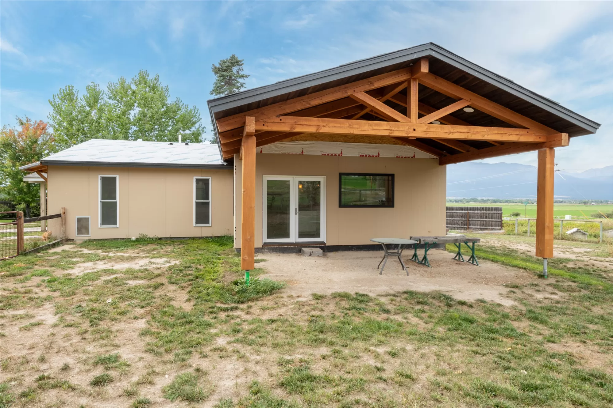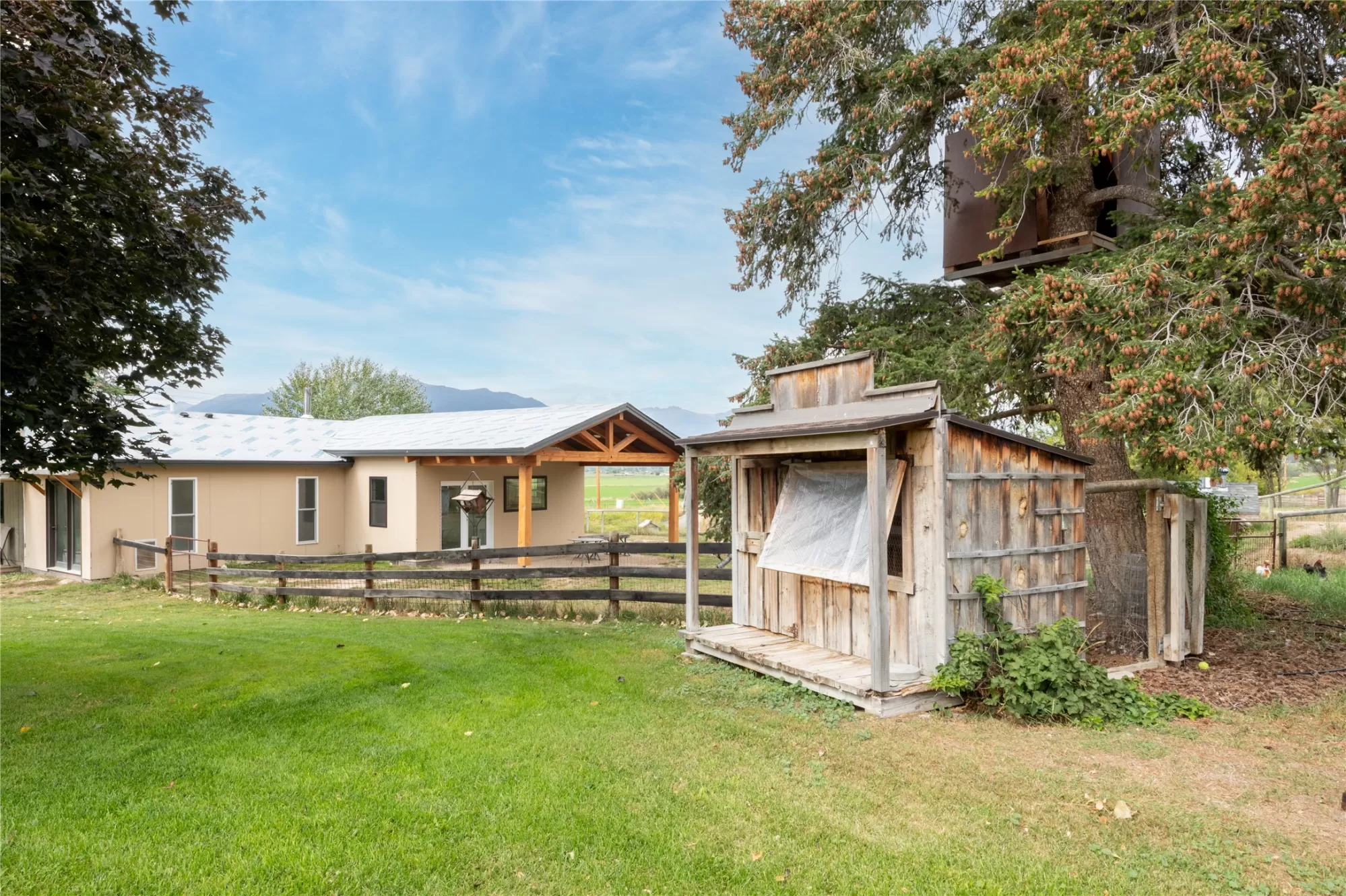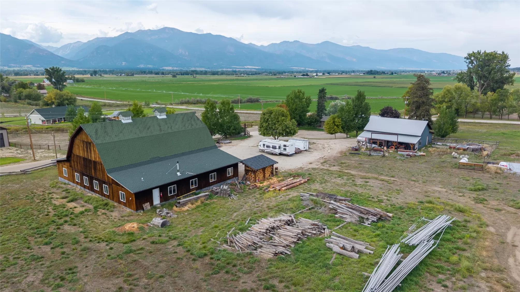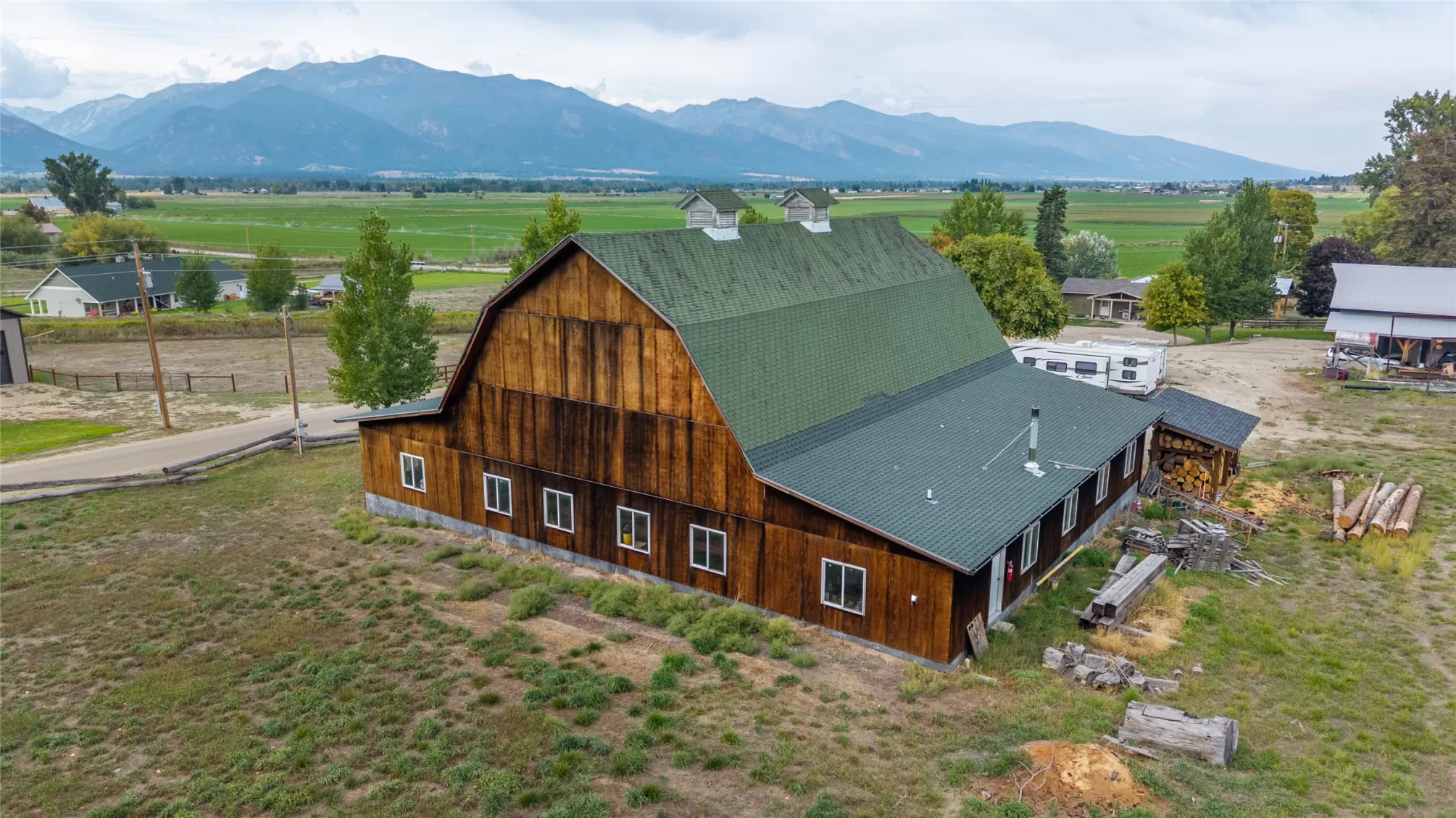 Located in the heart of Montana's renowned Bitterroot Valley, this unique 5-acre property offers privacy, space, and exceptional potential in the Stevensville area known for its scenic beauty, agricultural roots, and access to year-round recreation. Surrounded by wide-open skies, mountain views, and productive land, this setting truly captures the Montana lifestyle. The single-family home features 2 bedrooms and 1 full bath, with the start of a magnificent kitchen already in place, highlighted by gorgeous cabinetry and ready for completion. A cozy living area with a wood stove creates a warm gathering space, while the covered back patio invites you to slow down and take in the peaceful valley surroundings. Spanning two irrigated parcels, the property offers flexibility for future plans. The land includes apple trees in the backyard, open pasture space, an adorable chicken coop, and privacy fencing ideal for a small-scale agricultural lifestyle or room to expand. Outbuildings are a standout feature. A 1,200 sq ft shop provides ample workspace and includes a small office ideal for reloading or hobby use. The true showpiece is the impressive 4,500 sq ft timber-framed barn, complete with a half bath and exceptional craftsmanship. The scale, structure, and versatility of this space open the door to countless possibilities, from an incredible workshop to a future venue or creative retreat. This is a property that truly must be seen in person to appreciate the sense of space, the setting, and the unique opportunities it offers. Located just minutes from historic downtown Stevensville and surrounded by everything the Bitterroot Valley has to offer, this very special place is ready for the right person to complete their dream.