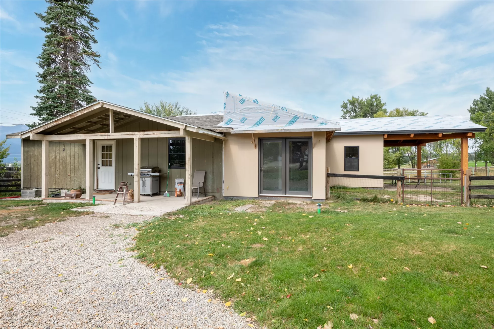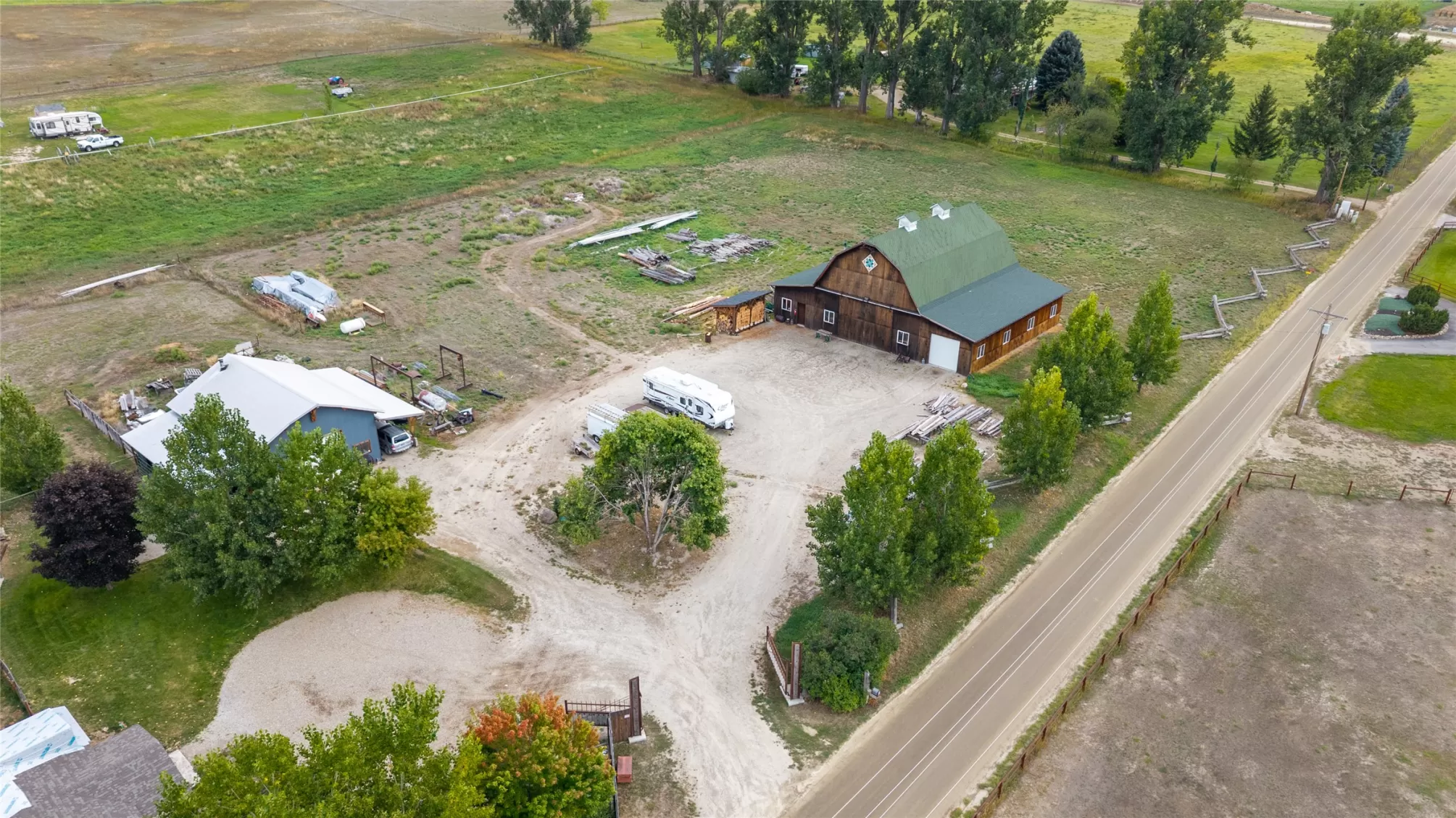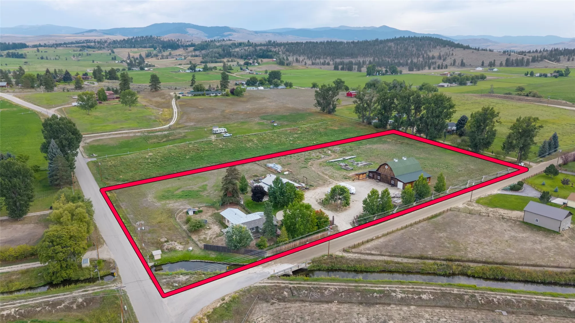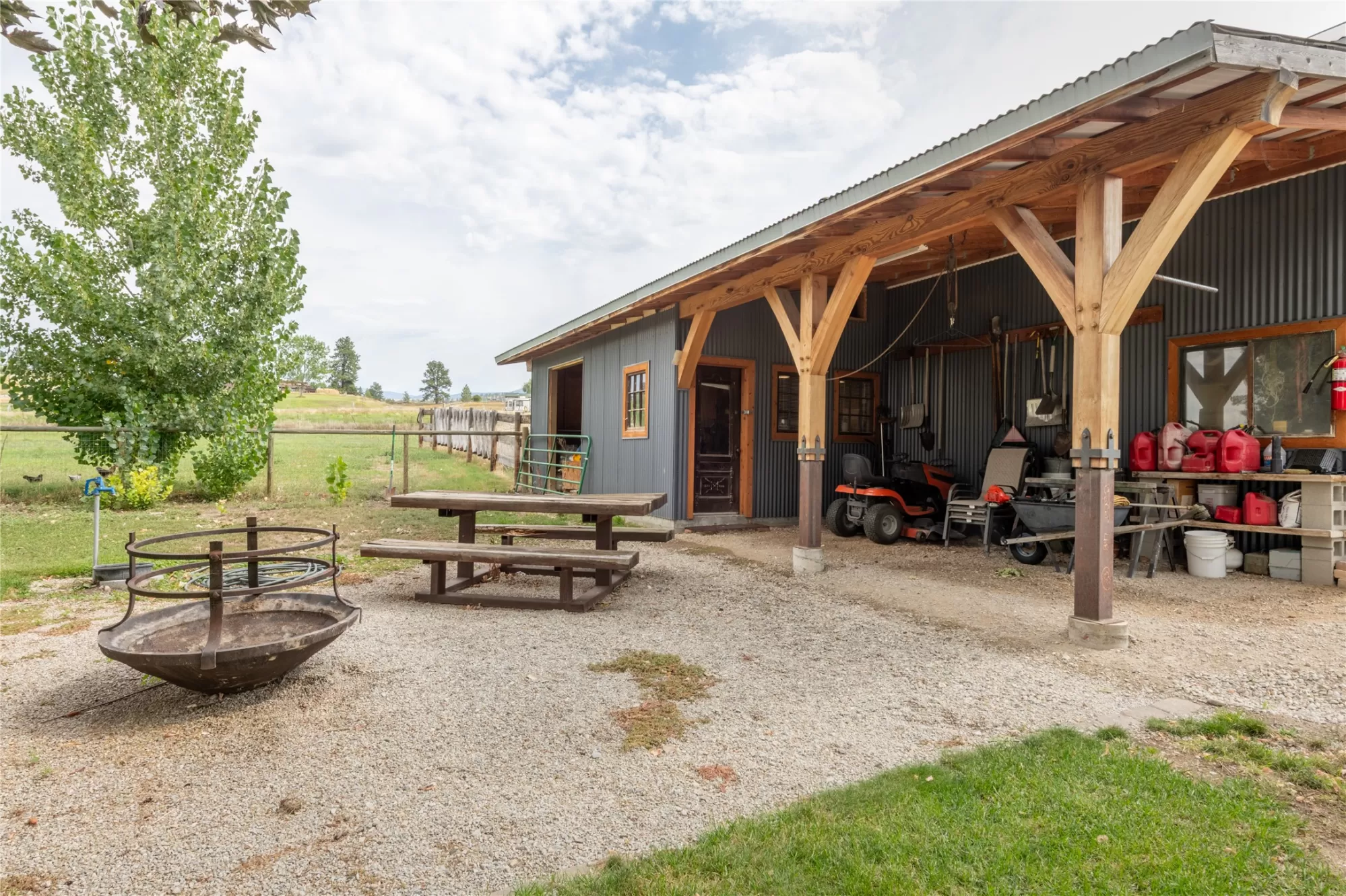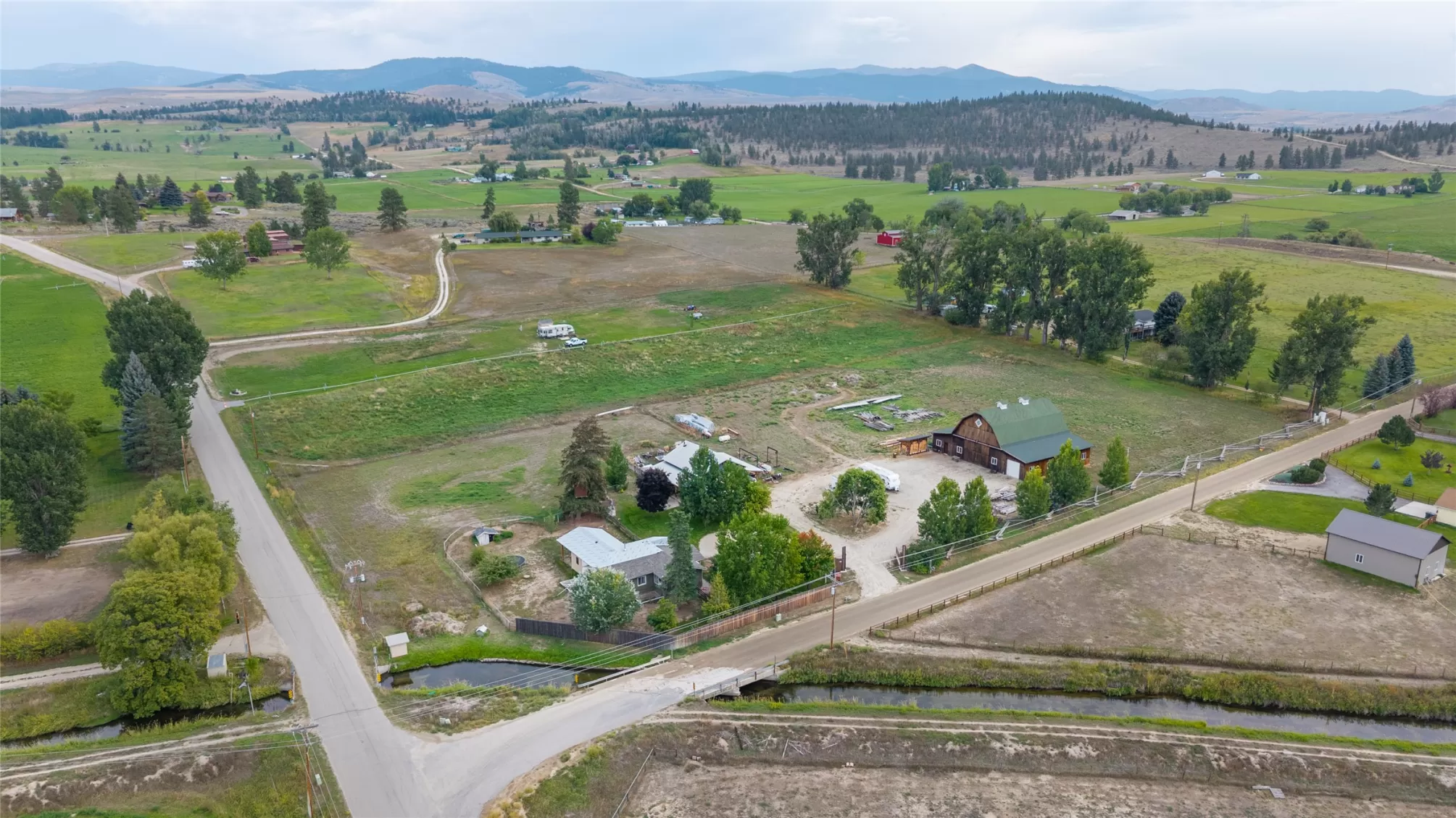 Located in the heart of Montana's renowned Bitterroot Valley, this unique 5-acre property offers privacy, space, and exceptional potential in the Stevensville area known for its scenic beauty, agricultural roots, and access to year-round recreation. Surrounded by wide-open skies, mountain views, and productive land, this setting truly captures the Montana lifestyle. The single-family home features 2 bedrooms and 1 full bath, with the start of a magnificent kitchen already in place, highlighted by gorgeous cabinetry and ready for completion. A cozy living area with a wood stove creates a warm gathering space, while the covered back patio invites you to slow down and take in the peaceful valley surroundings. Spanning two irrigated parcels, the property offers flexibility for future plans. The land includes apple trees in the backyard, open pasture space, an adorable chicken coop, and privacy fencing ideal for a small-scale agricultural lifestyle or room to expand. Outbuildings are a standout feature. A 1,200 sq ft shop provides ample workspace and includes a small office ideal for reloading or hobby use. The true showpiece is the impressive 4,500 sq ft timber-framed barn, complete with a half bath and exceptional craftsmanship. The scale, structure, and versatility of this space open the door to countless possibilities, from an incredible workshop to a future venue or creative retreat. This is a property that truly must be seen in person to appreciate the sense of space, the setting, and the unique opportunities it offers. Located just minutes from historic downtown Stevensville and surrounded by everything the Bitterroot Valley has to offer, this very special place is ready for the right person to complete their dream.