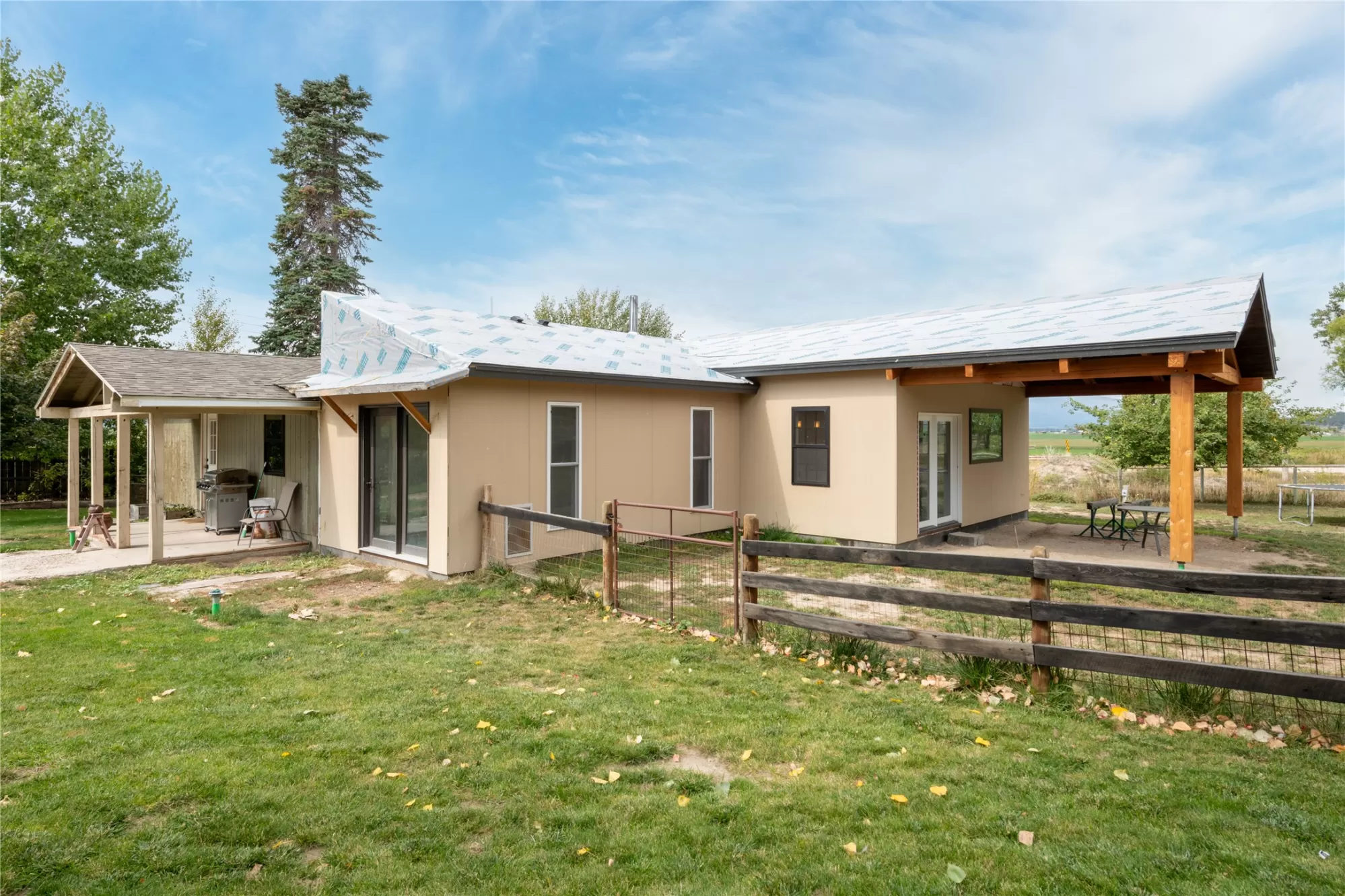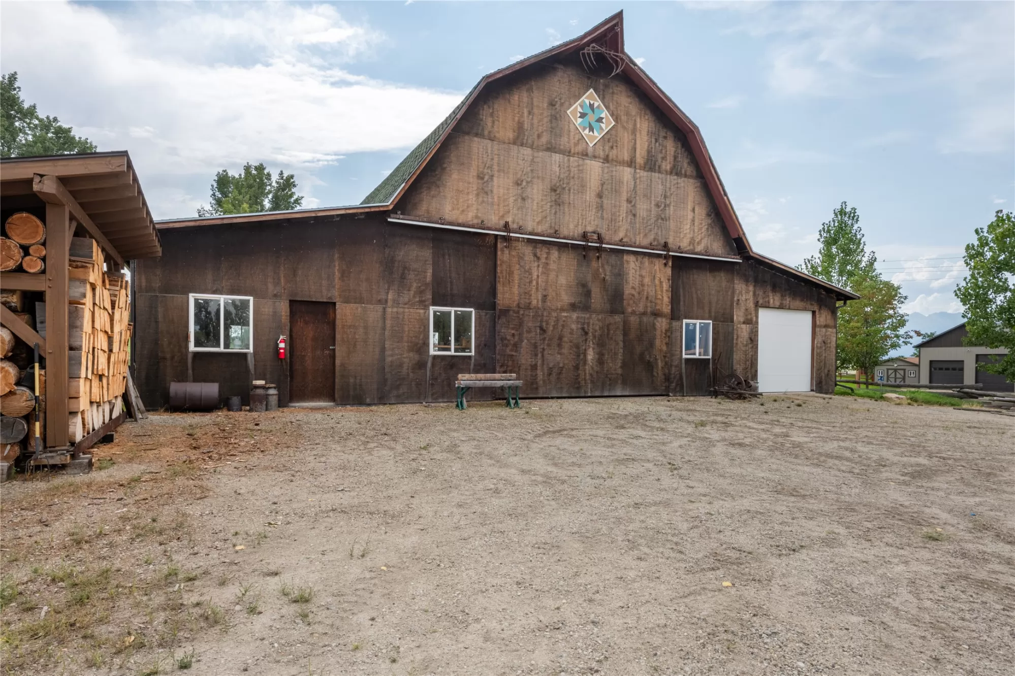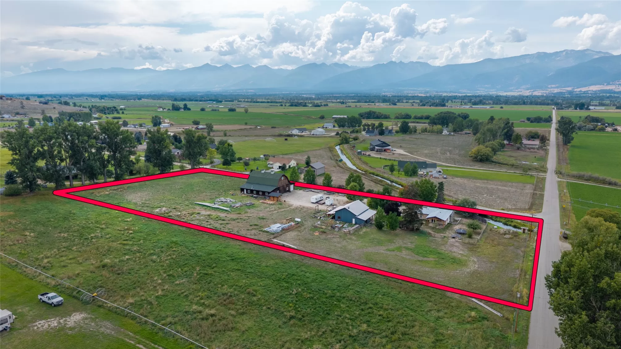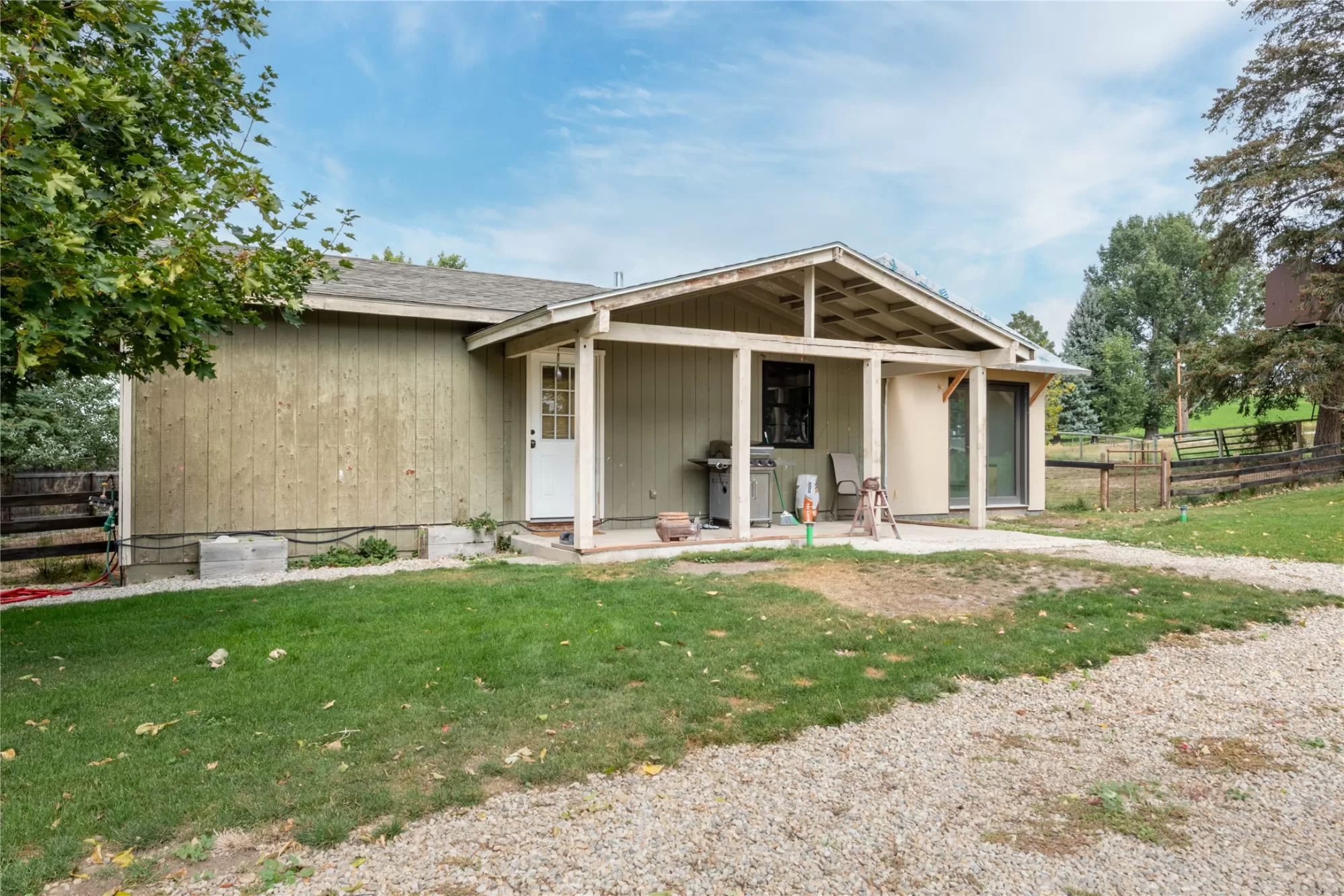 Located in the heart of Montana's renowned Bitterroot Valley, this unique 5-acre property offers privacy, space, and exceptional potential in the Stevensville area known for its scenic beauty, agricultural roots, and access to year-round recreation. Surrounded by wide-open skies, mountain views, and productive land, this setting truly captures the Montana lifestyle. The single-family home features 2 bedrooms and 1 full bath, with the start of a magnificent kitchen already in place, highlighted by gorgeous cabinetry and ready for completion. A cozy living area with a wood stove creates a warm gathering space, while the covered back patio invites you to slow down and take in the peaceful valley surroundings. Spanning two irrigated parcels, the property offers flexibility for future plans. The land includes apple trees in the backyard, open pasture space, an adorable chicken coop, and privacy fencing ideal for a small-scale agricultural lifestyle or room to expand. Outbuildings are a standout feature. A 1,200 sq ft shop provides ample workspace and includes a small office ideal for reloading or hobby use. The true showpiece is the impressive 4,500 sq ft timber-framed barn, complete with a half bath and exceptional craftsmanship. The scale, structure, and versatility of this space open the door to countless possibilities, from an incredible workshop to a future venue or creative retreat. This is a property that truly must be seen in person to appreciate the sense of space, the setting, and the unique opportunities it offers. Located just minutes from historic downtown Stevensville and surrounded by everything the Bitterroot Valley has to offer, this very special place is ready for the right person to complete their dream.