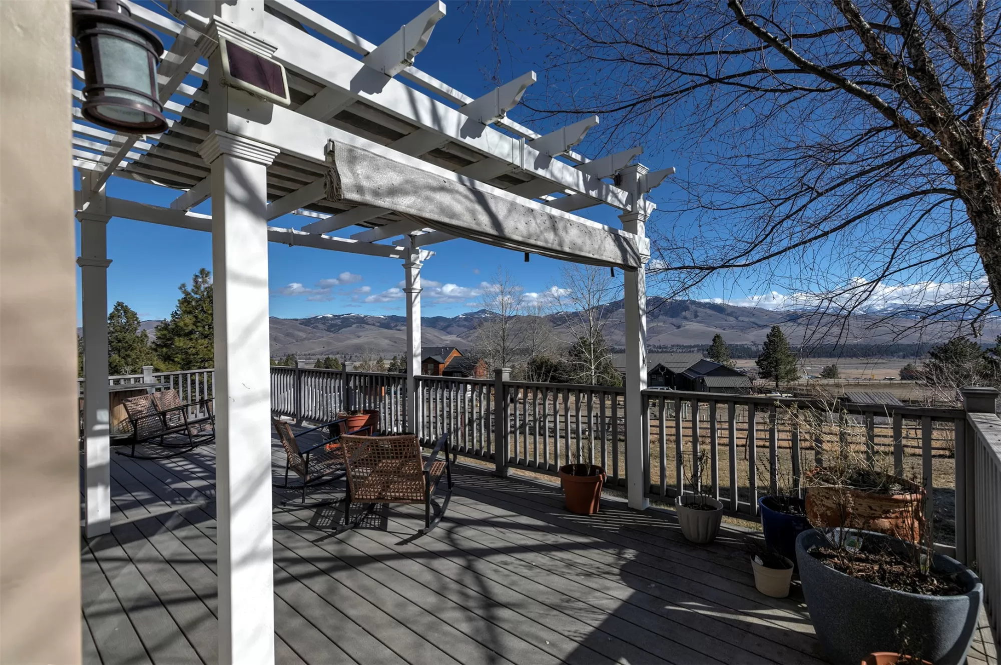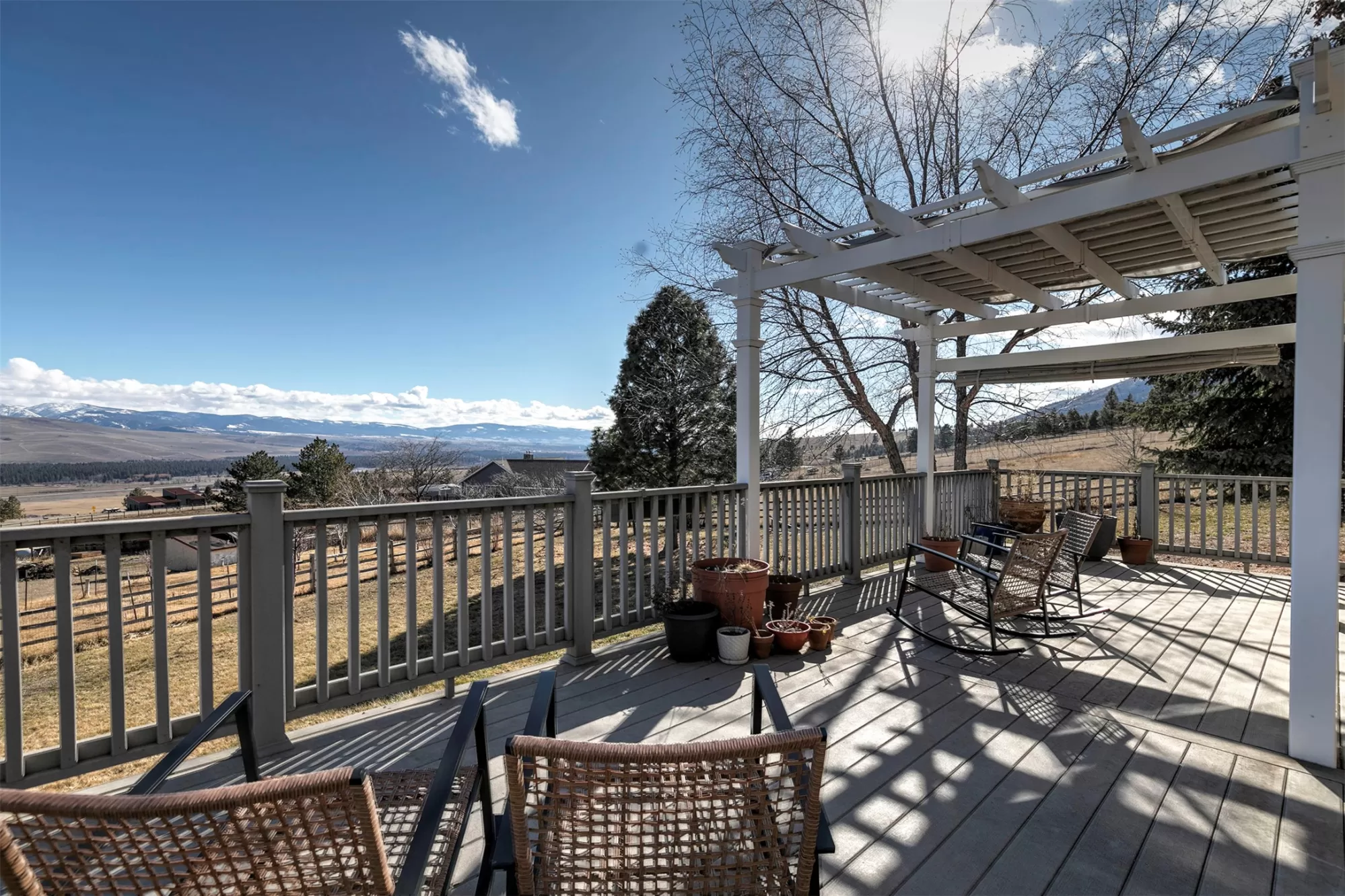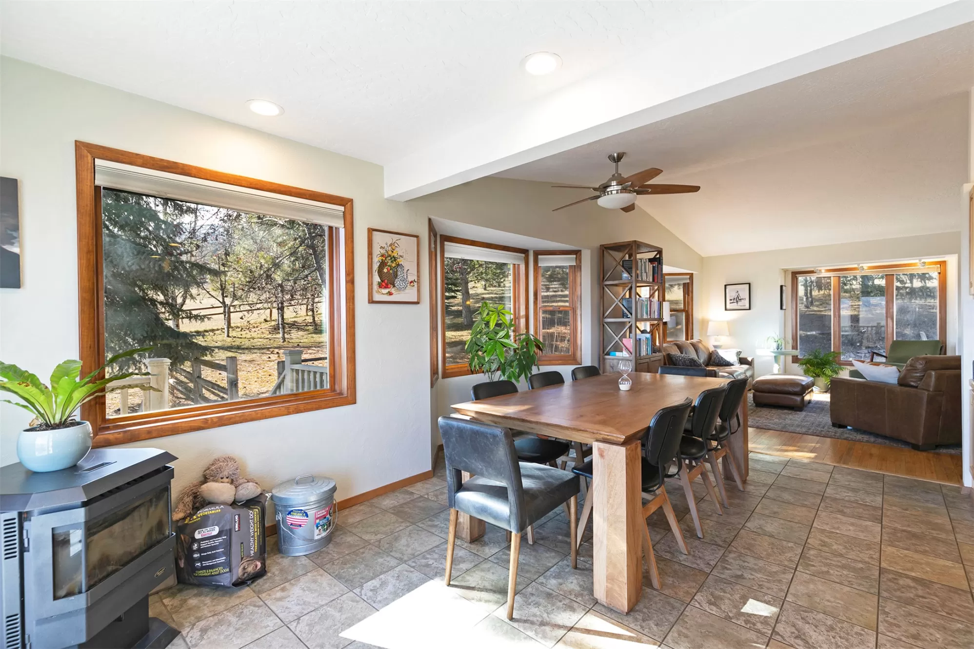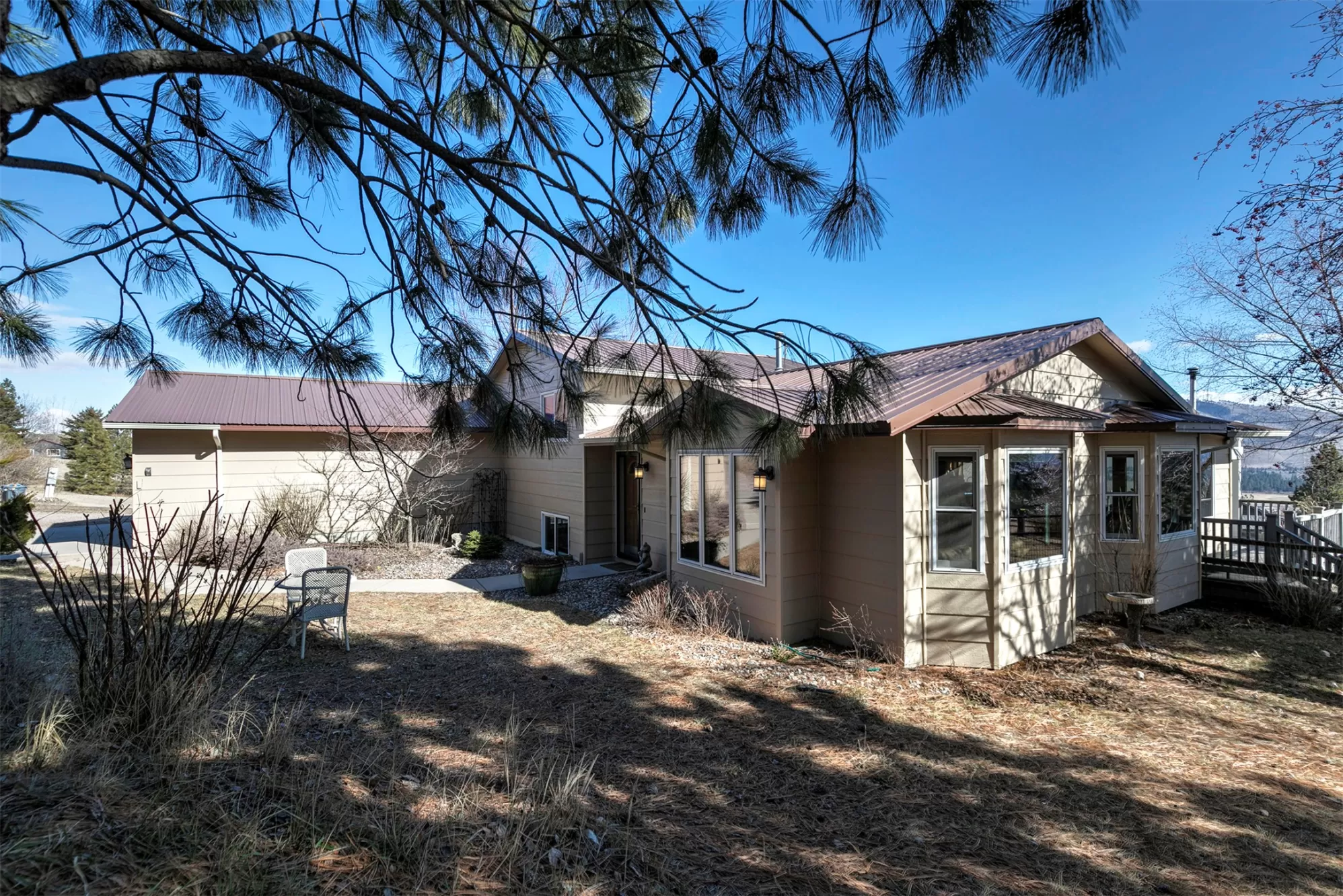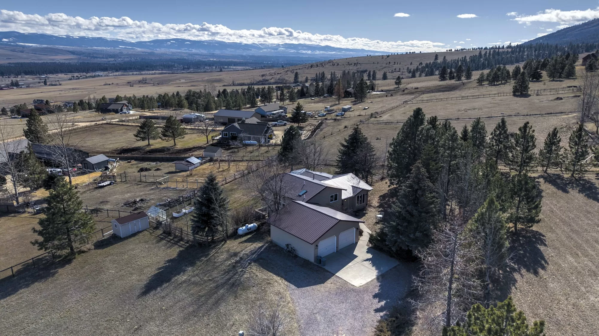 Experience the perfect blend of serenity and convenience from this Florence home less than 30 minutes to Missoula on just over 2 acres. With an inviting open floor plan, privacy, and views from every room, this is the oasis away from the city you have been waiting for! The main and second levels feature hardwood floors and vaulted ceilings. There are bay windows with tons of natural light and pellet stove for cozy winter mornings. This home has a large primary suite with mountain views, a gas fireplace, and sliding glass doors to a private deck. There is an additional bedroom on the second floor which also connects to the full bathroom. Downstairs is a family room with access to the attached double car garage, an additional bedroom with doors out to the patio and a 3/4 bathroom with laundry hook ups, making this the perfect space for guests. Outside the acreage is fully fenced and is complete with a greenhouse, garden shed, and deck with more views!