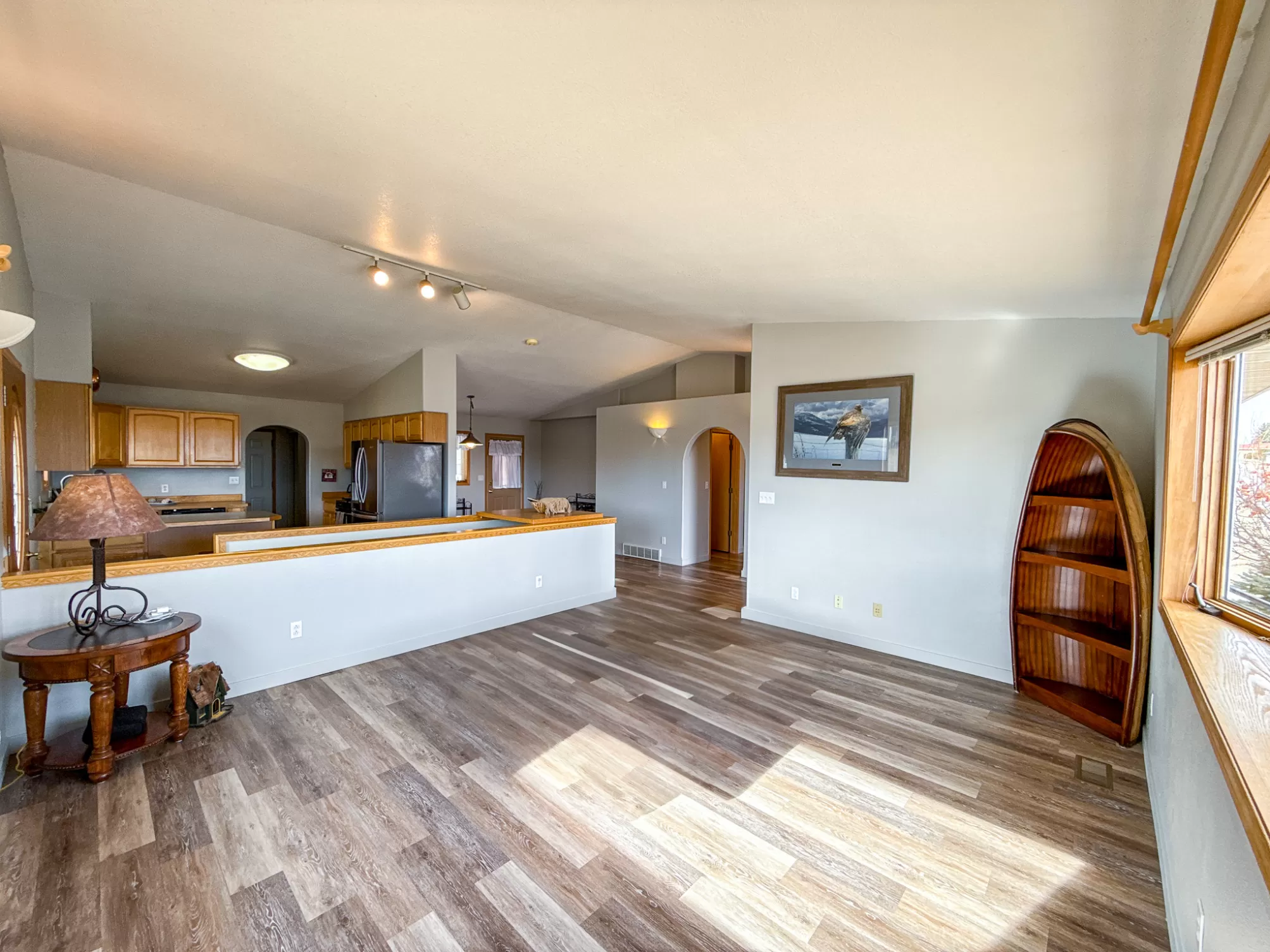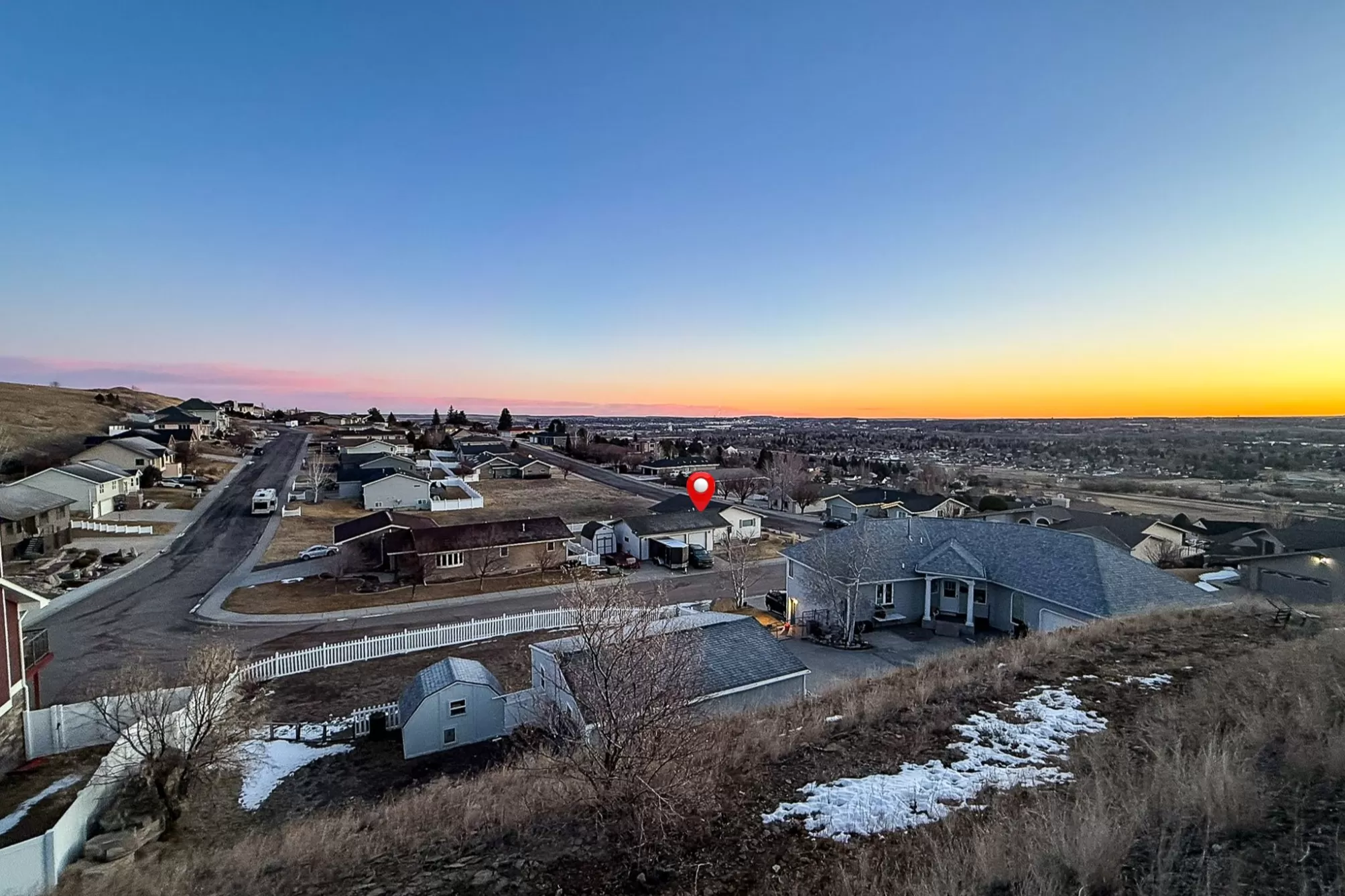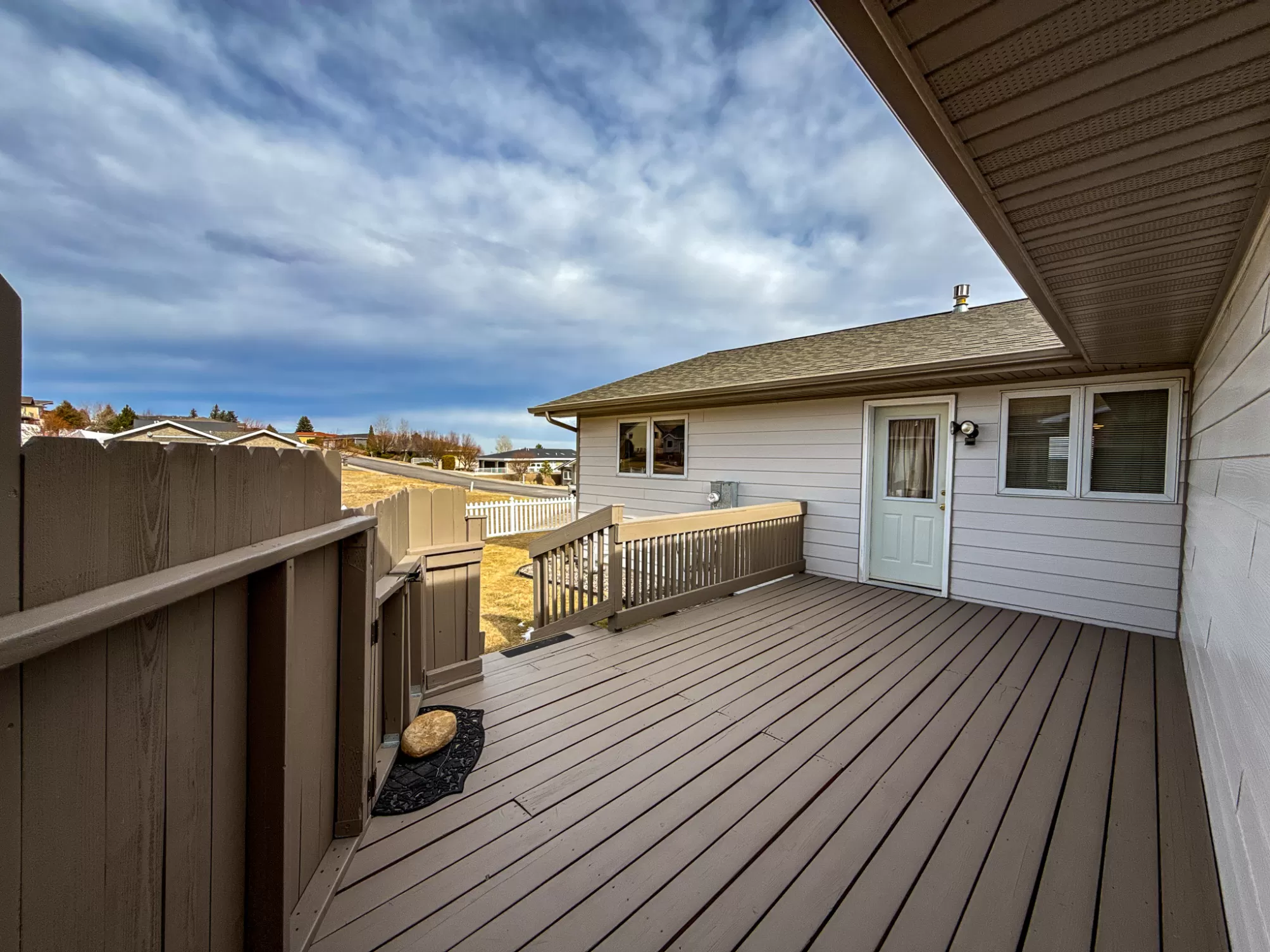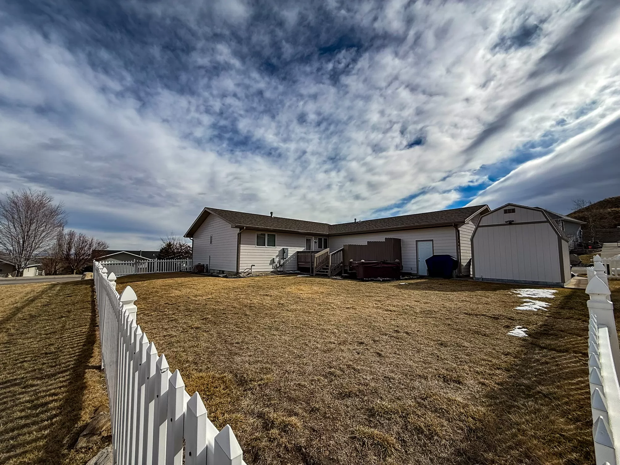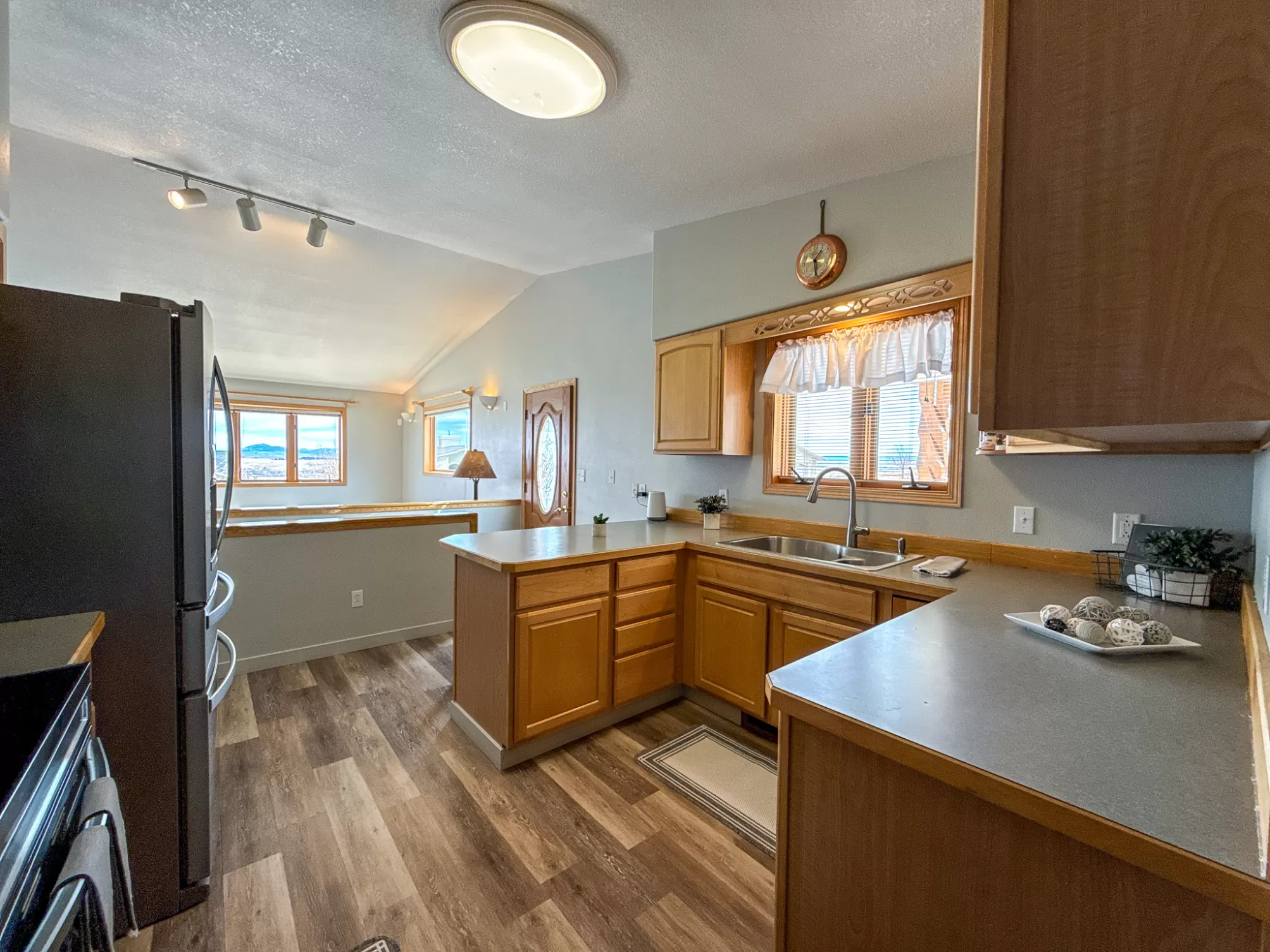 3404 Jasper Road | Belview Estates | Fox Farm Area Positioned at the top of the Belview Estates neighborhood, this corner-lot home captures sweeping mountain and river valley views while offering space, privacy, and functionality that’s hard to find in the Fox Farm area. With fresh interior and exterior paint, new flooring, and a roof replaced in 2020, this home blends peace of mind updates with an open, light-filled layout. Vaulted ceilings and expansive windows frame the scenery, creating a bright main living space that feels elevated in every sense. The main level features two spacious bedrooms, 1.5 bathrooms, and a dining area that opens directly to the large deck — ideal for entertaining or enjoying Montana sunsets. The vinyl-fenced yard is flat and usable, with additional space thanks to the adjacent drainage easement and city-owned property bordering the lot. Downstairs, you’ll find two additional bedrooms, a full bathroom, a generous family room with pellet stove, and ample storage — perfect for guests, hobbies, or multi-generational living. The oversized three-car heated garage is a standout feature, located on the side of the home for added curb appeal and driveway space. The extended driveway offers camper/RV parking, and the 10x12 powered storage shed with loft adds even more versatility. Brand new kitchen appliances — dishwasher, range, and microwave — complete the package. Located in the Meadowlark School District and just minutes from Smith’s, Home Depot, restaurants, and the airport, this home combines convenience with one of the best vantage points in Great Falls. If you’ve been waiting for space, views, and garage capacity in a highly sought-after neighborhood — this is your opportunity.