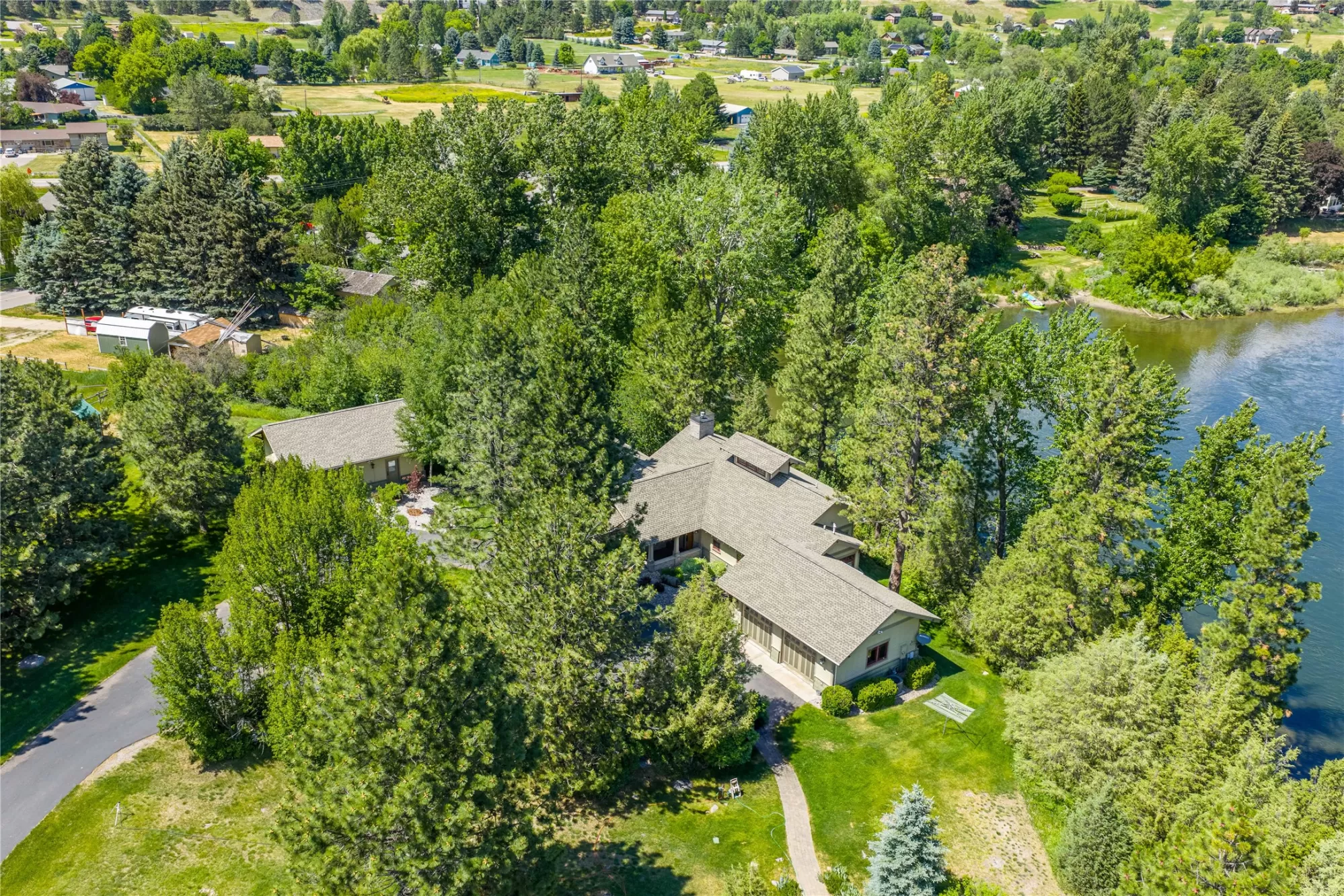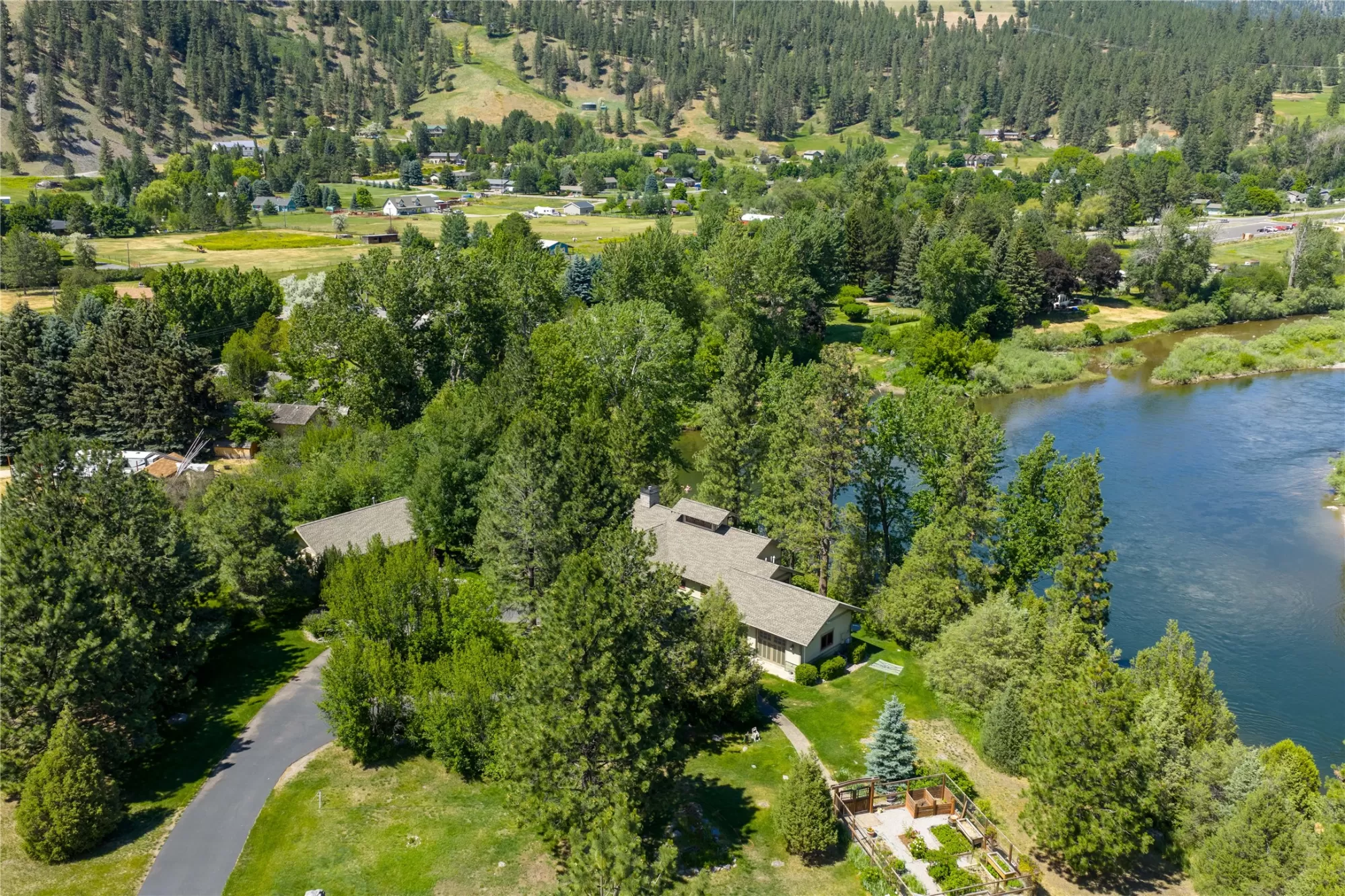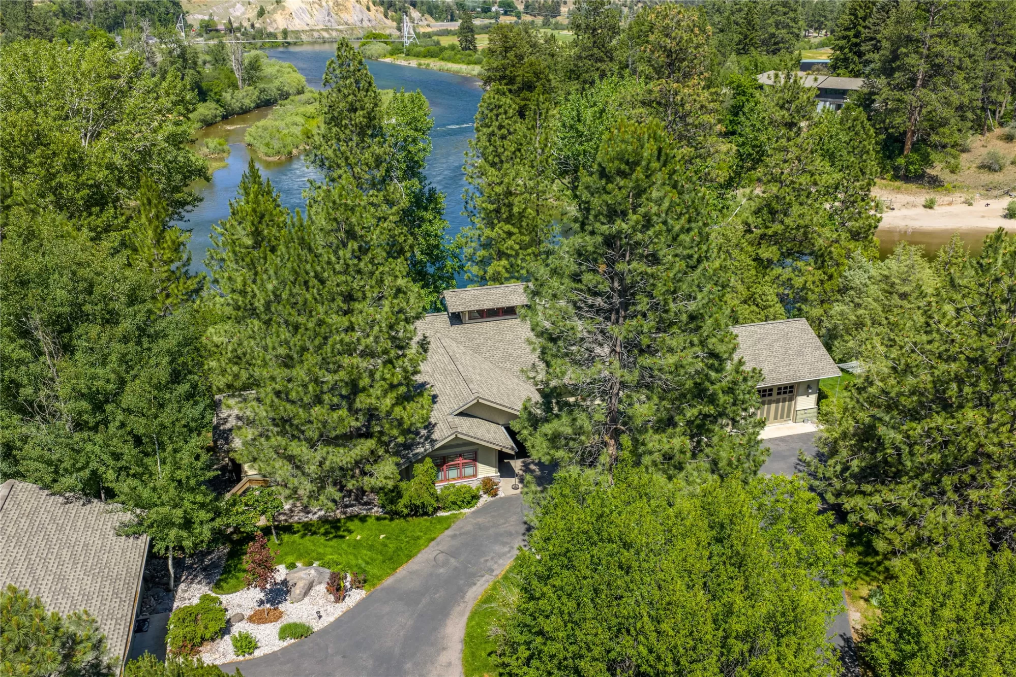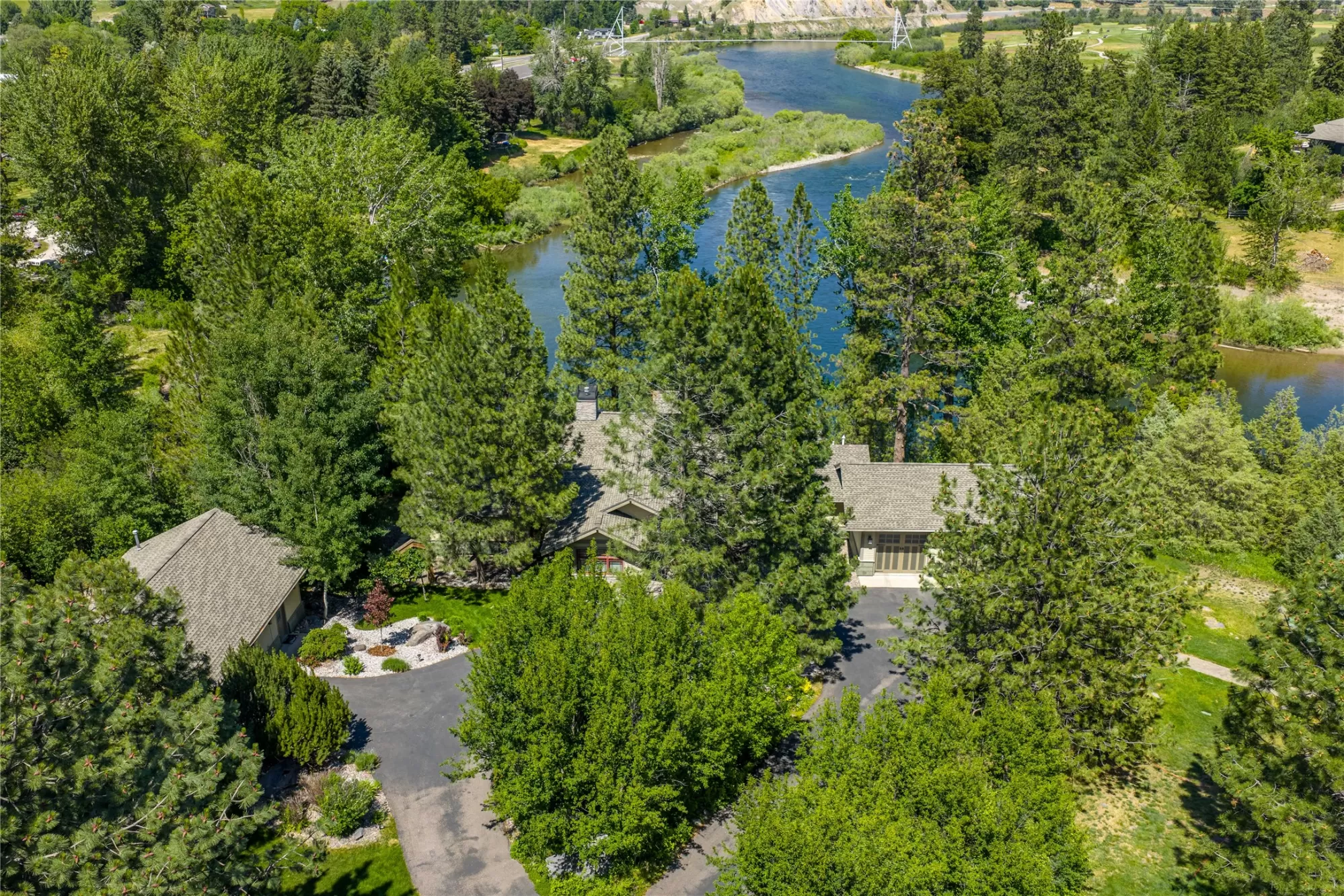 With more than 425 feet of frontage along the Clark Fork River, this exceptional 2.97-acre property offers the perfect blend of luxury and Montana living. Set on two legal parcels with sweeping mountain and river views from nearly every room, this private retreat is tucked away in a peaceful natural setting—yet just minutes from downtown Missoula, the KettleHouse Amphitheater, Canyon River Golf Course, and a vibrant culinary and cultural scene. The main residence is designed to highlight the beauty of its surroundings, with floor-to-ceiling windows and wood-framed interiors paired with durable metal-clad exteriors for lasting quality and timeless warmth. Inside, the home showcases a refined blend of natural materials including white oak hardwood floors, slate tile flooring, and vaulted ceilings with scissor trusses. A stunning natural stone gas fireplace anchors the living area, creating a cozy yet elegant atmosphere year-round. Custom cherry built-ins throughout the home provide functional beauty, offering elegant storage and display space in the living areas, hallway, and bedrooms. Stained glass details and quality finishes add a touch of artistry and character throughout. The chef’s kitchen is both stylish and highly functional, featuring high-end appliances, custom wood cabinetry, and a generous walk-in pantry with rich wood detailing. The open-concept layout flows into the dining area and a screened-in porch, both perfectly positioned to capture panoramic river views in every season. The home includes three bedrooms, two of which have ensuite bathrooms, offering privacy and comfort. An attached two-car garage adds convenience and room for gear to enjoy Montana’s recreational lifestyle. A separate 375 sq. ft. studio with a half bath and single-car garage provides flexible space for guests, a home office, or a creative retreat. Outside, the grounds are equally impressive with a fenced raised-bed garden, greenhouse, toolshed, and irrigation system with water rights—ideal for gardening and sustainable living. Whether you're savoring quiet mornings by the river, entertaining with views of the mountains, or heading out for an evening concert or a round of golf, 125 & 133 Deer Creek Road is more than just a home—it’s a private sanctuary that blends comfort, craftsmanship, and natural beauty in one of Missoula's most desirable settings.