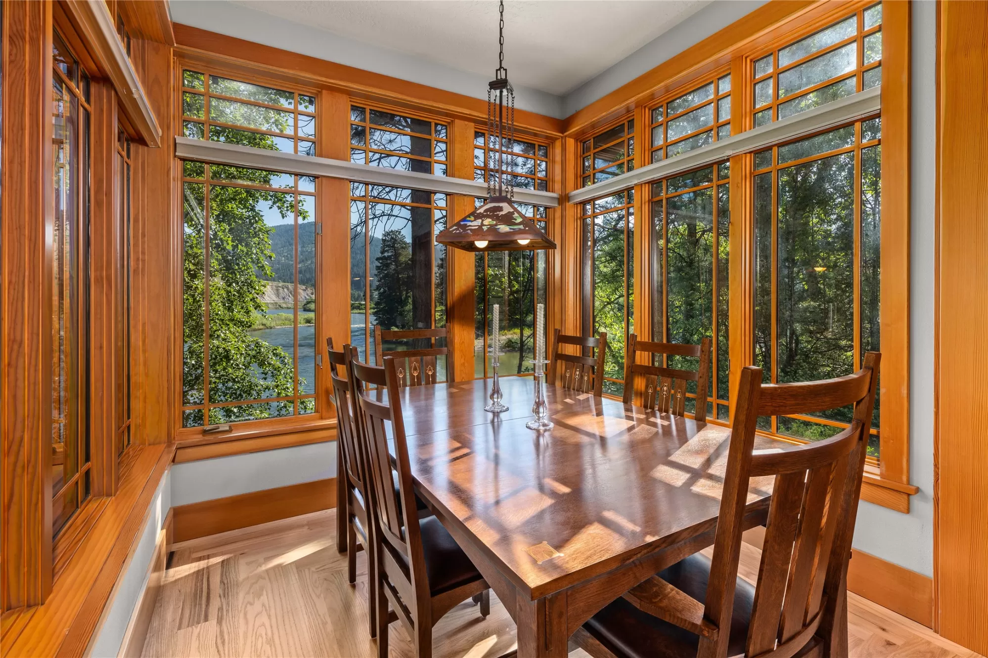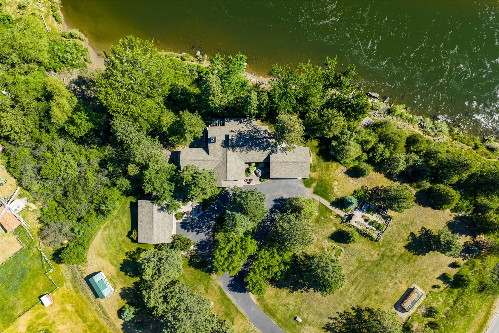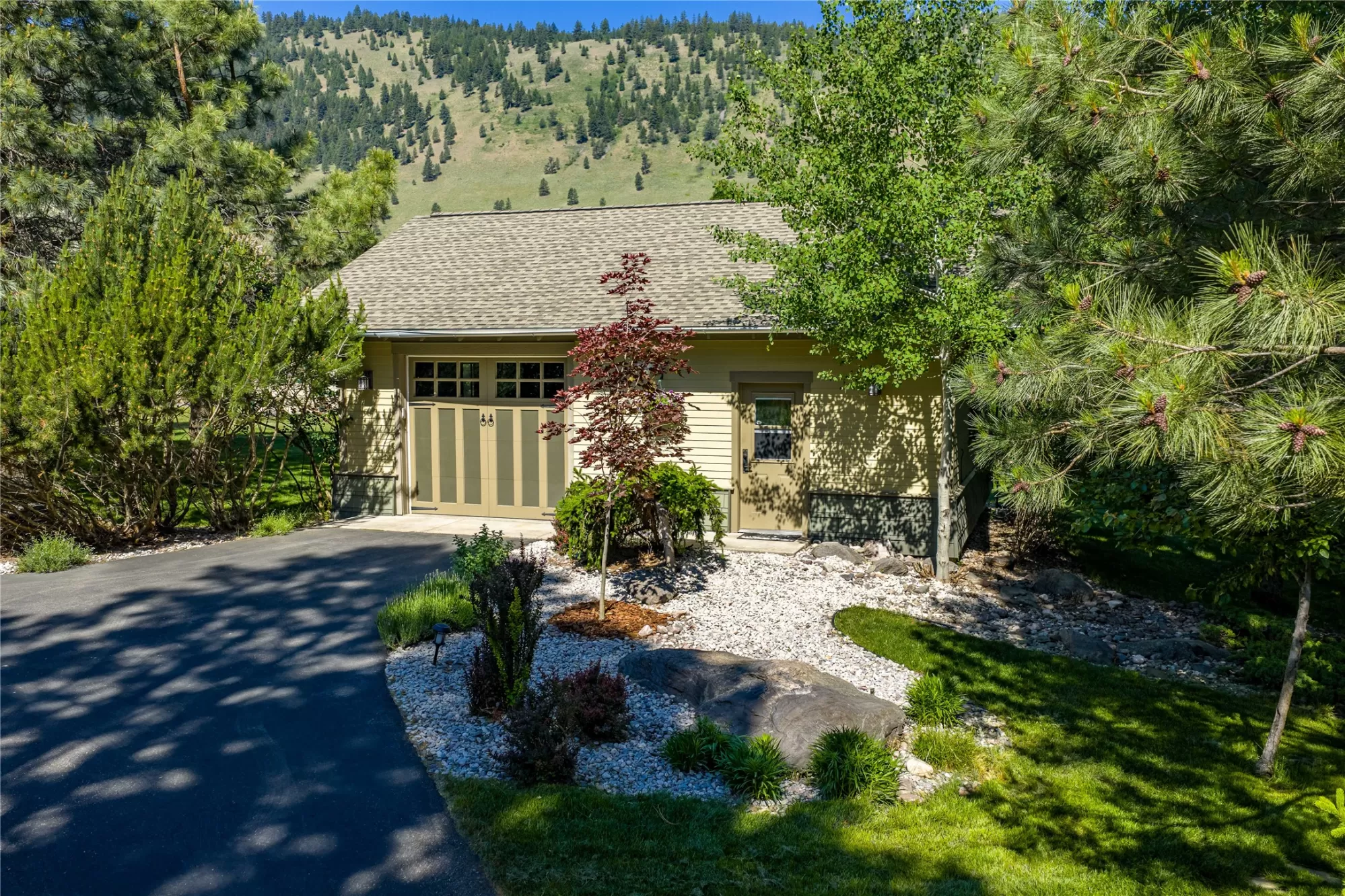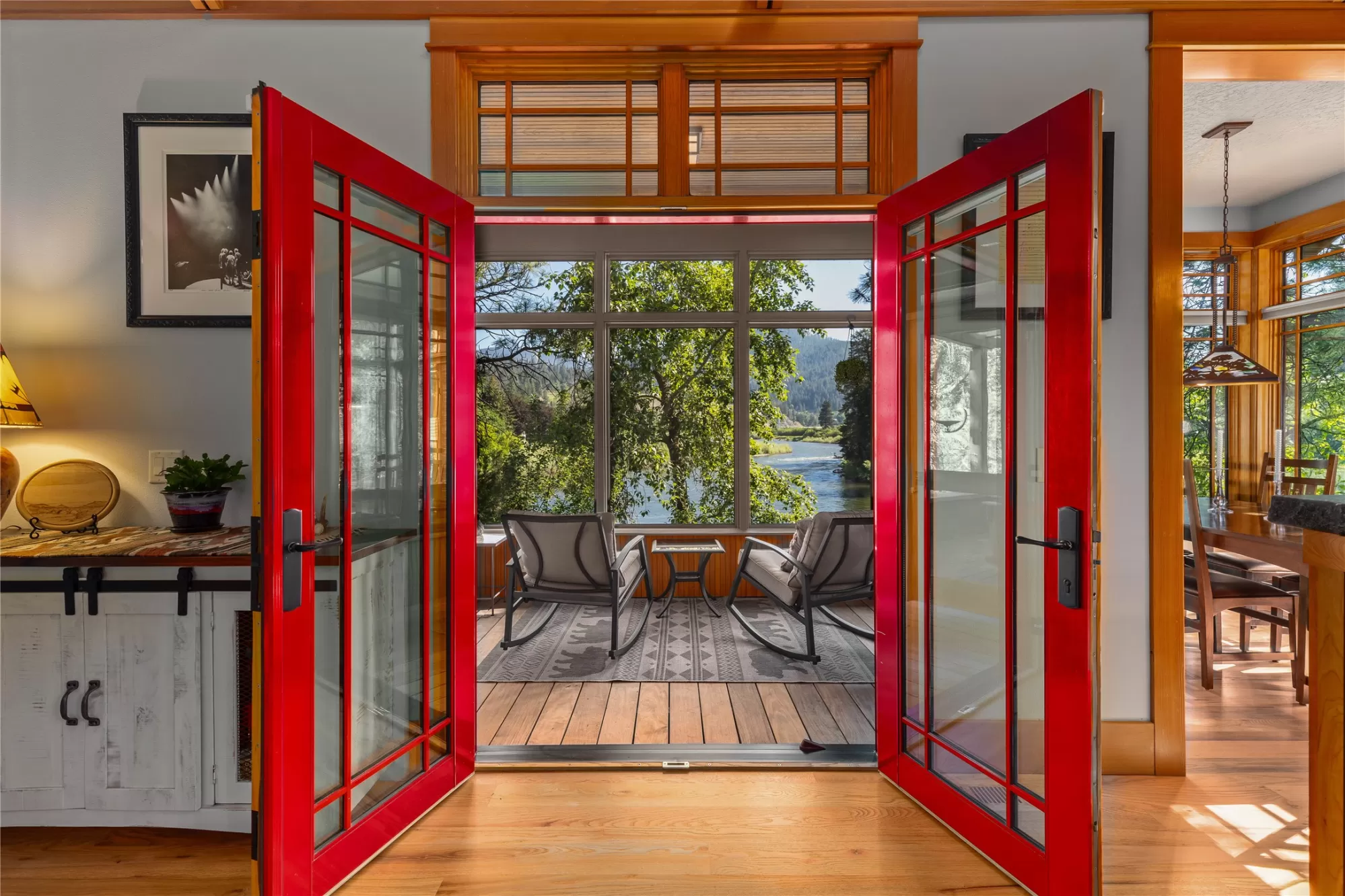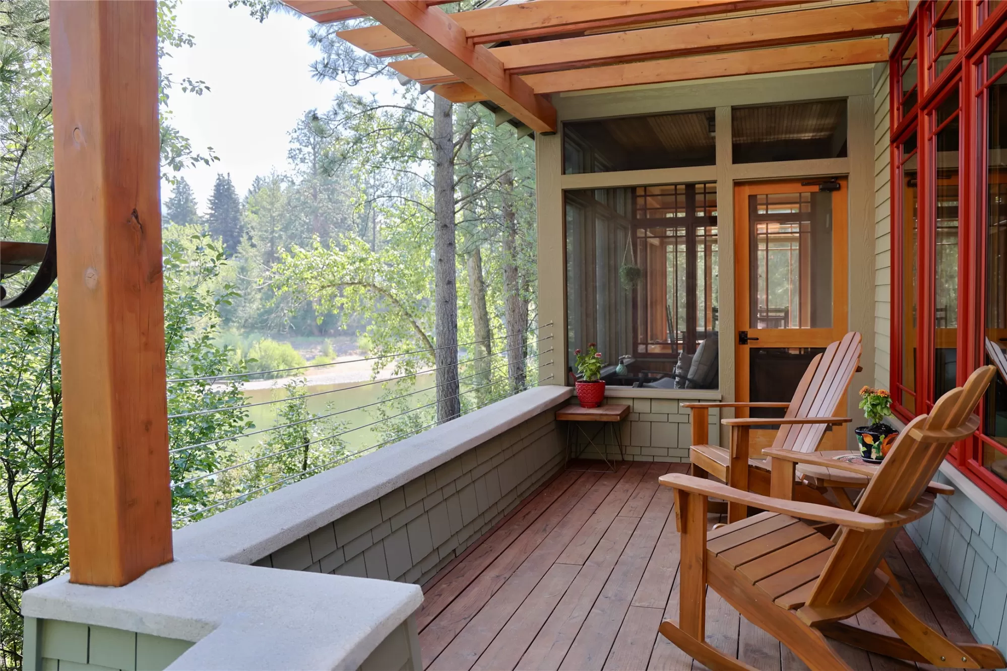 With more than 425 feet of frontage along the Clark Fork River, this exceptional 2.97-acre property offers the perfect blend of luxury and Montana living. Set on two legal parcels with sweeping mountain and river views from nearly every room, this private retreat is tucked away in a peaceful natural setting—yet just minutes from downtown Missoula, the KettleHouse Amphitheater, Canyon River Golf Course, and a vibrant culinary and cultural scene. The main residence is designed to highlight the beauty of its surroundings, with floor-to-ceiling windows and wood-framed interiors paired with durable metal-clad exteriors for lasting quality and timeless warmth. Inside, the home showcases a refined blend of natural materials including white oak hardwood floors, slate tile flooring, and vaulted ceilings with scissor trusses. A stunning natural stone gas fireplace anchors the living area, creating a cozy yet elegant atmosphere year-round. Custom cherry built-ins throughout the home provide functional beauty, offering elegant storage and display space in the living areas, hallway, and bedrooms. Stained glass details and quality finishes add a touch of artistry and character throughout. The chef’s kitchen is both stylish and highly functional, featuring high-end appliances, custom wood cabinetry, and a generous walk-in pantry with rich wood detailing. The open-concept layout flows into the dining area and a screened-in porch, both perfectly positioned to capture panoramic river views in every season. The home includes three bedrooms, two of which have ensuite bathrooms, offering privacy and comfort. An attached two-car garage adds convenience and room for gear to enjoy Montana’s recreational lifestyle. A separate 375 sq. ft. studio with a half bath and single-car garage provides flexible space for guests, a home office, or a creative retreat. Outside, the grounds are equally impressive with a fenced raised-bed garden, greenhouse, toolshed, and irrigation system with water rights—ideal for gardening and sustainable living. Whether you're savoring quiet mornings by the river, entertaining with views of the mountains, or heading out for an evening concert or a round of golf, 125 & 133 Deer Creek Road is more than just a home—it’s a private sanctuary that blends comfort, craftsmanship, and natural beauty in one of Missoula's most desirable settings.
