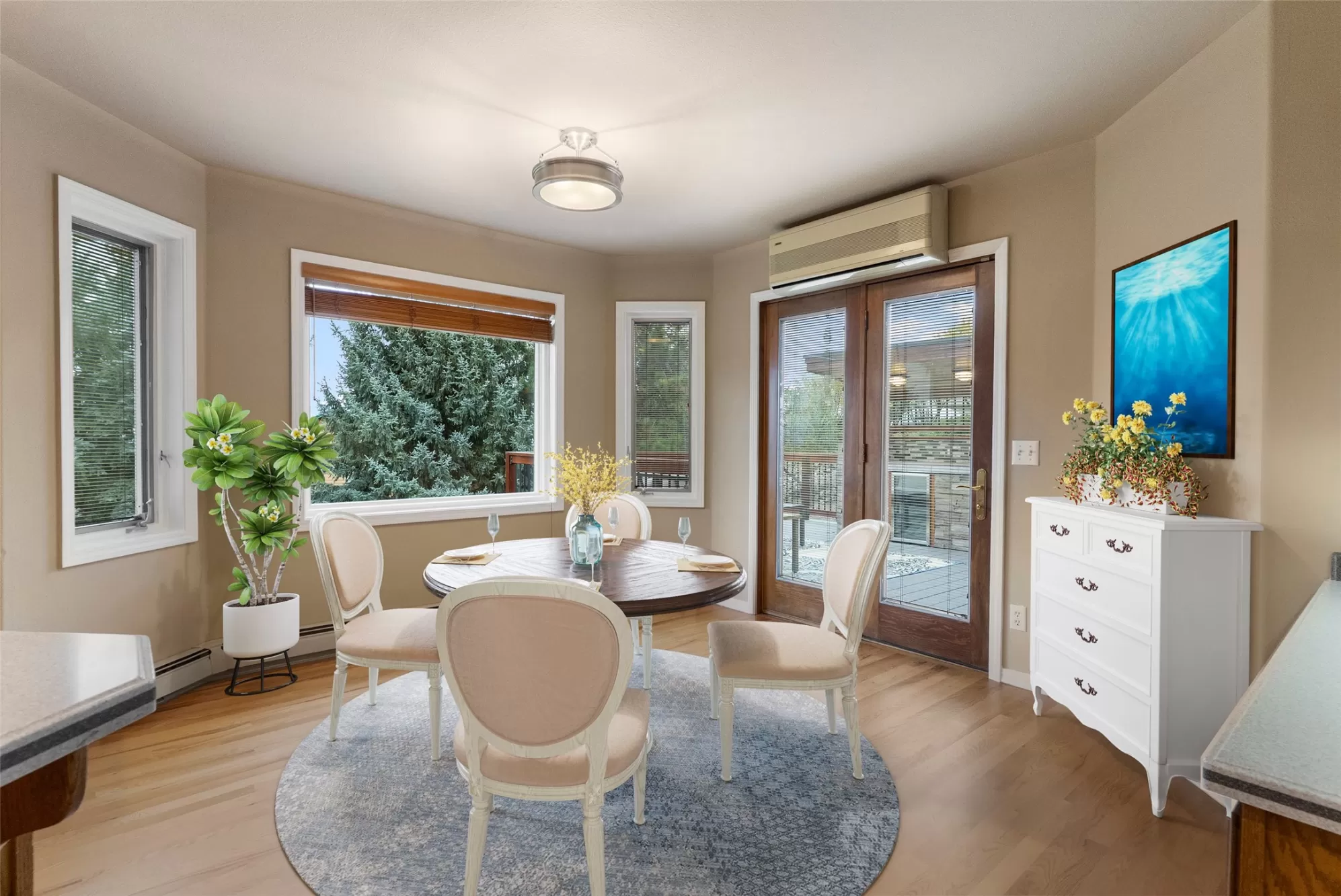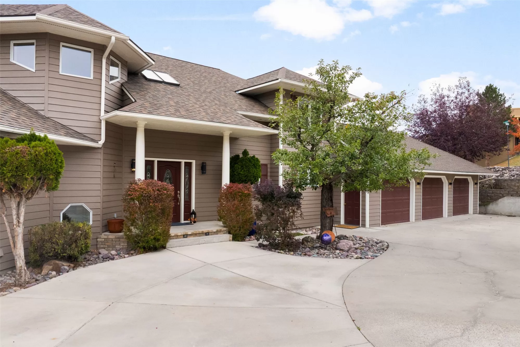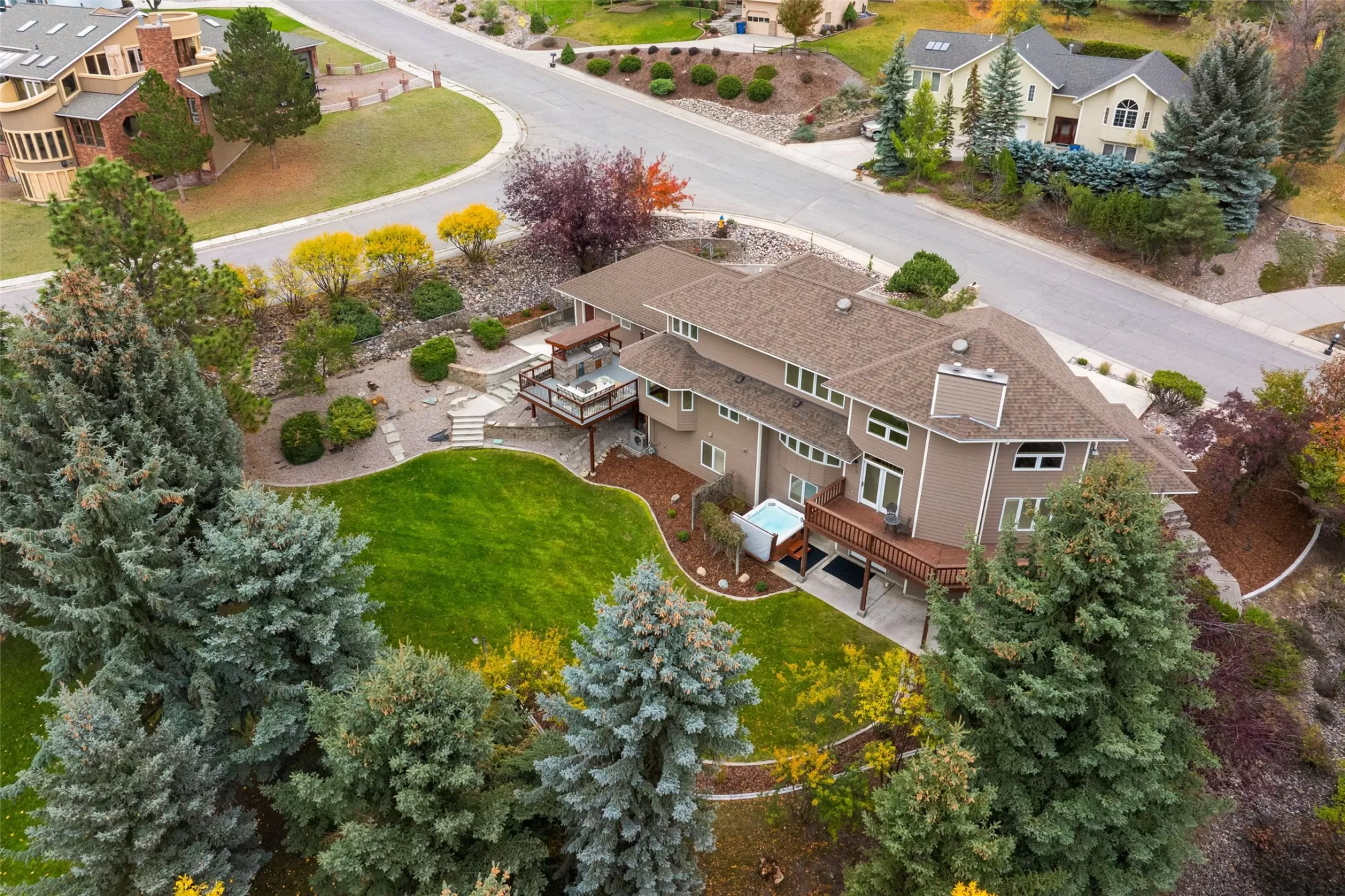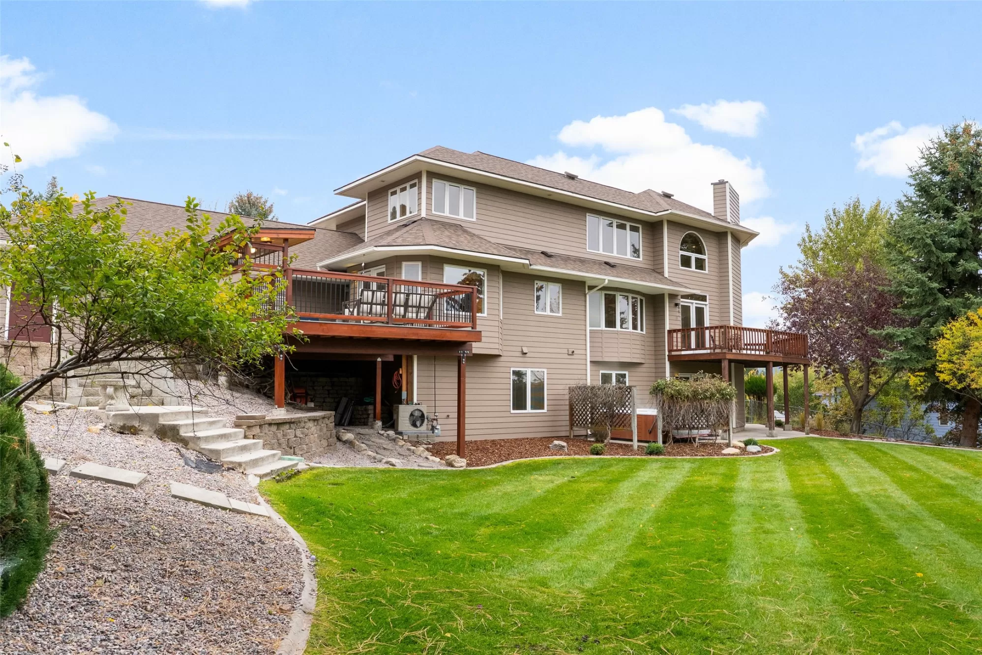 Set on a large corner lot in Missoula’s Farviews neighborhood, this three level, 4,228-square-foot residence offers five bedrooms and five bathrooms across nearly half an acre. Mature trees and curated landscaping surround the property. Inside, inlaid wood flooring and vaulted ceilings give each room depth and character. The main level features a welcoming entry, formal dining room, and living area with a fireplace. The kitchen includes solid wood cabinetry, a breakfast bar, and space for casual dining. A main-floor ensuite, half bath, and laundry room add convenience to the thoughtful layout. Upstairs, the expansive primary suite with beautiful views spans the full level with a large bedroom, soaking tub, two walk-in closets, and a private sitting room. The walk-out daylight basement offers a large second living area with a fireplace, generous storage, Three bedrooms, one of which is another ensuite and another full bathroom. The second living space opens up to the large yard, via a patio that includes a hot tub. Craftsmanship shows throughout, from the 12-foot basement walls to the boiler system that provides efficient hot water heat. The home also includes a new hot water heater and an A/C wall unit in the kitchen. Two decks extend the living space outdoors—one off the kitchen with a built-in gas BBQ kitchen and beverage fridge—overlooking a landscaped yard with underground sprinklers. A three-car garage and extra parking complete this well-maintained home. Schedule your showing today!