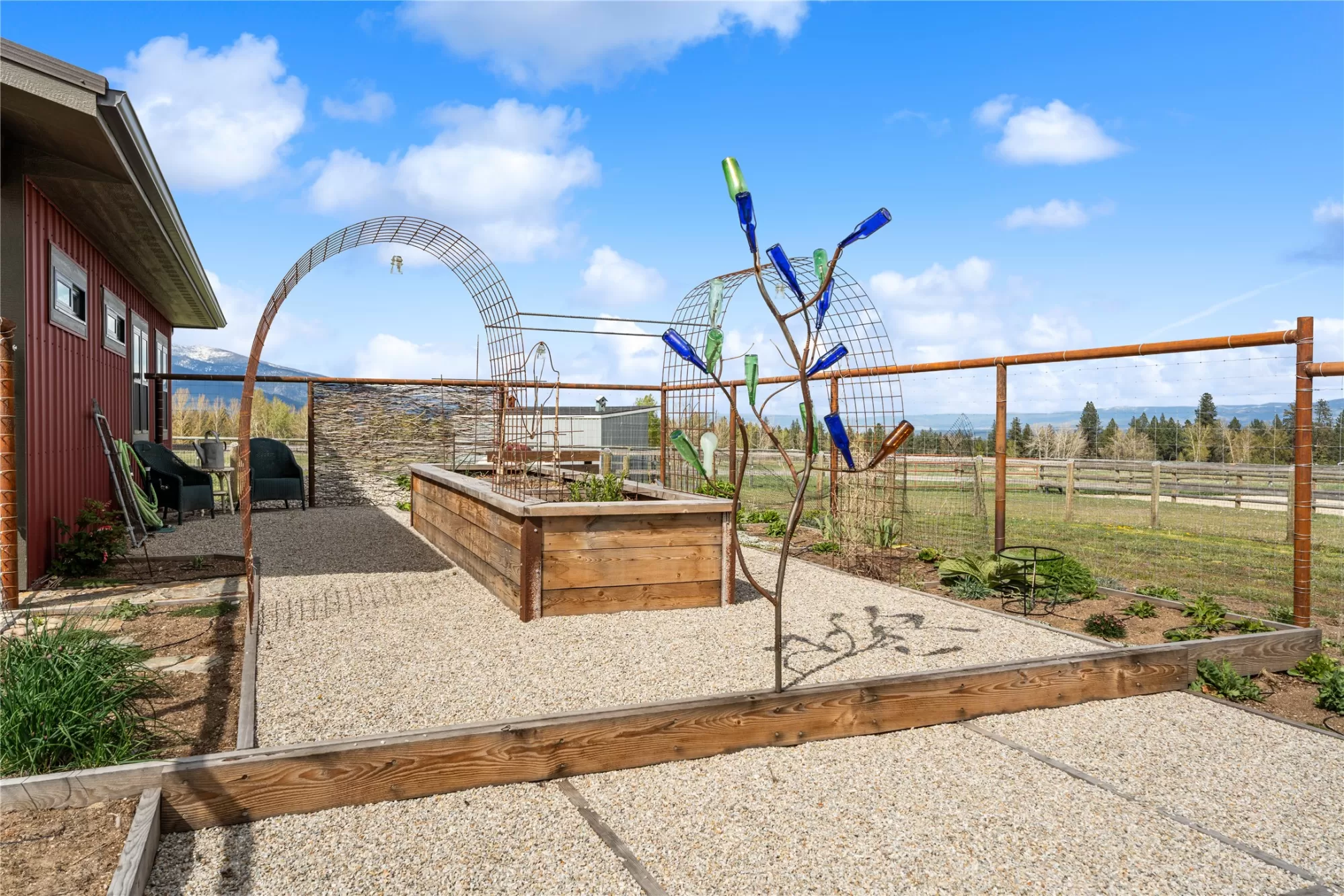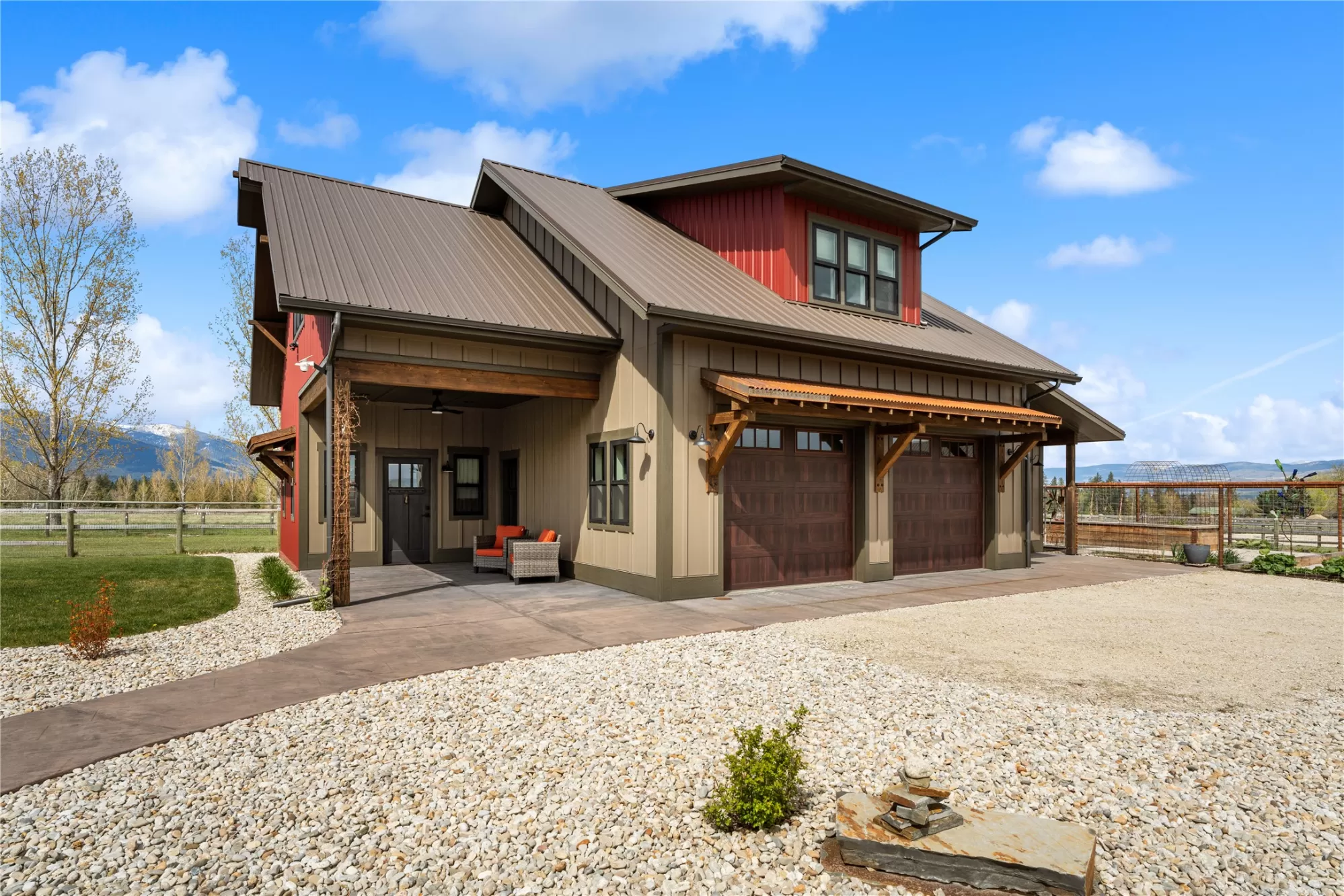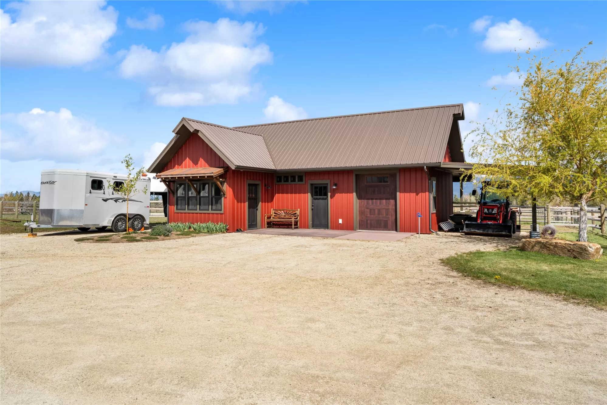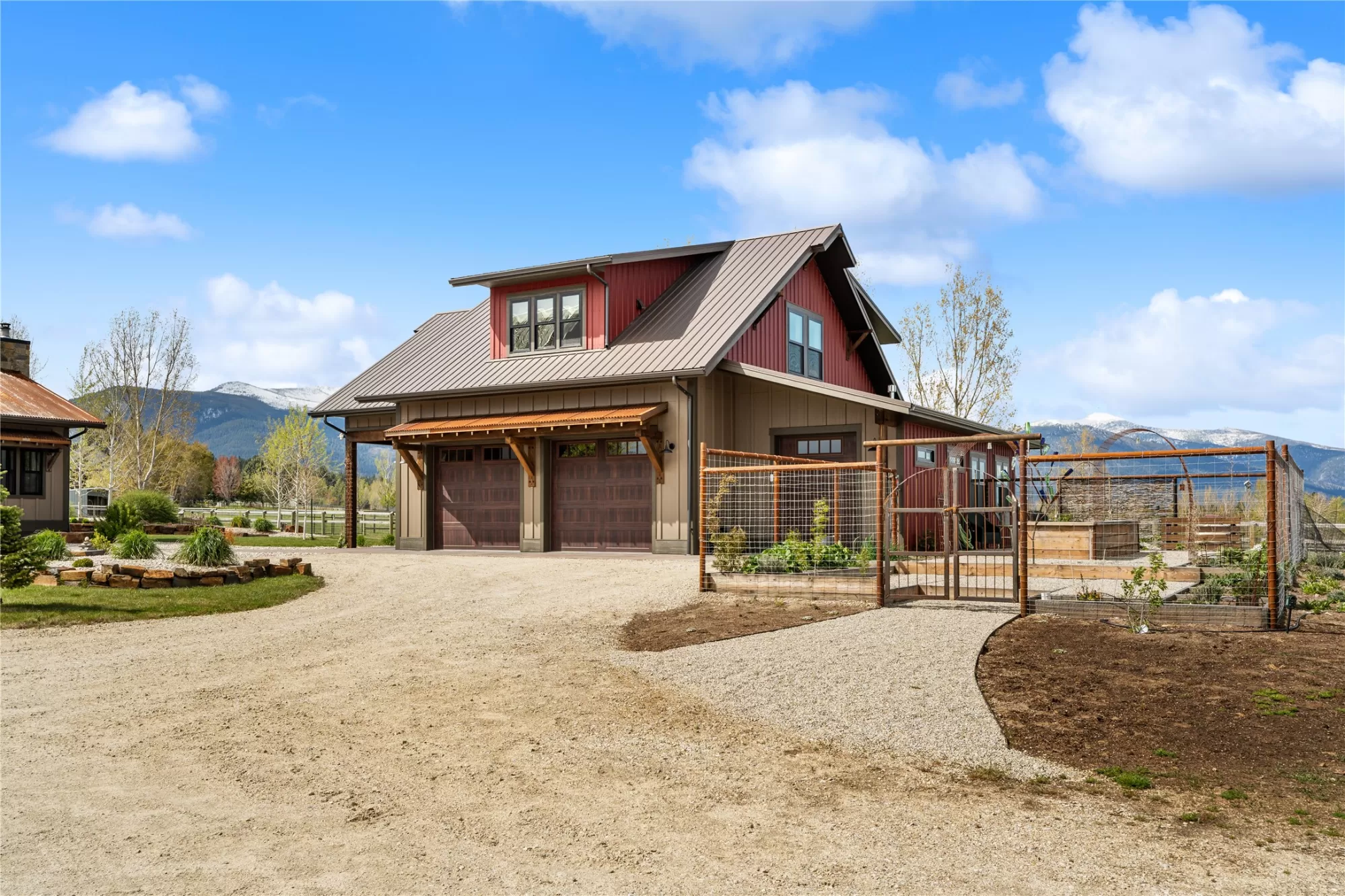 This gated, fully fenced, level 10.8 acre property, built in 2022, offers a flexible living setup with a single level main home, attached garage with upper level storage, detached shop with upper level apartment, 2 horse stalls, and the ultimate man cave and she-shed. You truly won’t want to leave! The main residence features 2 bedrooms and 3 bathrooms with radiant heated floors and a vaulted ceiling in the open concept living area. The primary suite includes a walk-in closet, dedicated craft or office space, and a well finished en suite bathroom with floor to ceiling tile. The second bedroom also has its own en suite and private entrance, creating ideal separation for guests. Large picture windows frame unobstructed views of the Bitterroot Mountains and bring in natural light throughout. The living area is centered around a wood burning fireplace, and the kitchen is equipped with stainless steel appliances. A mudroom, separate laundry area, and attached heated garage with RV height doors and upper level storage for all your holiday decor. The heated 2 car detached garage adds versatility with a lower level that includes a man cave with bar, washer and dryer hookups, work room, and half bath. Upstairs, a fully furnished 1 bedroom apartment offers a full kitchen, living area, bathroom, and spacious bedroom, ideal for guests, rental income, or multigenerational living. The she-shed has a private workspace and a 2 stall barn with runouts, arena, hay storage, heated tack room, and covered bay. Multiple fenced pastures support rotation, and the working hay field produces up to 10 tons of quality, low sugar horse hay. Irrigation is in place with a pressure line and wheel line. The acreage captures private 360 degree views of the Bitterroot Valley and includes a deer proof fenced garden with a large raised bed. Outdoor living is complete with a covered wraparound porch and a hot tub with pergola shade, creating a setting that fully takes advantage of the surrounding landscape.