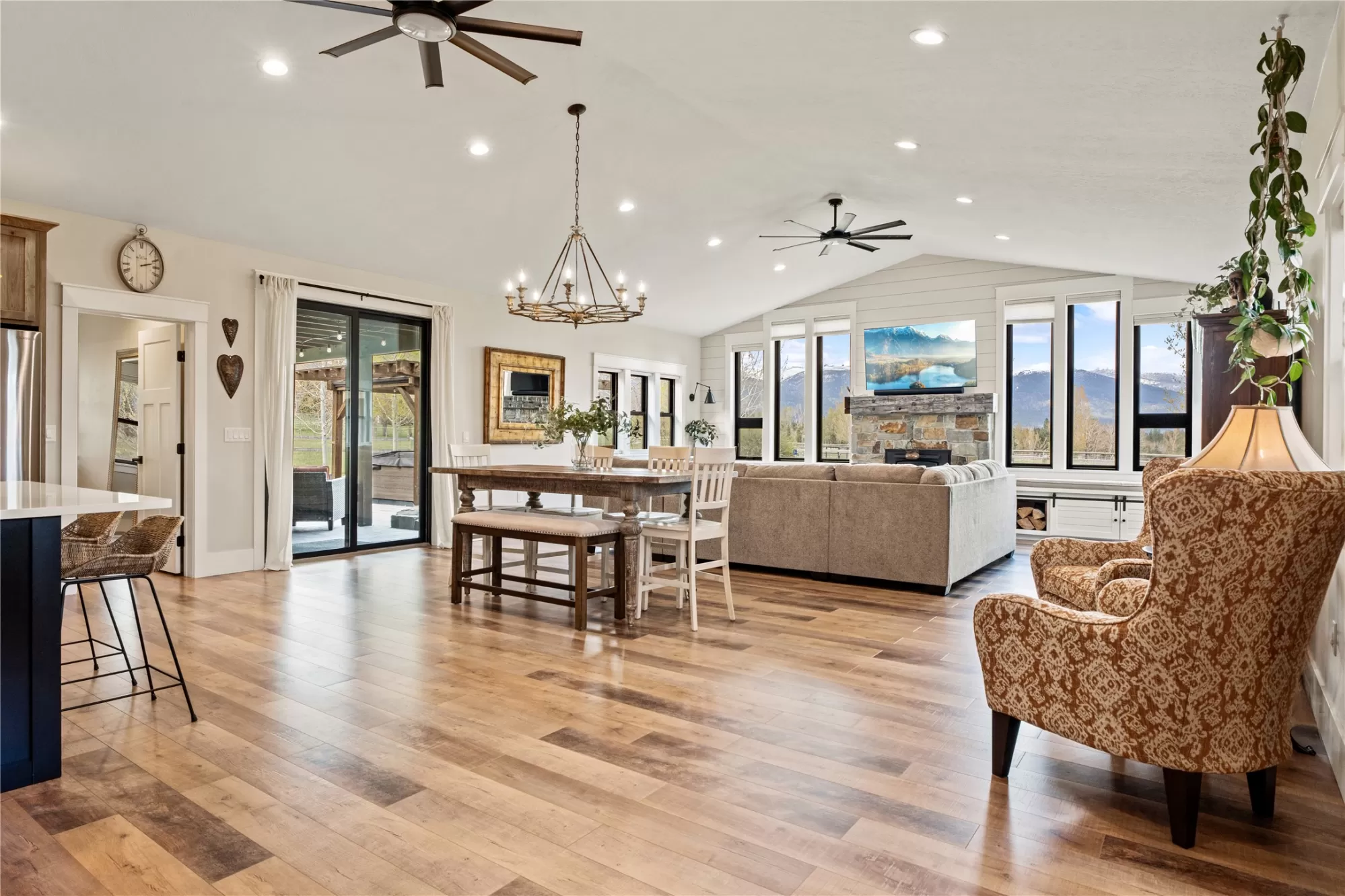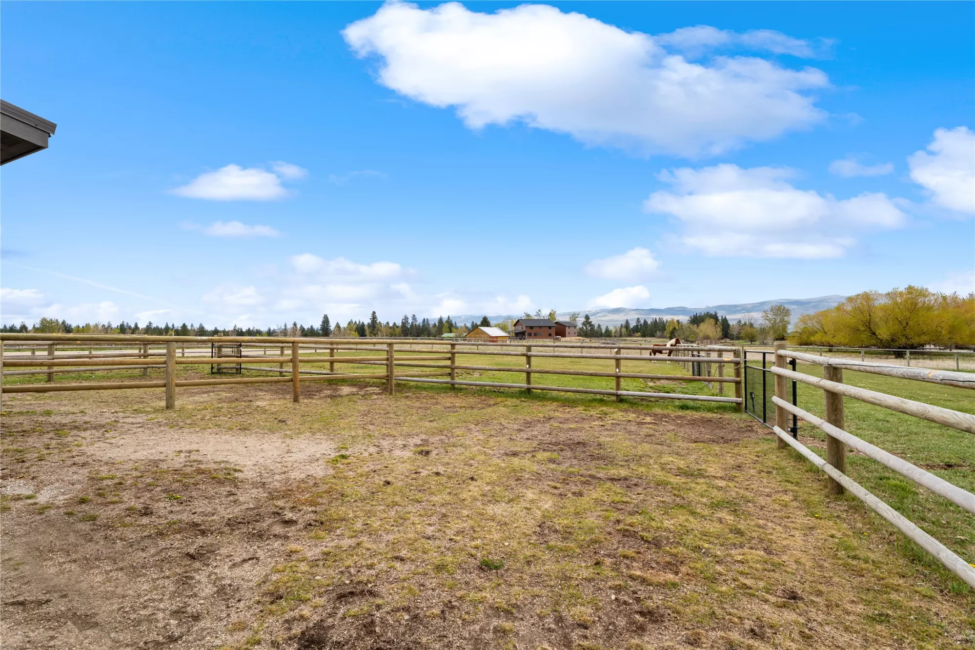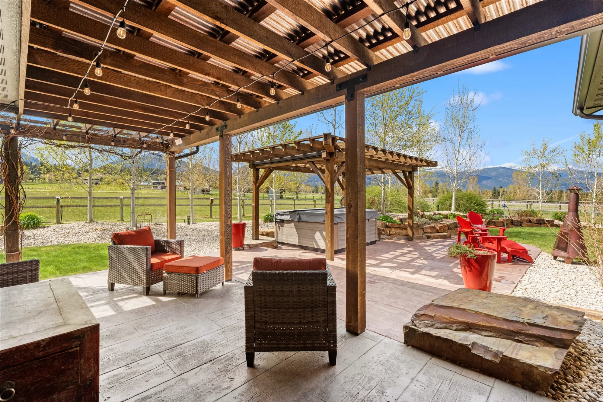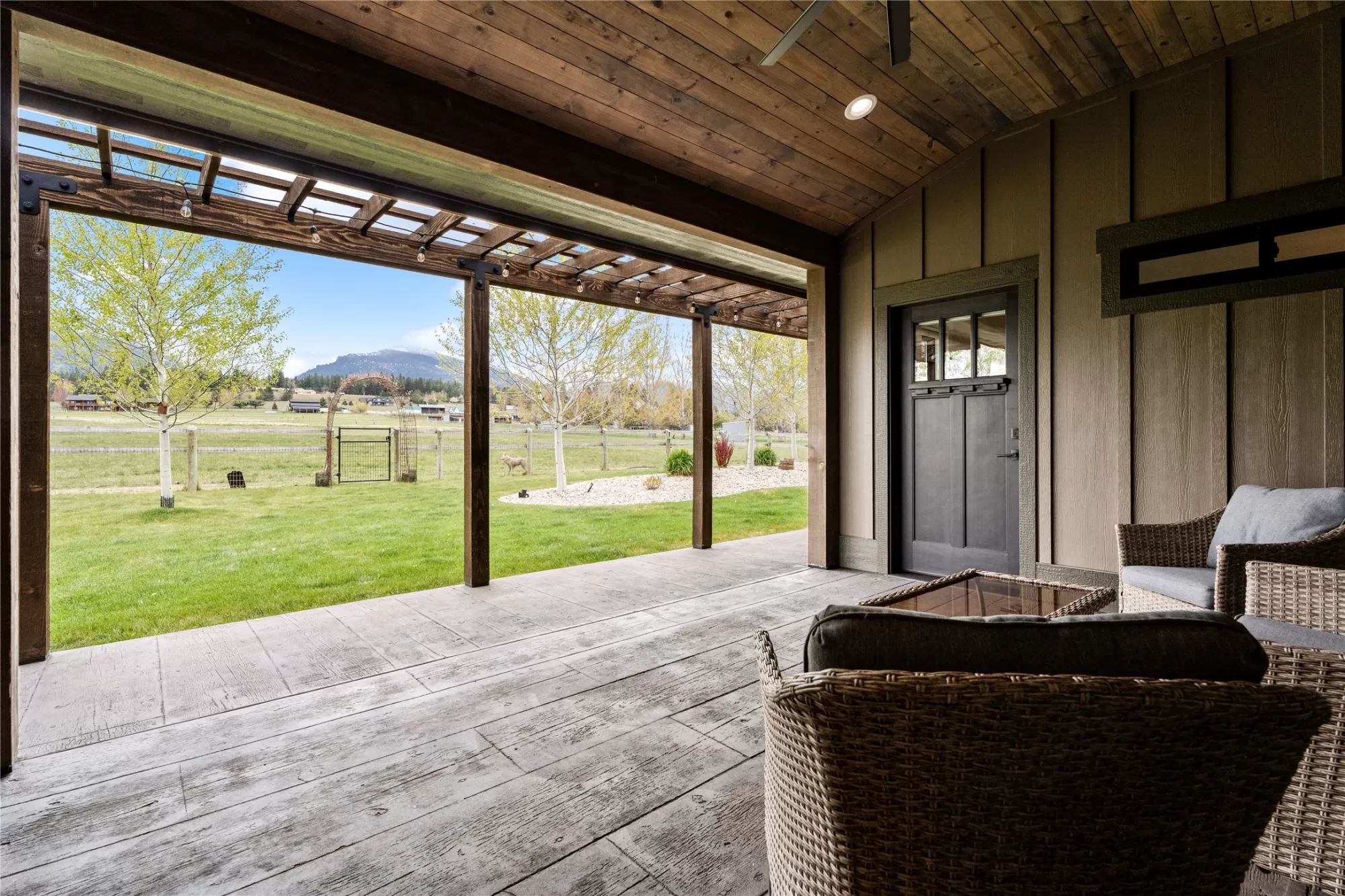 This gated, fully fenced, level 10.8 acre property, built in 2022, offers a flexible living setup with a single level main home, attached garage with upper level storage, detached shop with upper level apartment, 2 horse stalls, and the ultimate man cave and she-shed. You truly won’t want to leave! The main residence features 2 bedrooms and 3 bathrooms with radiant heated floors and a vaulted ceiling in the open concept living area. The primary suite includes a walk-in closet, dedicated craft or office space, and a well finished en suite bathroom with floor to ceiling tile. The second bedroom also has its own en suite and private entrance, creating ideal separation for guests. Large picture windows frame unobstructed views of the Bitterroot Mountains and bring in natural light throughout. The living area is centered around a wood burning fireplace, and the kitchen is equipped with stainless steel appliances. A mudroom, separate laundry area, and attached heated garage with RV height doors and upper level storage for all your holiday decor. The heated 2 car detached garage adds versatility with a lower level that includes a man cave with bar, washer and dryer hookups, work room, and half bath. Upstairs, a fully furnished 1 bedroom apartment offers a full kitchen, living area, bathroom, and spacious bedroom, ideal for guests, rental income, or multigenerational living. The she-shed has a private workspace and a 2 stall barn with runouts, arena, hay storage, heated tack room, and covered bay. Multiple fenced pastures support rotation, and the working hay field produces up to 10 tons of quality, low sugar horse hay. Irrigation is in place with a pressure line and wheel line. The acreage captures private 360 degree views of the Bitterroot Valley and includes a deer proof fenced garden with a large raised bed. Outdoor living is complete with a covered wraparound porch and a hot tub with pergola shade, creating a setting that fully takes advantage of the surrounding landscape.