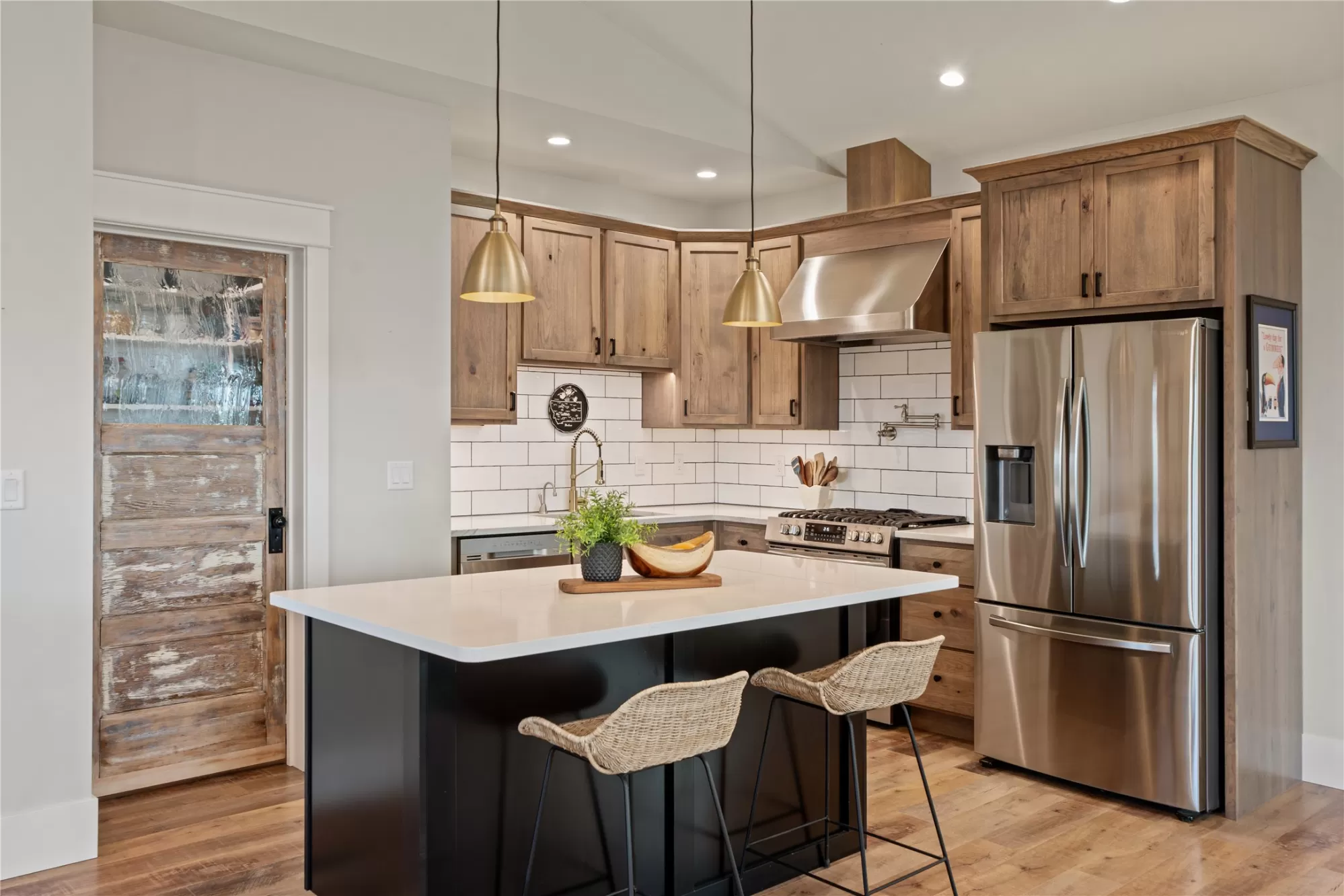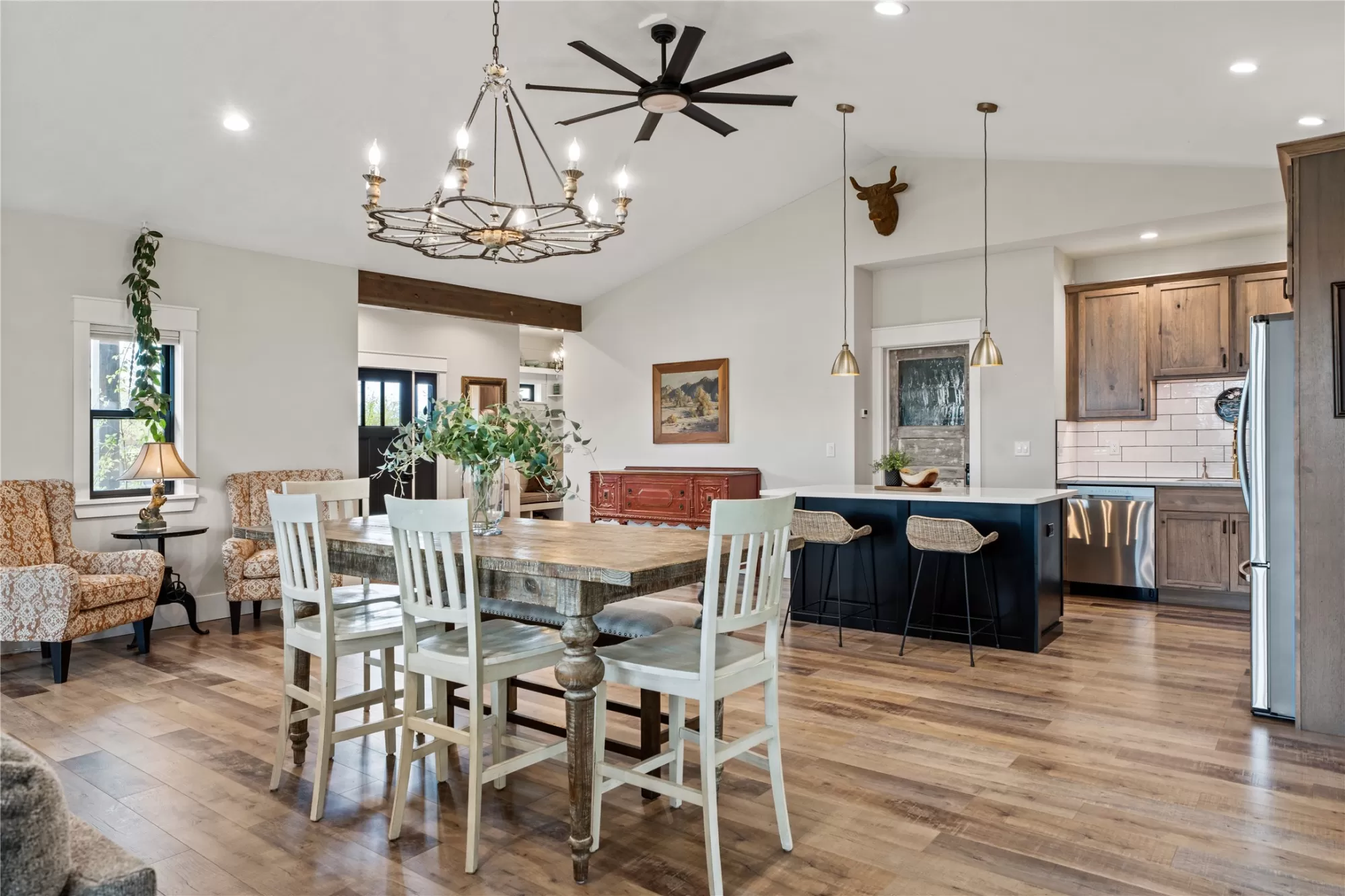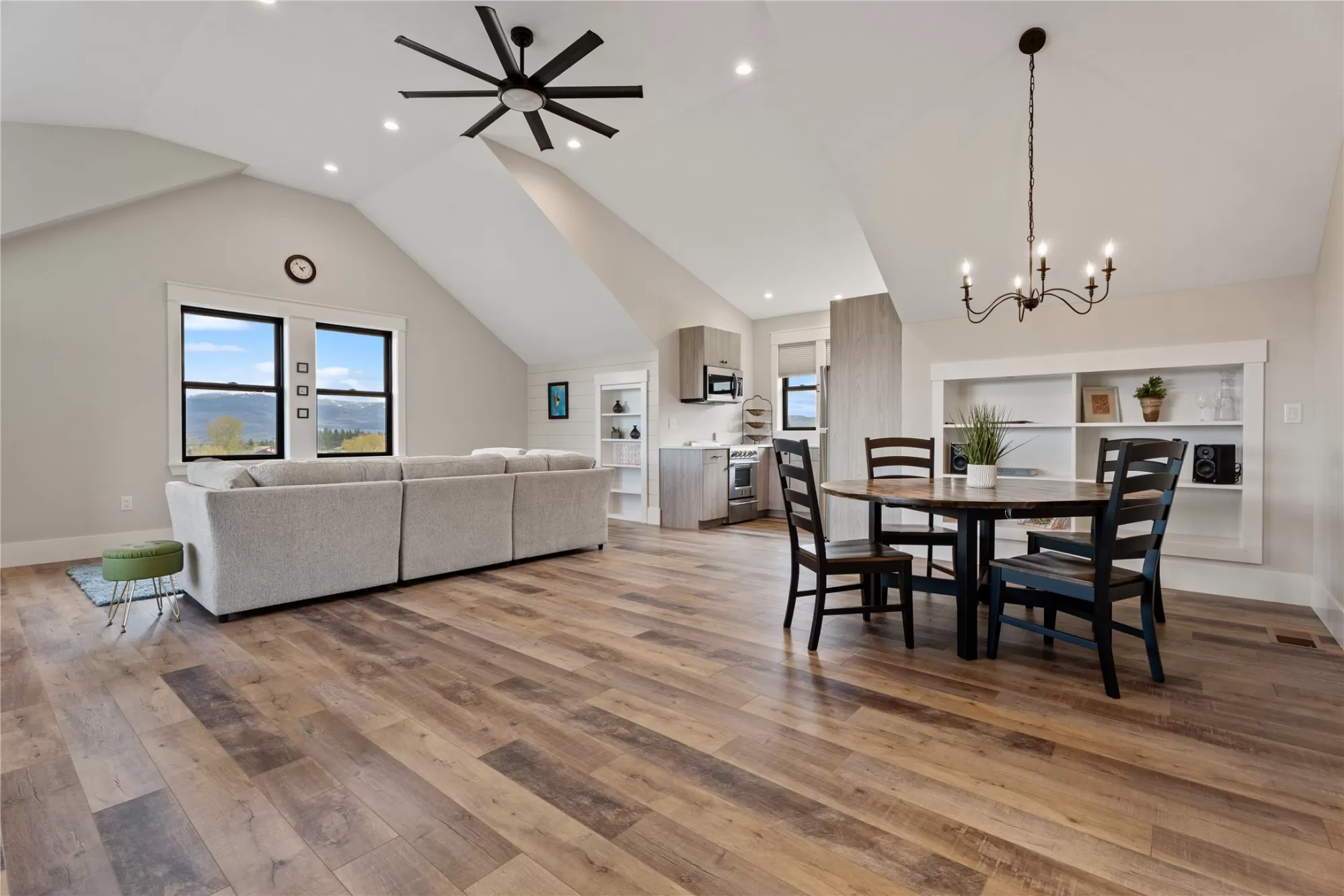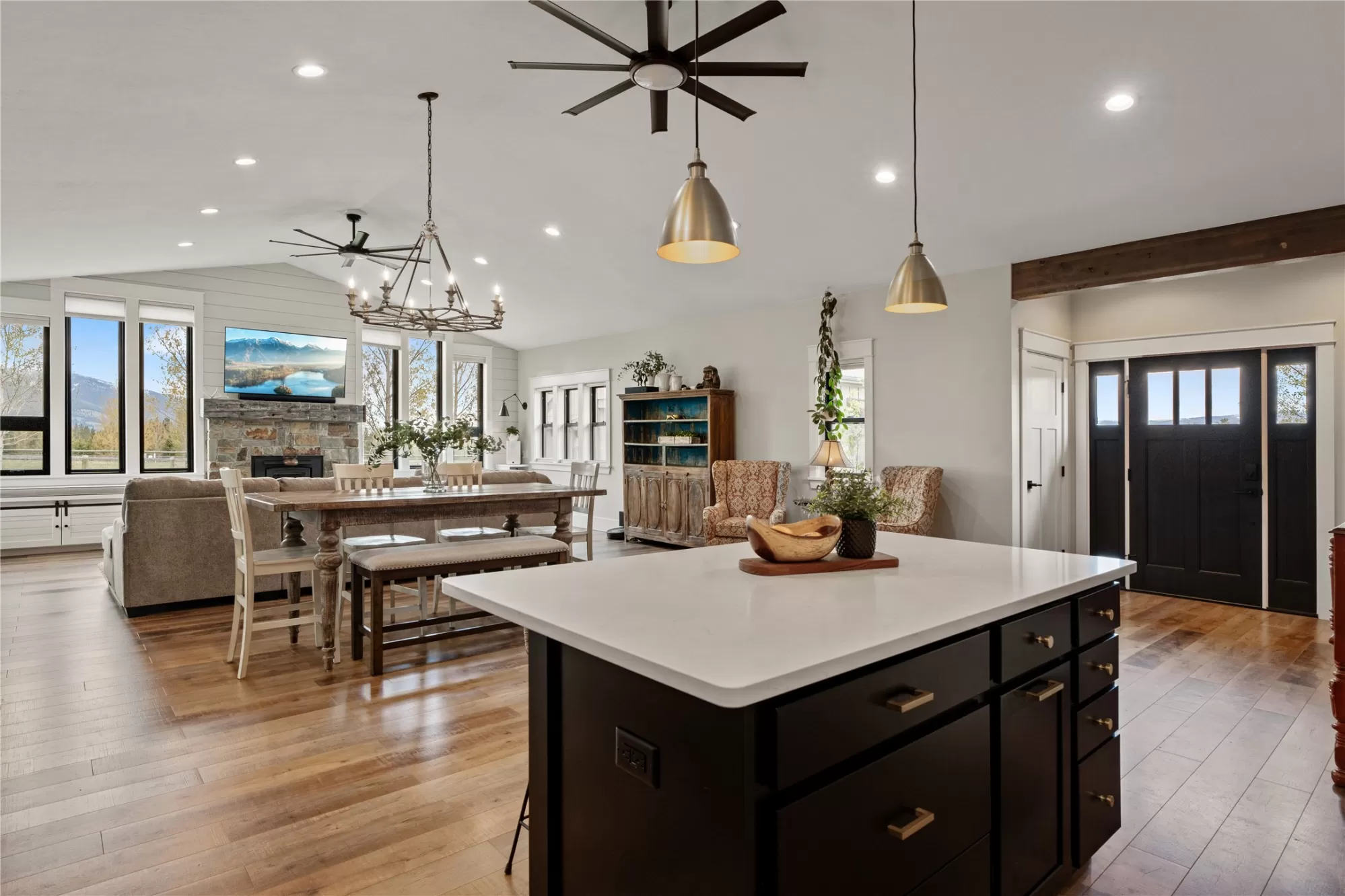 This gated, fully fenced, level 10.8 acre property, built in 2022, offers a flexible living setup with a single level main home, attached garage with upper level storage, detached shop with upper level apartment, 2 horse stalls, and the ultimate man cave and she-shed. You truly won’t want to leave! The main residence features 2 bedrooms and 3 bathrooms with radiant heated floors and a vaulted ceiling in the open concept living area. The primary suite includes a walk-in closet, dedicated craft or office space, and a well finished en suite bathroom with floor to ceiling tile. The second bedroom also has its own en suite and private entrance, creating ideal separation for guests. Large picture windows frame unobstructed views of the Bitterroot Mountains and bring in natural light throughout. The living area is centered around a wood burning fireplace, and the kitchen is equipped with stainless steel appliances. A mudroom, separate laundry area, and attached heated garage with RV height doors and upper level storage for all your holiday decor. The heated 2 car detached garage adds versatility with a lower level that includes a man cave with bar, washer and dryer hookups, work room, and half bath. Upstairs, a fully furnished 1 bedroom apartment offers a full kitchen, living area, bathroom, and spacious bedroom, ideal for guests, rental income, or multigenerational living. The she-shed has a private workspace and a 2 stall barn with runouts, arena, hay storage, heated tack room, and covered bay. Multiple fenced pastures support rotation, and the working hay field produces up to 10 tons of quality, low sugar horse hay. Irrigation is in place with a pressure line and wheel line. The acreage captures private 360 degree views of the Bitterroot Valley and includes a deer proof fenced garden with a large raised bed. Outdoor living is complete with a covered wraparound porch and a hot tub with pergola shade, creating a setting that fully takes advantage of the surrounding landscape.